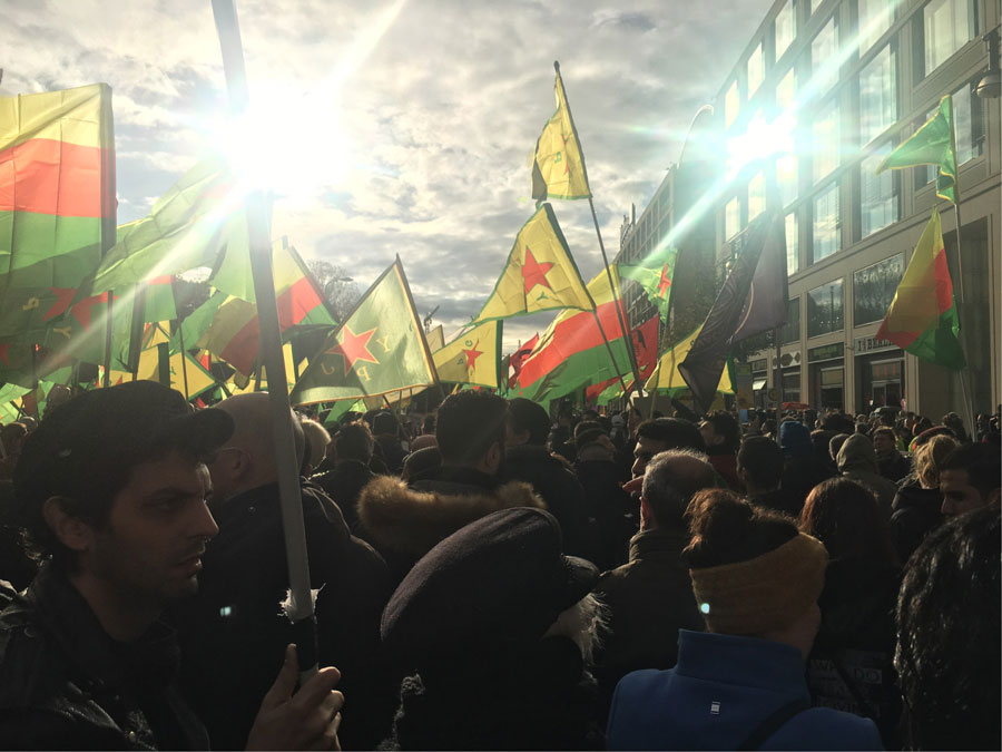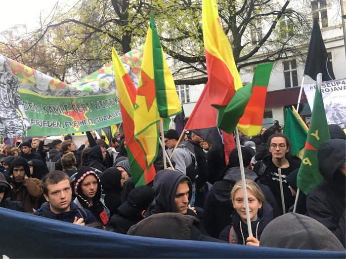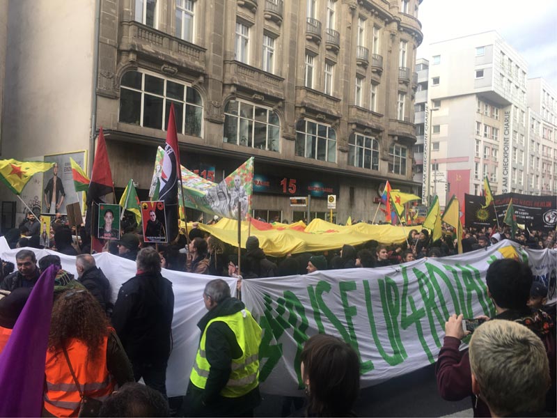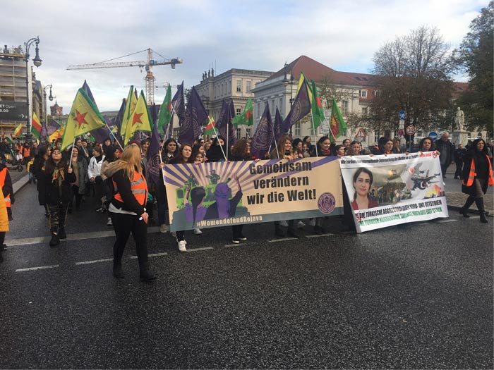 BERLİN – 2 Kasım Dünya Direniş Günü vesilesiyle Almanya’nın başkentinde RiseUp4Rojava ve Nehêle kampanyalarının çağrısıyla 2 Kasım Cumartesi günü Berlin’de büyük bir yürüyüş düzenlendi. Onlarca kurum ve binlerce kişi sokaklara çıktılar ve Potsdamar Platz’a kadar bir yürüyüş gerçekleştirdiler. TCŞ ve JCA’nın da çağrıcısı olduğu eyleme yüzlerce Kürt genci de katılım gösterdi. ‘İşgale ve katliama İzin Verme’ şiarıyla eyleme katılan gençlerdeki büyük öfke dikkat çekti.