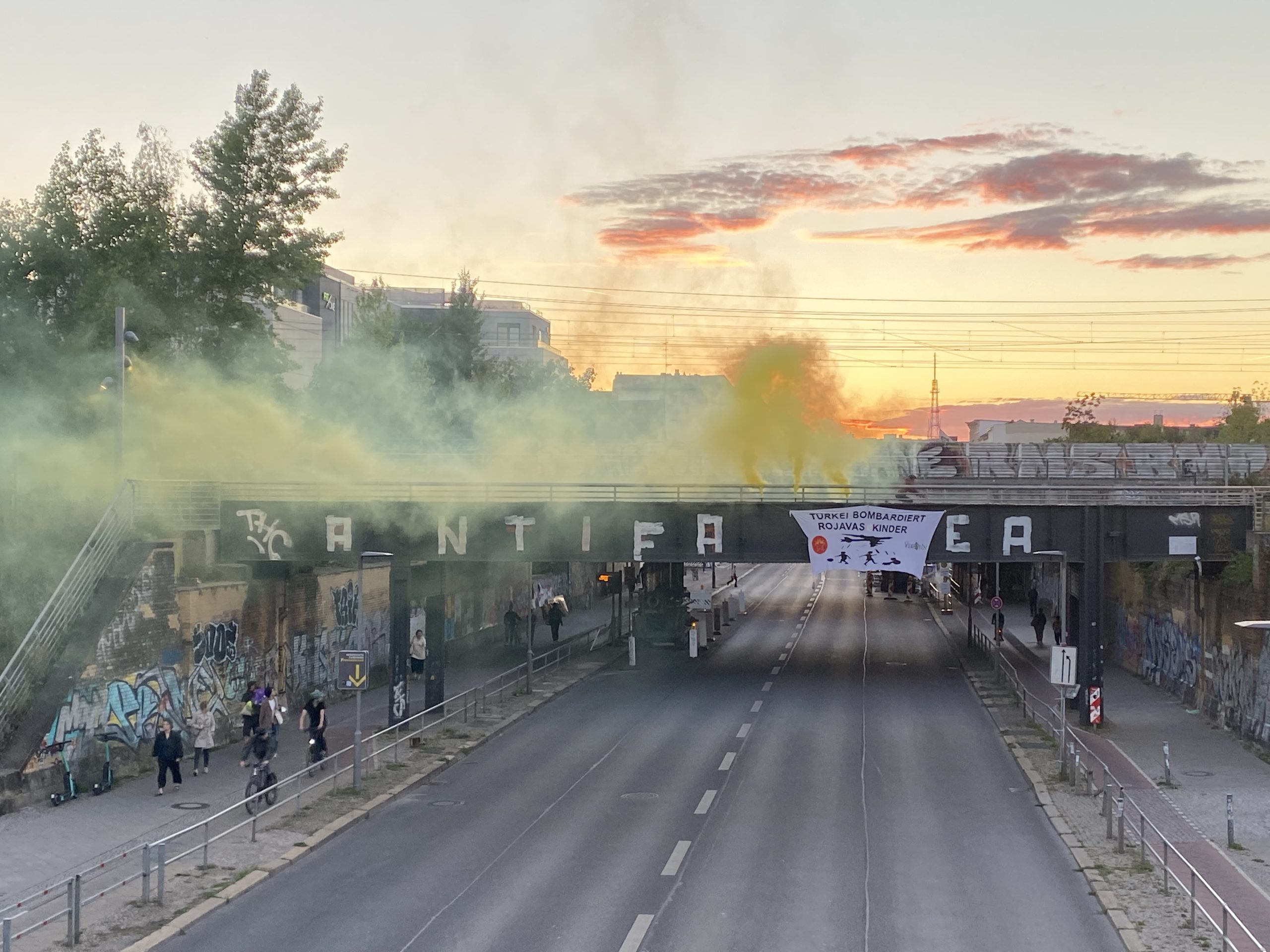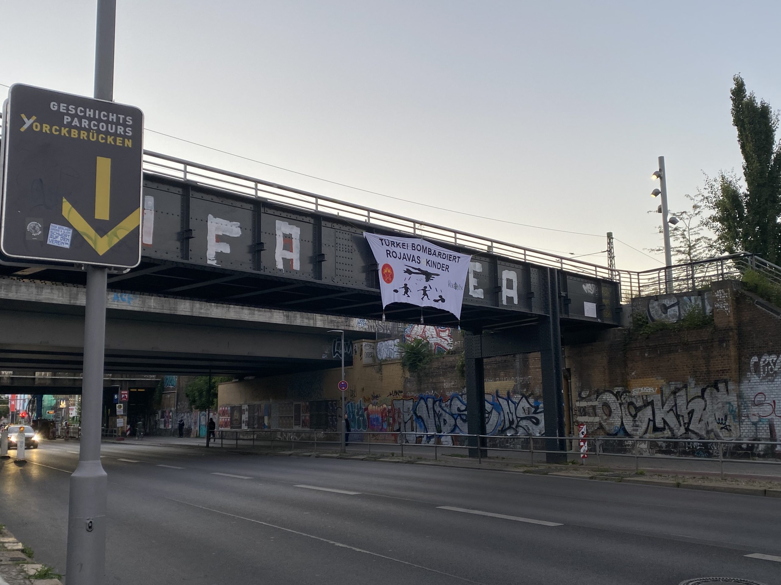 Gençler “Türkei Bombardiert Rojavas Kinder” pankartını asarak, faşist TC’nin Rojava’da gerçekleştirdiği katliamları teşhir etti. Faşist TC son olarak Maxmur, Şengal ve Rojava’ya dönük saldırılarında sivil katliamları gerçekleştirmişti.