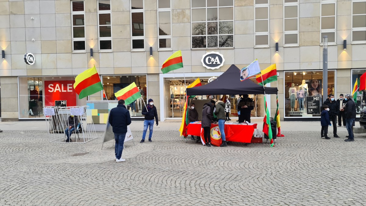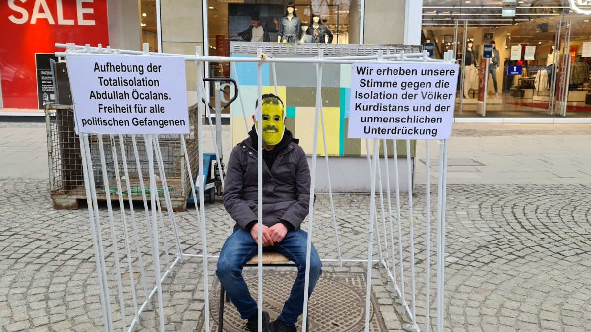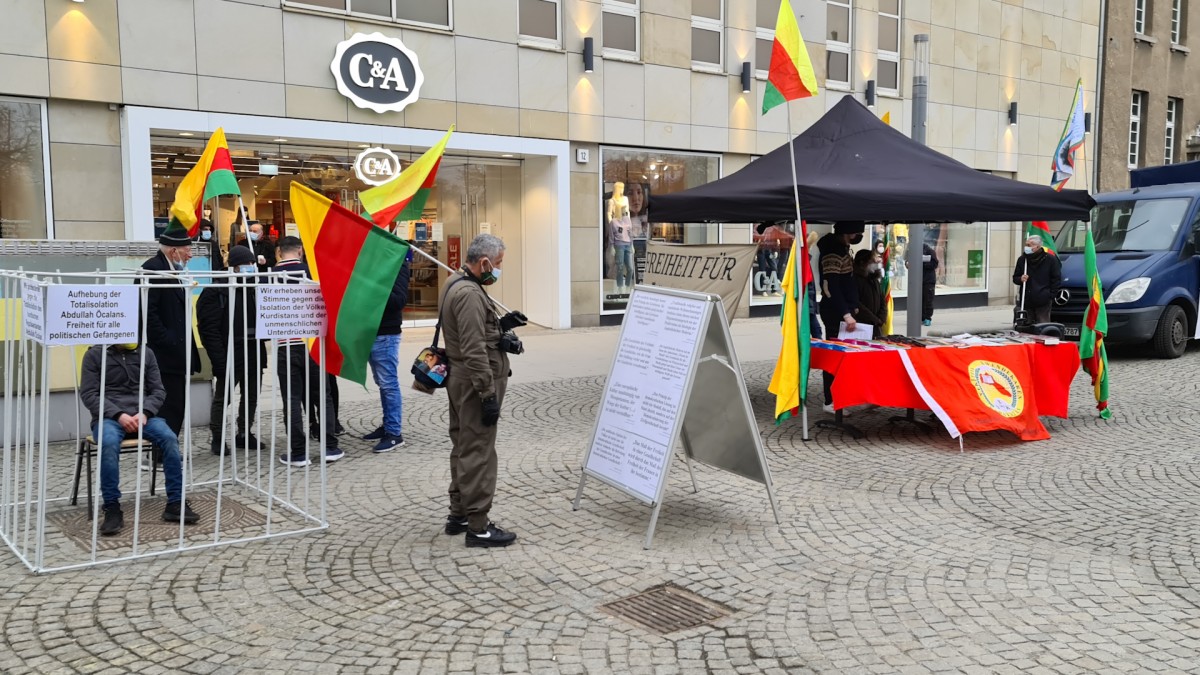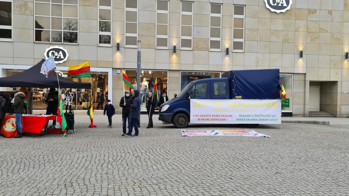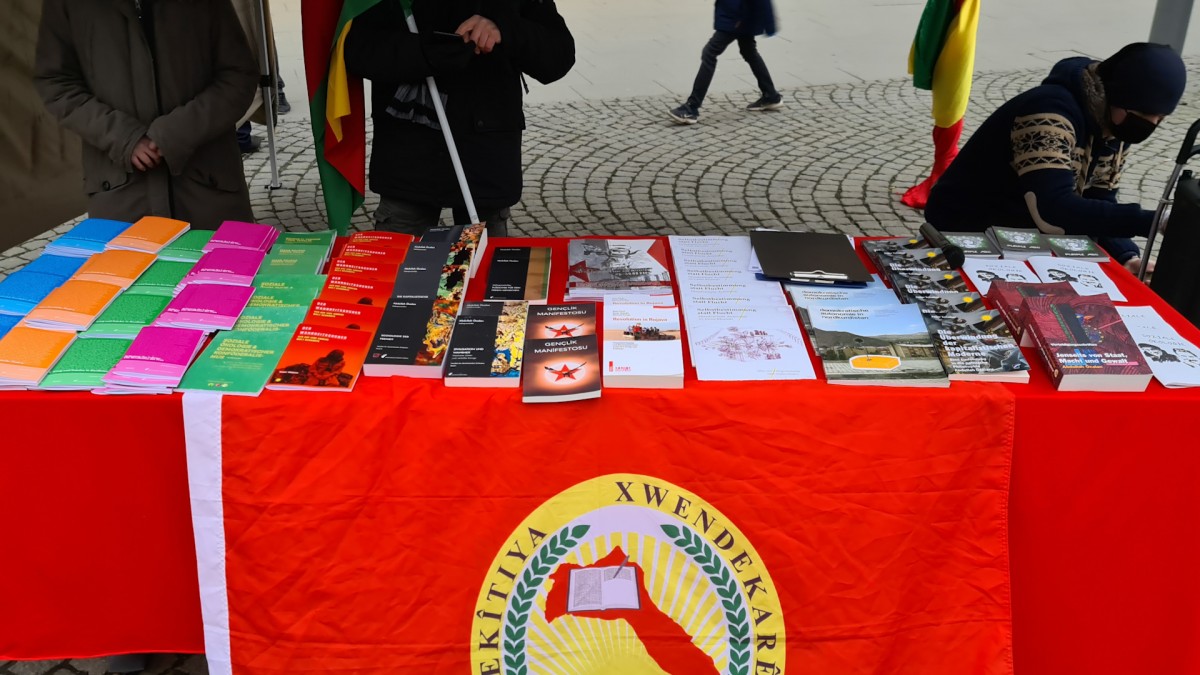 Gençler saat 15’de Rathaus Spandau’da eyleme başladı. Halklar Önderi Abdullah Öcalan’ın kitapları ve broşürlerinin konulduğu eylemde sarı, kırmızı, yeşil bayraklar ve Önder Öcalan’ın posterleri dalgalandı. Aktivistler bunun yanı sıra Önder Öcalan’ın sözlerinin bulunduğu bir pano da hazırladı.