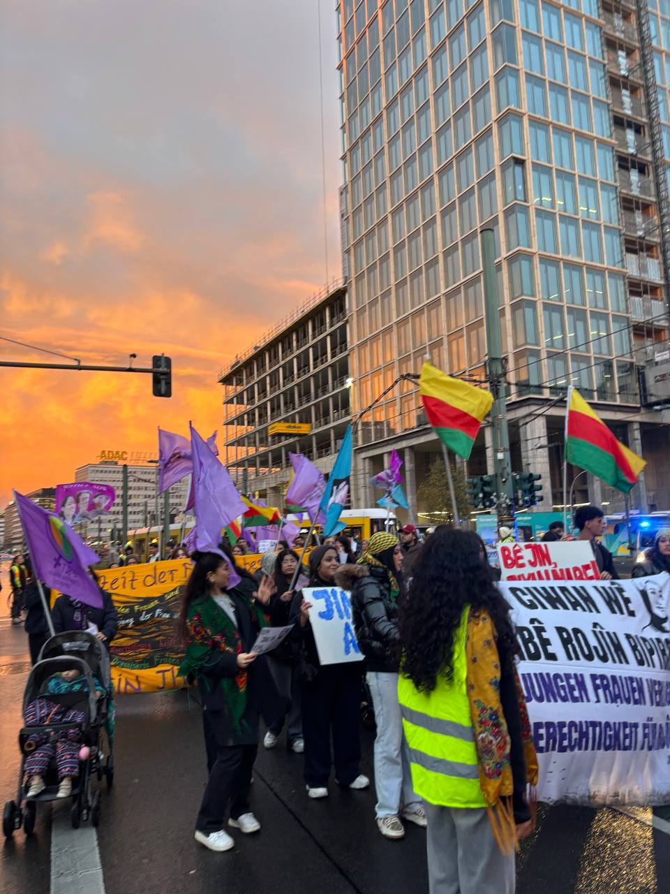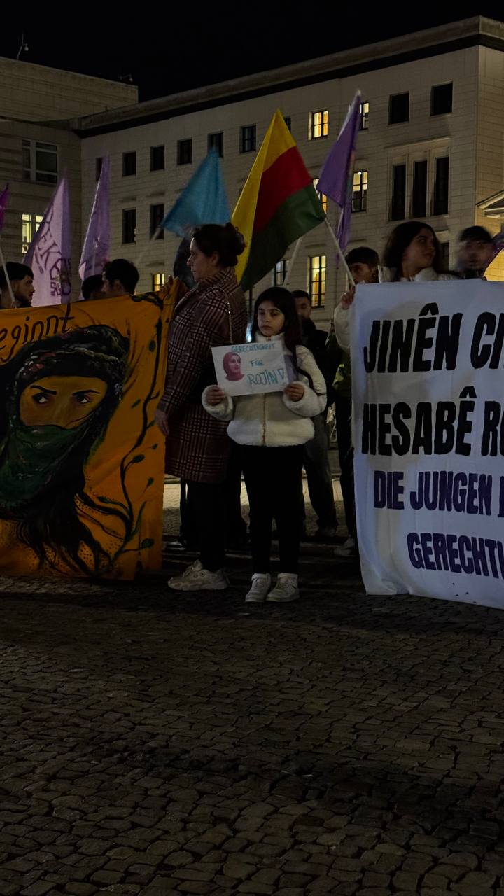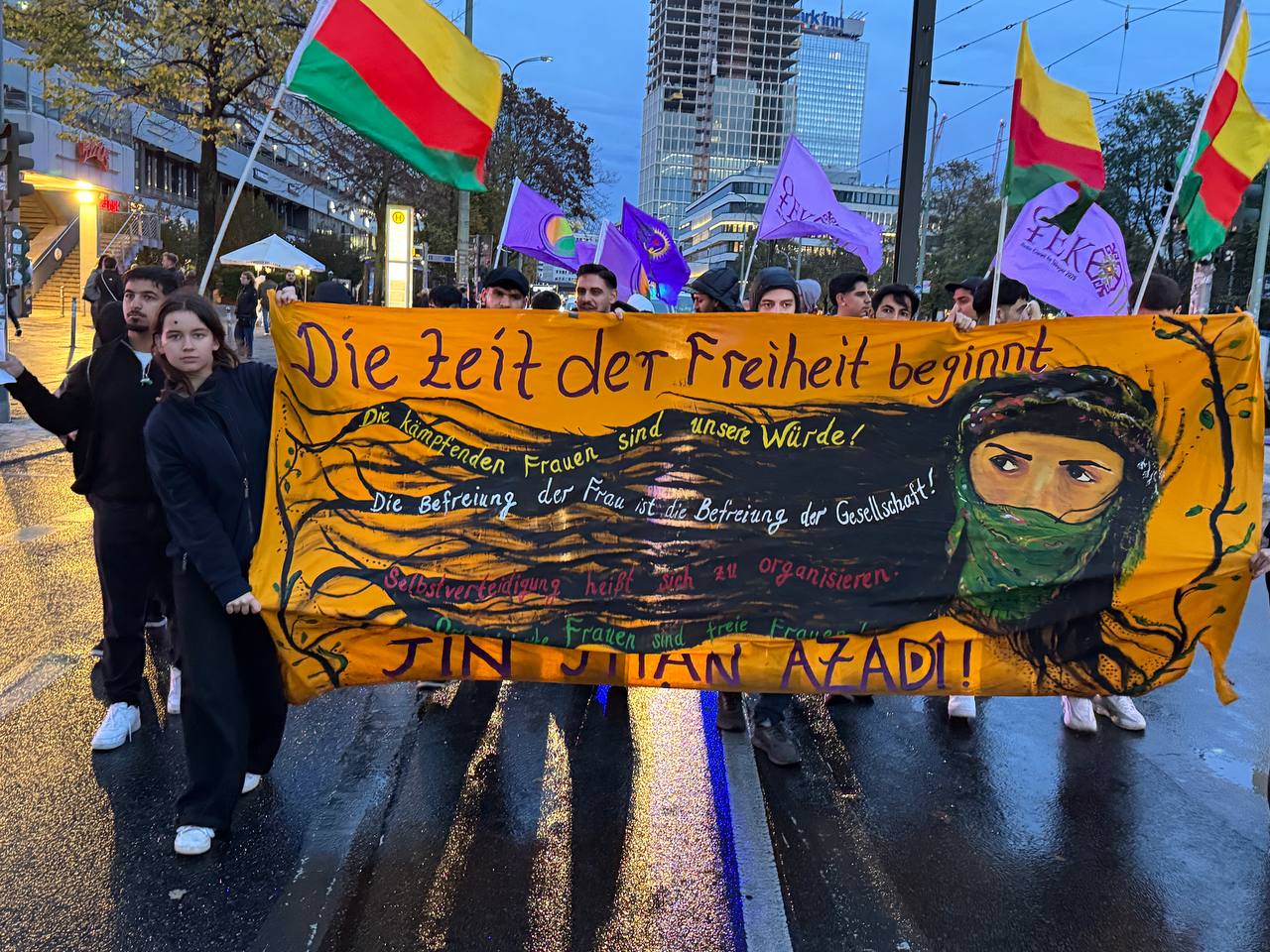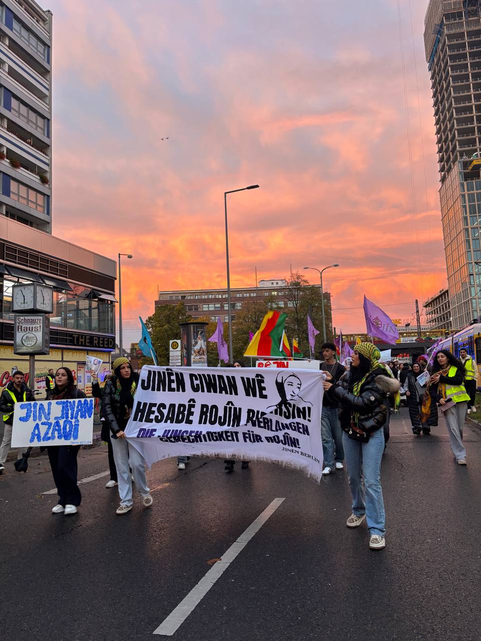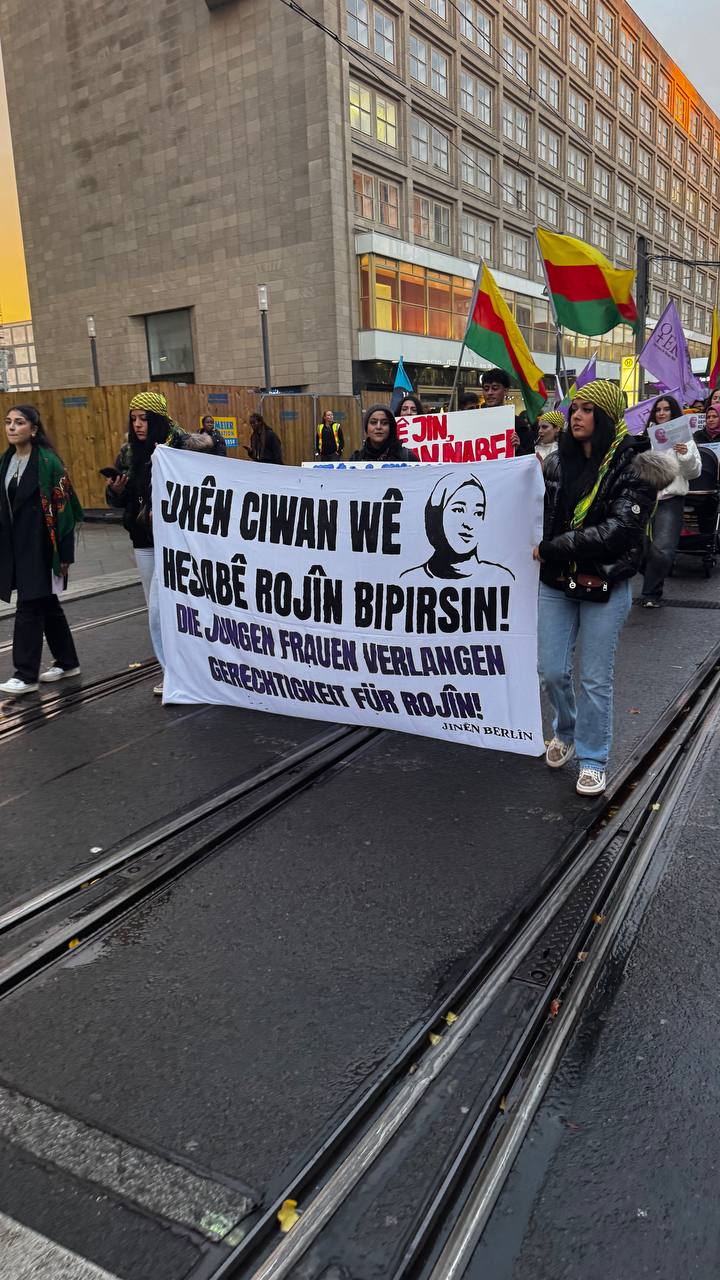 Yürüyüş boyunca taşınan Pankartta Kürtçe ve Almanca olarak “Jinen ciwan we hesabê Rojîn bipirsin (Genç kadınlar Rojîn’in hesabını sorsun) yazısı yer aldı.