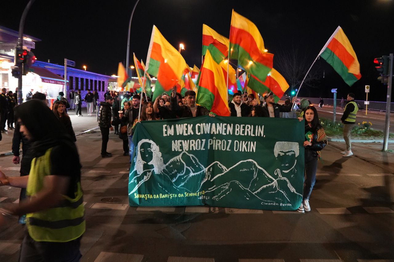 Açıklamaların ardından Osloer Straße yönüne doğru yürüyüşe geçen gençler, taşıdıkları meşaleler eşliğinde sık sık “Bijî Serok APO, Newroz Pîroz Be, Jin, Jiyan, Azadî” sloganları attı.