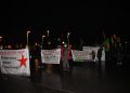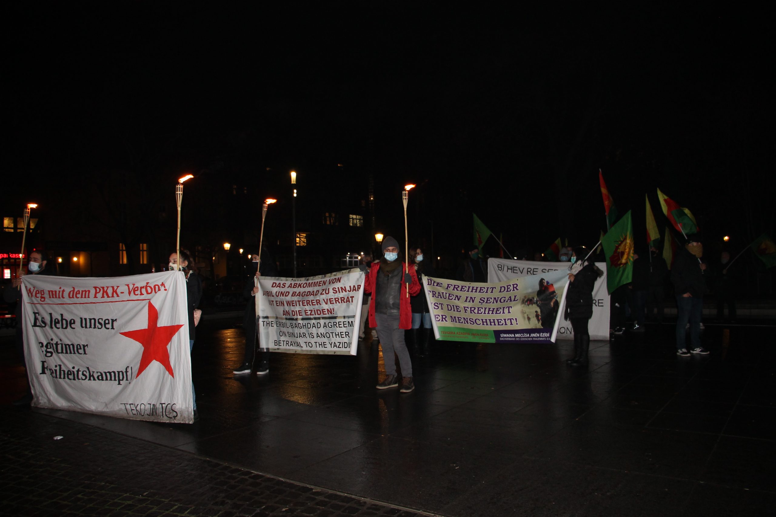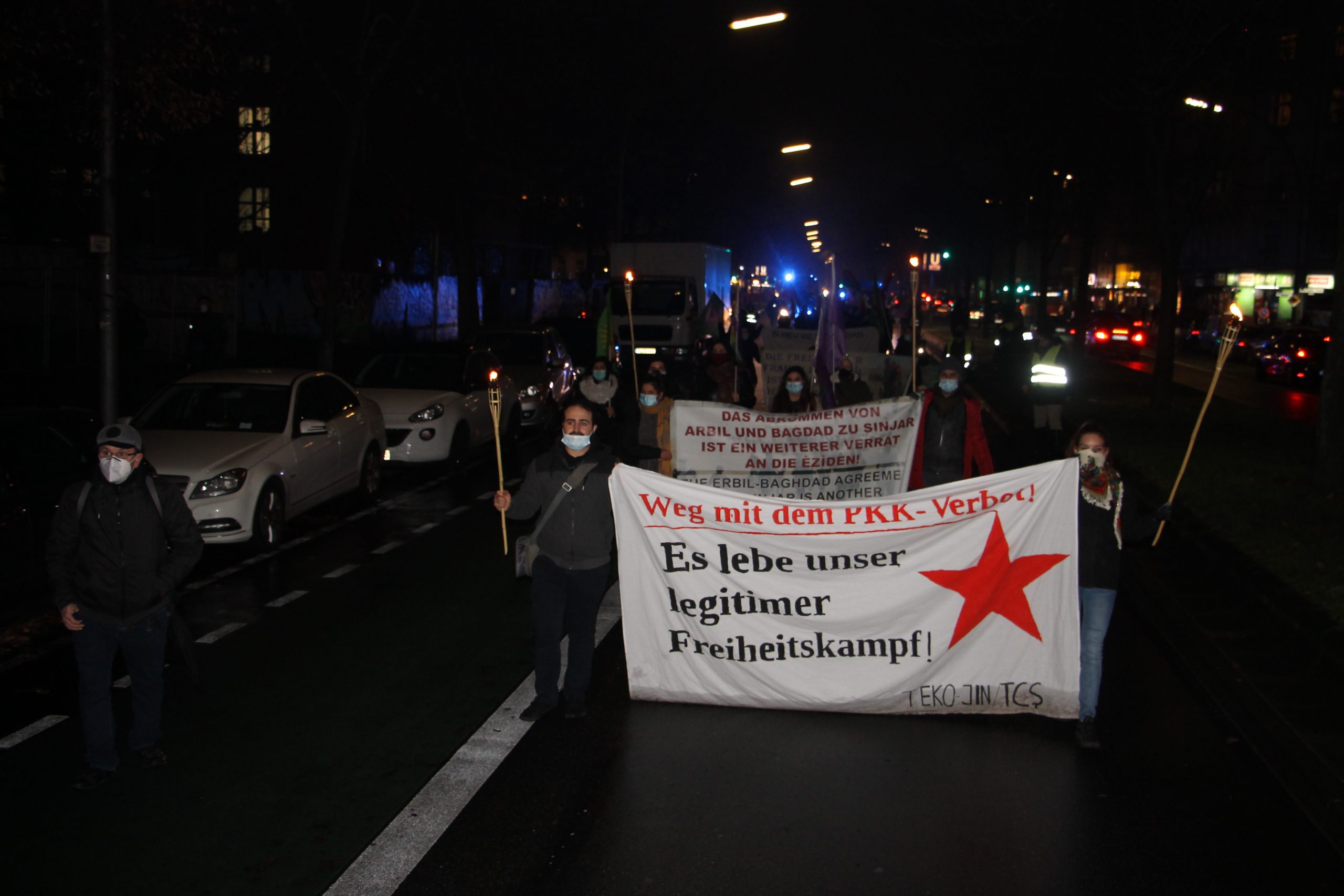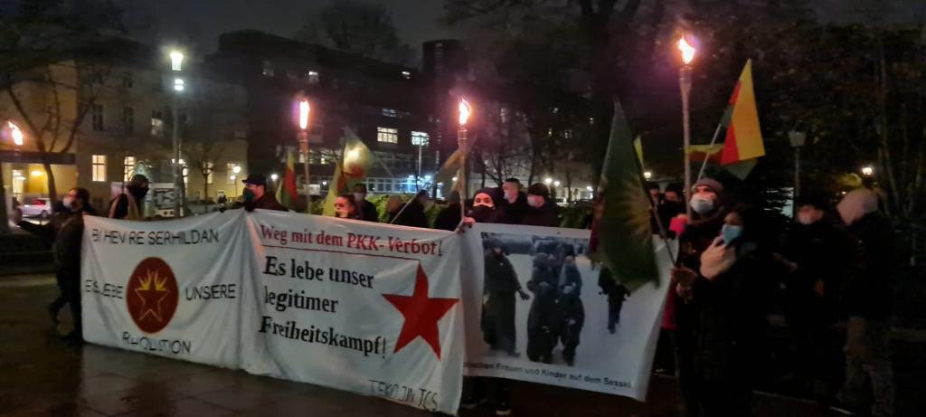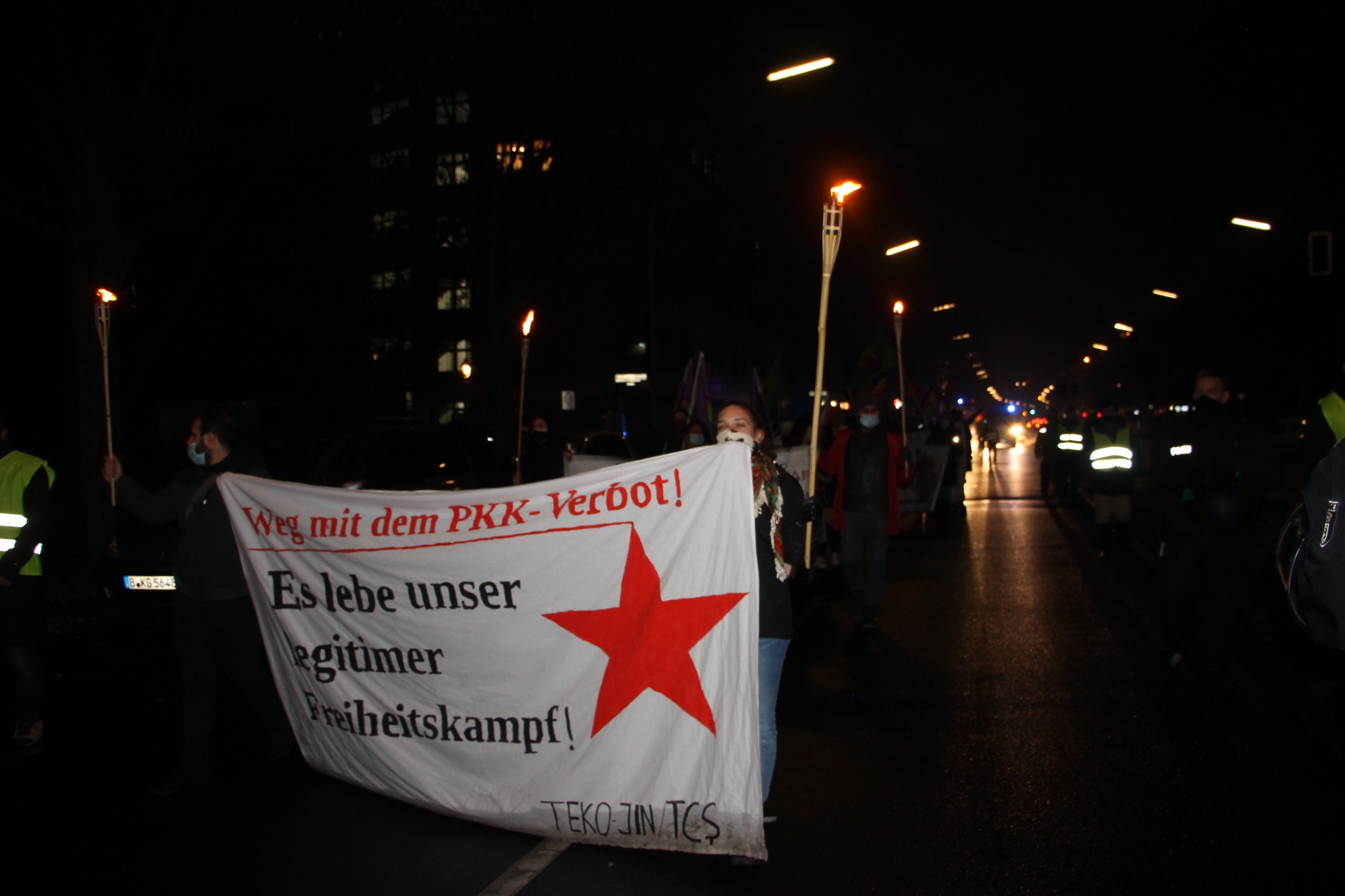 Gençlerin meşaleli yürüşünde öne çıkan konulardan biri de 1993’ten beri Alman devletinin Kürtleri kriminalize etmek için yürürlükte tuttuğu ‘PKK yasağı’ idi. “Bi Hev Re Serhildan” Es lebe unsere revolution” “Weg mit dem PKK-Verbot!” “Es lebe unser legitimer Freiheitkampf!” pankartlarının taşındığı meşaleli yürüyüşte “Bijî Serok APO”, “Gençlik APO’nun fedaisidir”, “Komutan AGİT yaşıyor PKK savaşıyor”, “Jin, Jiyan, Azadî”, “Freiheit für Öcalan, Frieden in Kürdistan”, “Terörist Erdoğan” sloganları atıldı.