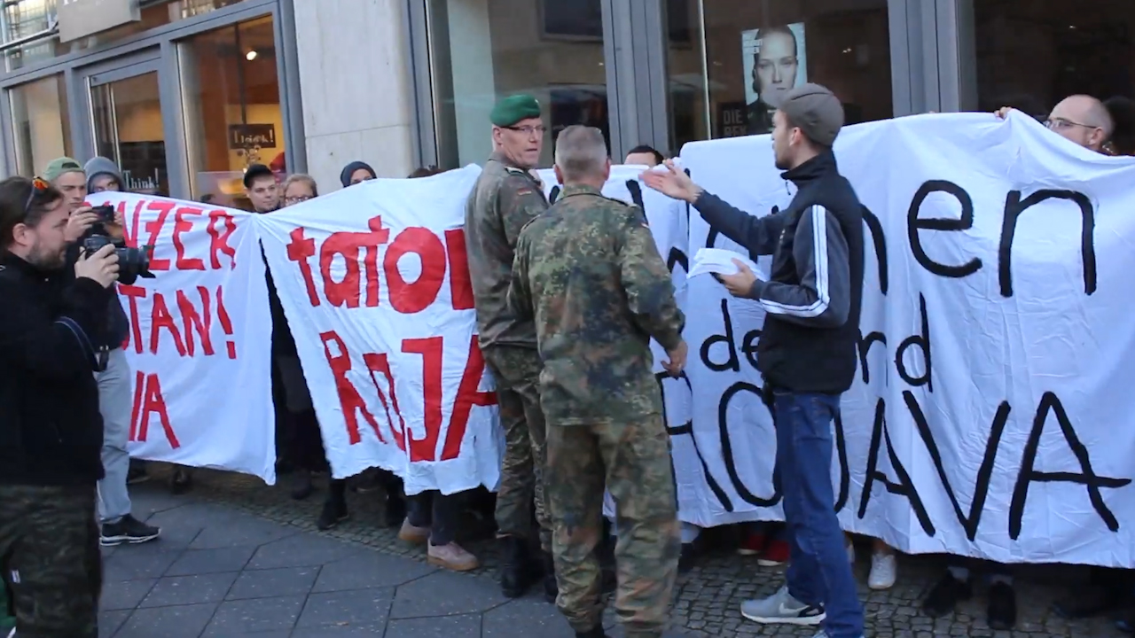 Eylemi gerçekleştiren aktivistler “Bijî YPG/YPJ” gibi çok sayıda pankart açtı ve “Alman tankları, Kürdistan’dan dışarı” sloganları attılar.