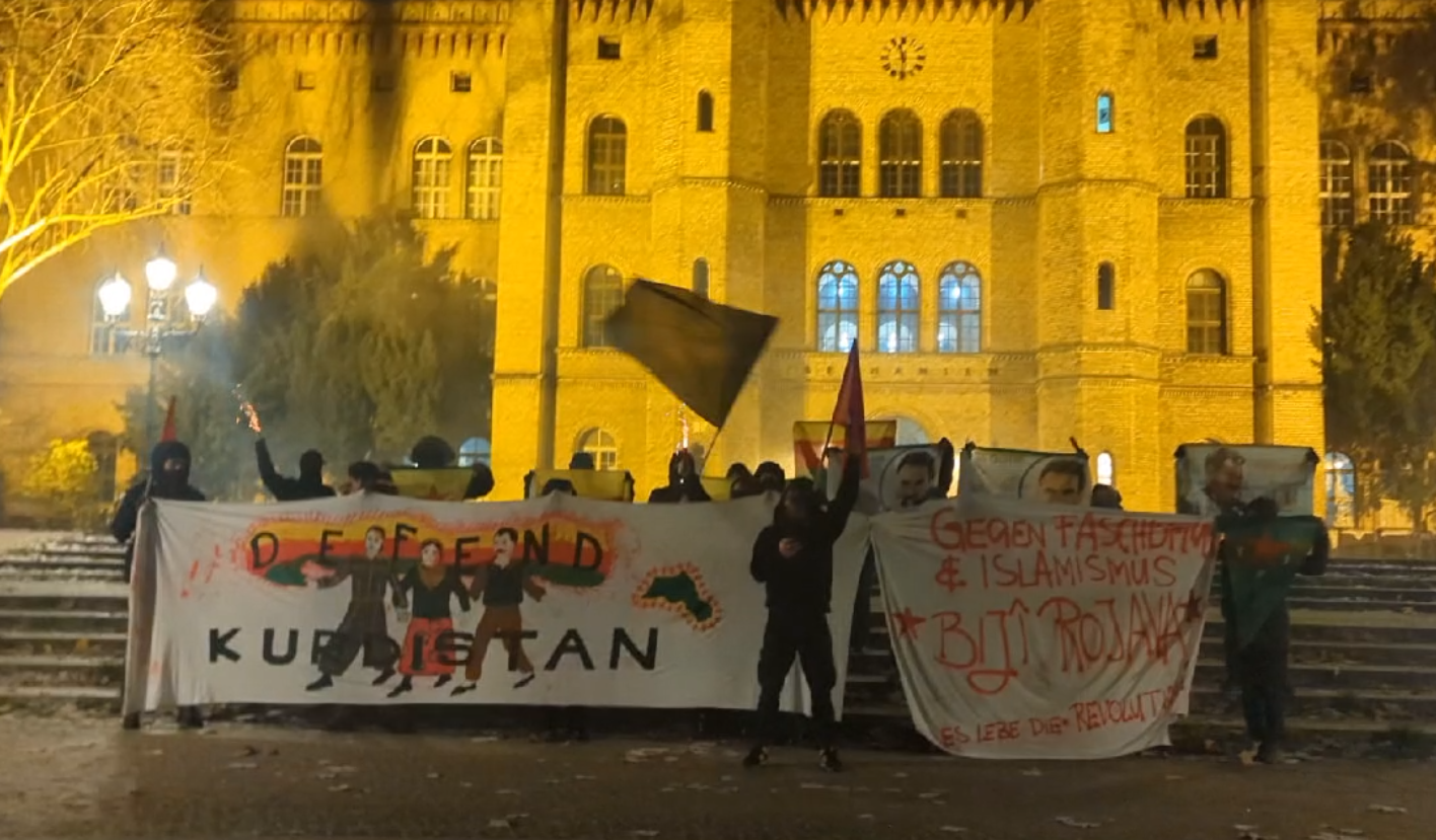 Eylemciler meşaleler ve Önder APO flamaları, YPG-YPJ bayrakları ve “Defend Kurdistan” (Kürdistan’ı savun) ve “Gegen Faschmismus und Islamismus, Bijî Rojava, Es lebe die Revolution” (Faşizm ve radikal islamcılığa karşı, Yaşasın Rojava, Yaşasın devrim) yazılı pankartlar ile yürüdü.