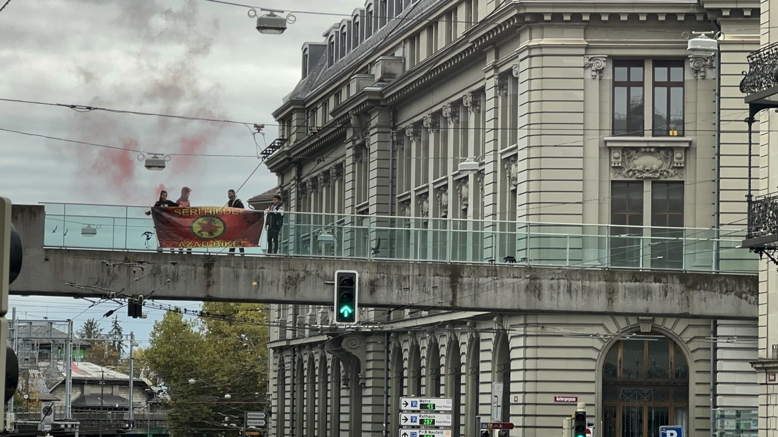 Bern Merkez Tren İstasyonunun farklı alanlarında eylem yapan gençler, Önder APO üzerinde yürütülen ağırlaştırılmış mutlak tecride dikkat çekti.