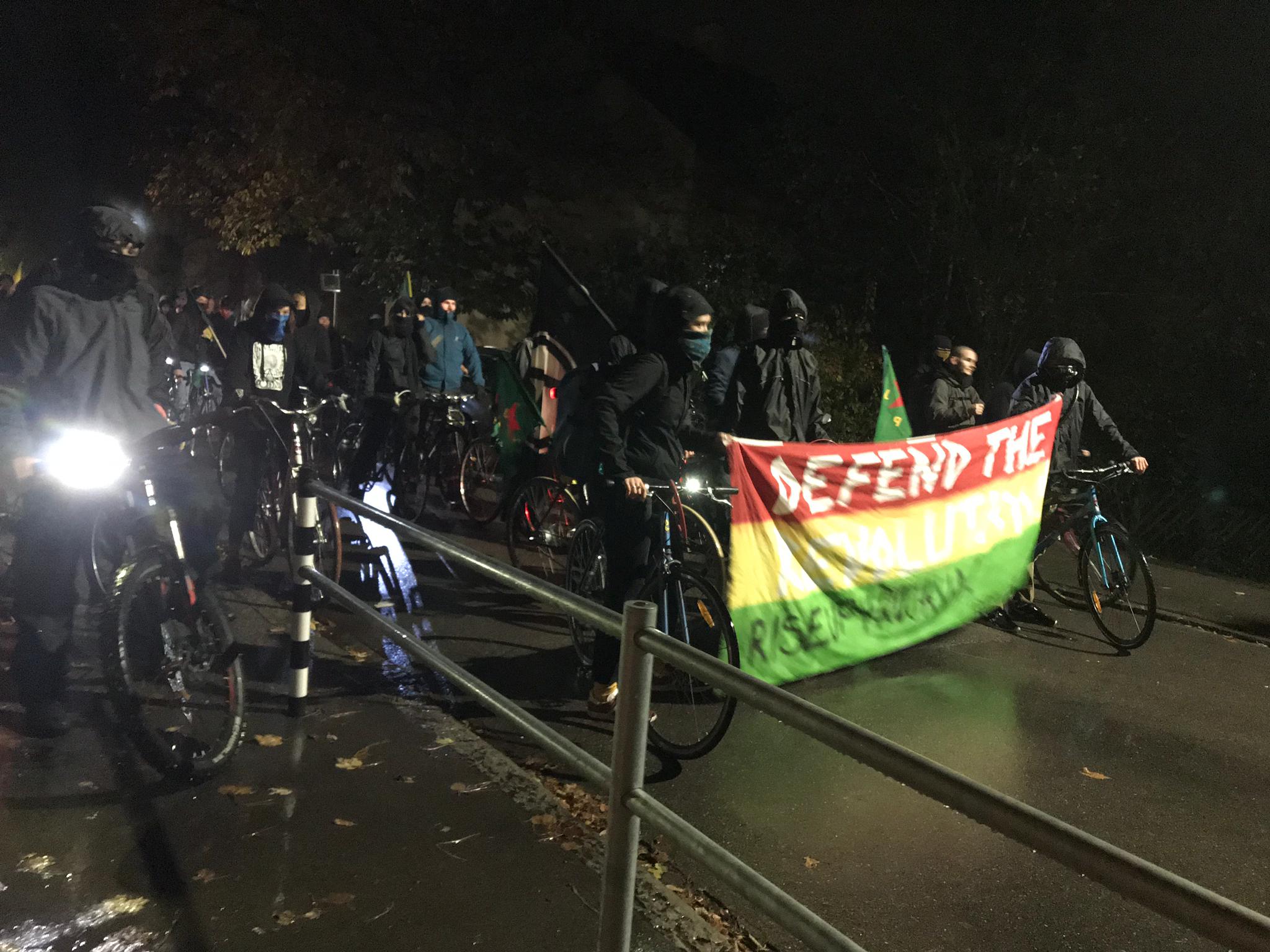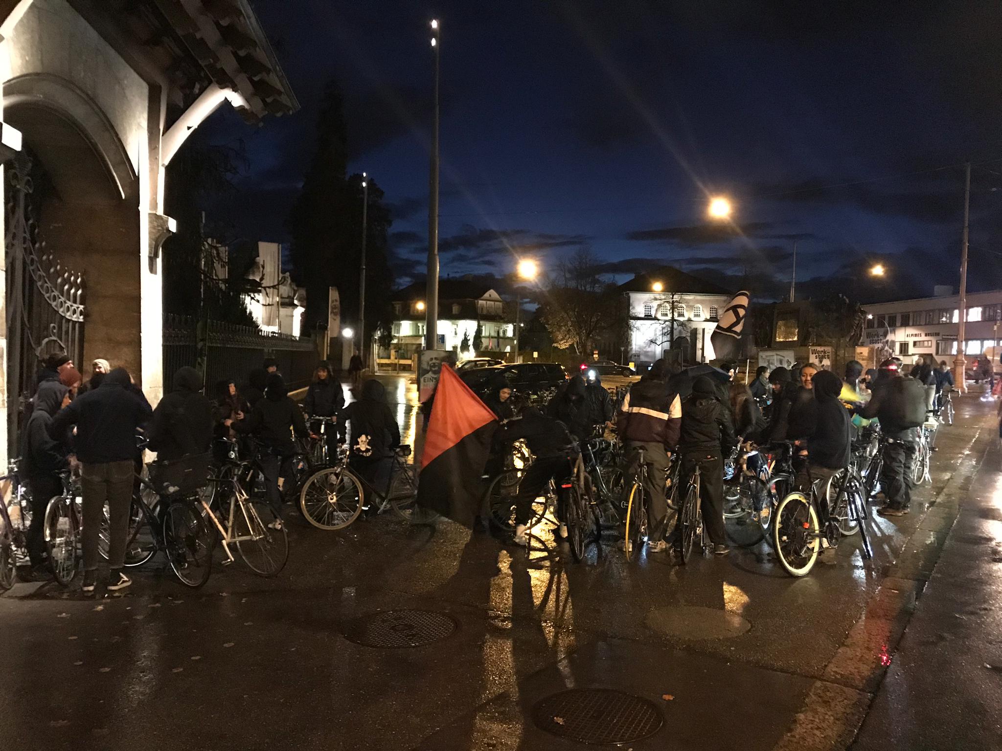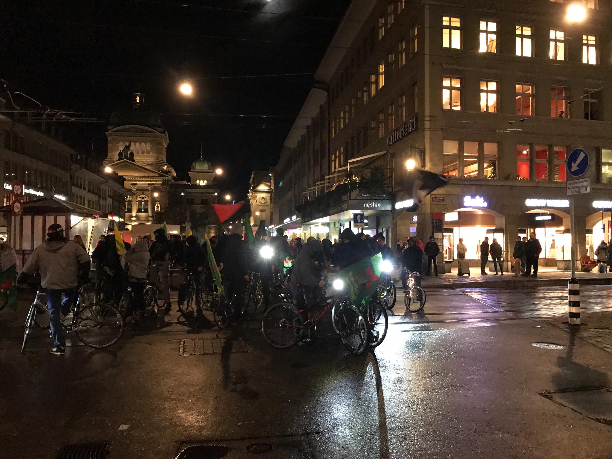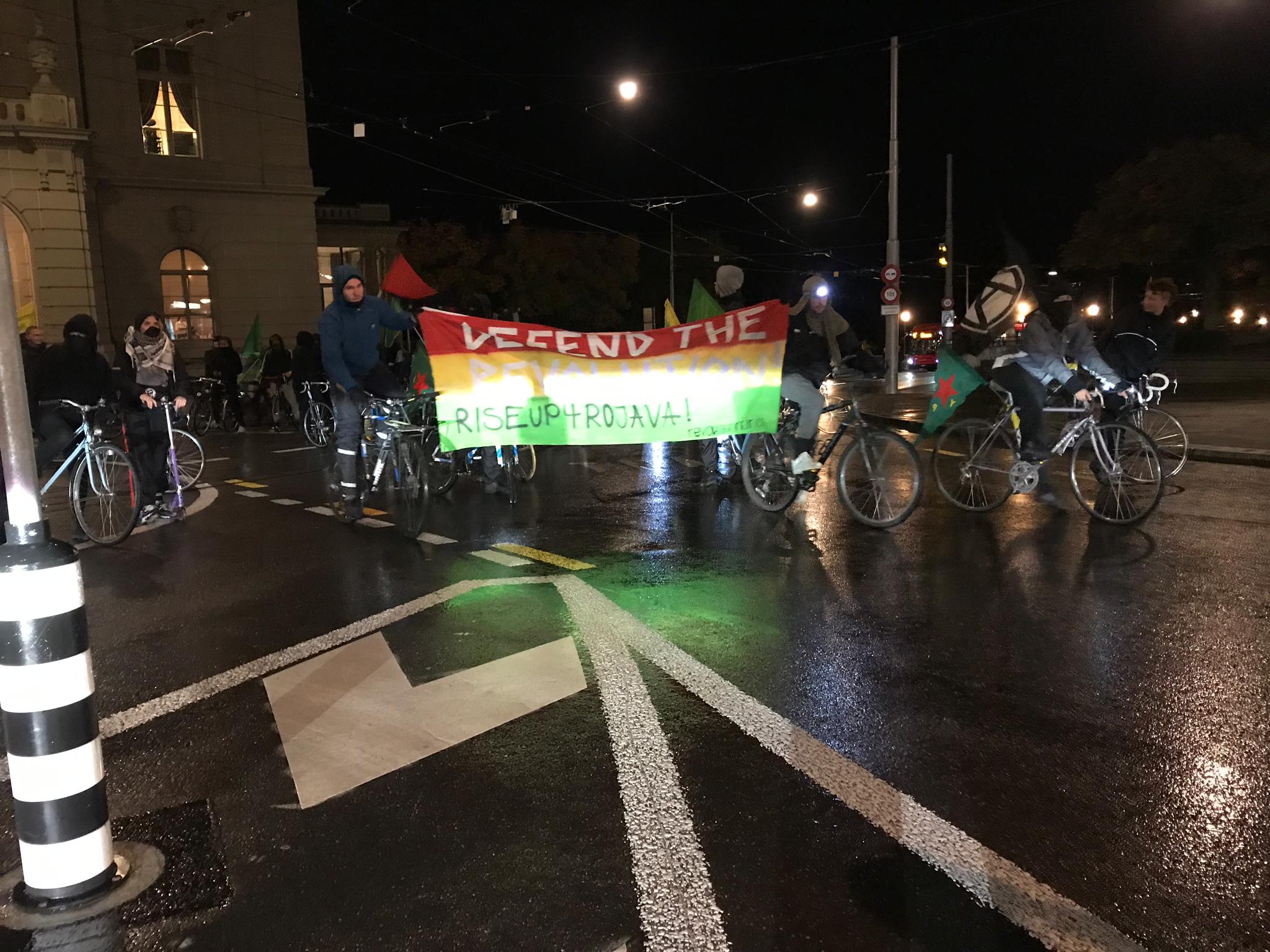 Bern’de enternasyonalist gençler öncülüğünde 5 Kasım salı akşam saat 18’de Bern Helvetiaplatz önünde bisikletler ile Rojava’daki saldırıları protesto etmek için bir araya gelen gençler, işgalci Türk konsolosluğuna doğru bisikletlet ile harekete geçti. Faşist Türk devletinin konsolosluğunun bulunduğu caddeye polisin barikat kurması ve TOMA’lar ile sokağı kapatmasıyla eylemcilerin caddeye girişi engellenmeye çalışıldı. Gençlerin caddeye girme ısrarına karşı ise polis, plastik mermi ve tazyikli su kullandı. Buradaki engellemelerden sonra gençler, İsviçre Federal Parlementosu’na doğru bisikletleriyle gitti ve burada Rojava işgaline dair açıklama yaptı. Tekrar şehir merkezindeki caddelerde direniş sloganları ile harekete geçen gençler, Bern’in en işlek caddesinde trafiği kapattı. Burada bir açıklama yapan gençler, slogan ve marşlarla eylemerini sonlandırdı.