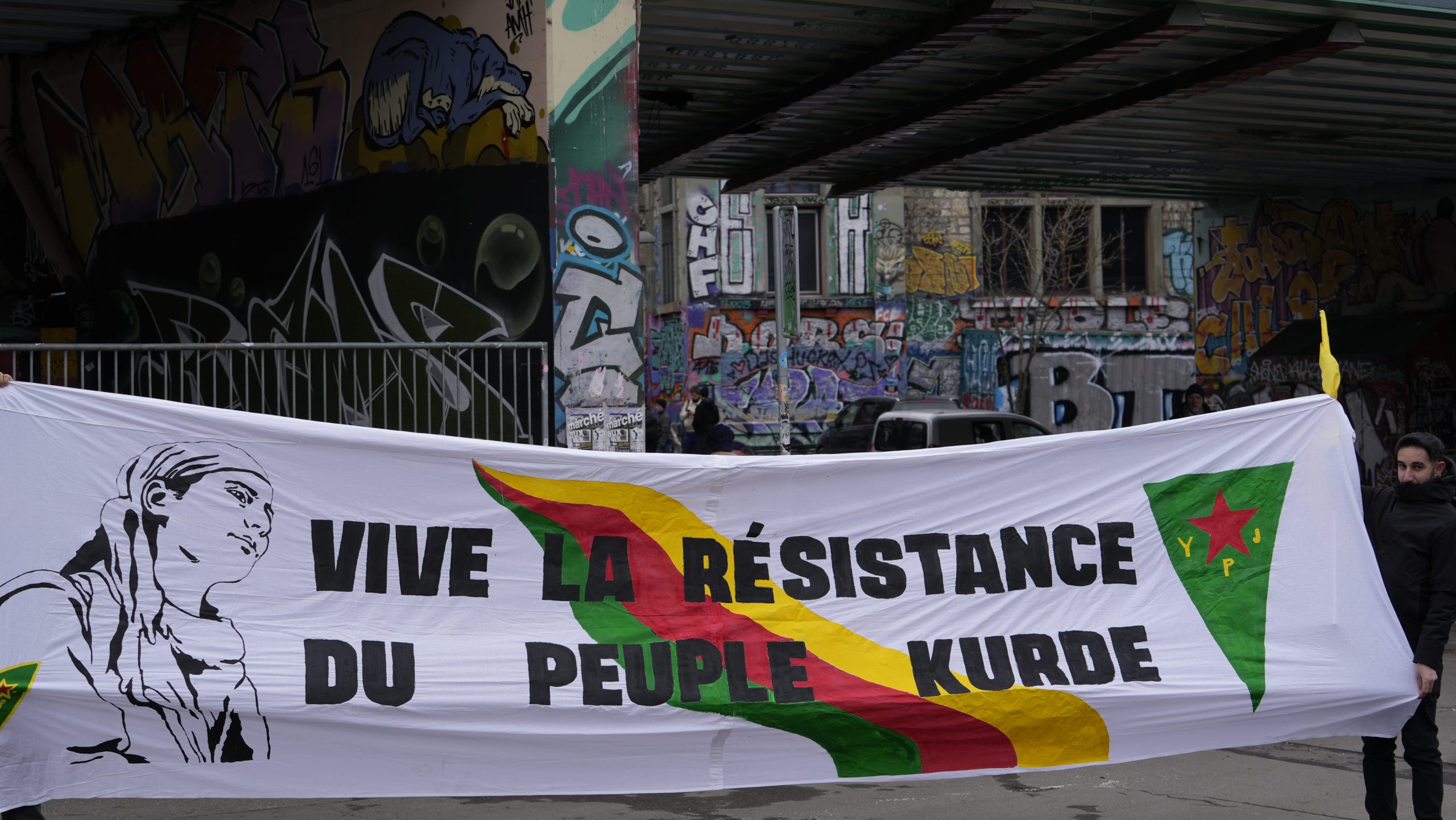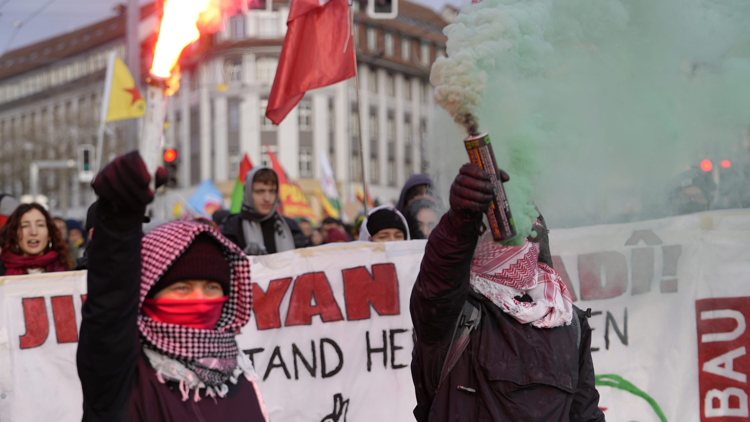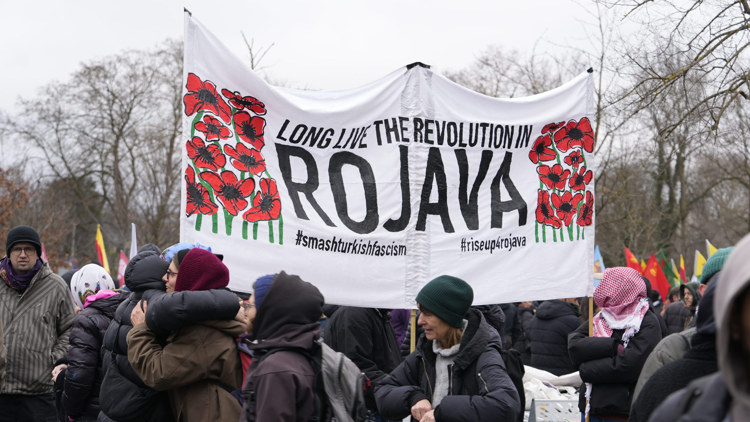 Kitle sık sık, “Biji Berxwedana Rojava”, “Yek e yek e Kurdistan yek e”, “Terörist Colanî”, “Rojava Rojhilat e Kurdistan yek welat e” sloganlarını attı. Eylem boyunca Almanca ve Fransızca sloganlar da yükseldi.