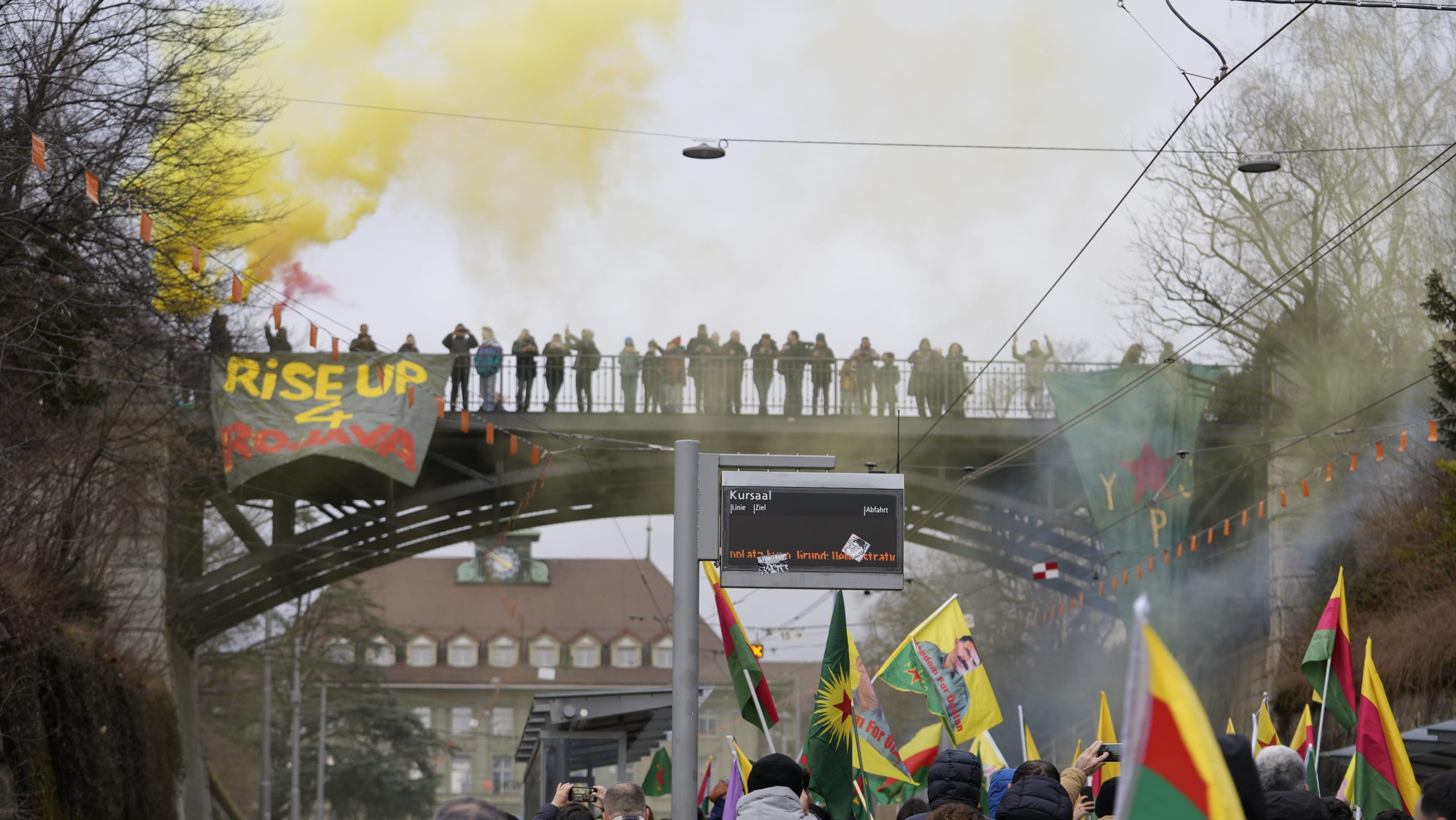 Bern Parlamentosu önünde 13 gündür nöbet eylemi sürdüren grup da sloganlarla alana geldi. Kitle, nöbet tutanları alkışlarla karşıladı. Nöbet eylemi adına konuşan Kürt siyasetçi Nejdet Atalay, nöbet kararının halk inisiyatifiyle alındığını belirterek, destek sunan herkese teşekkür etti.