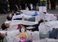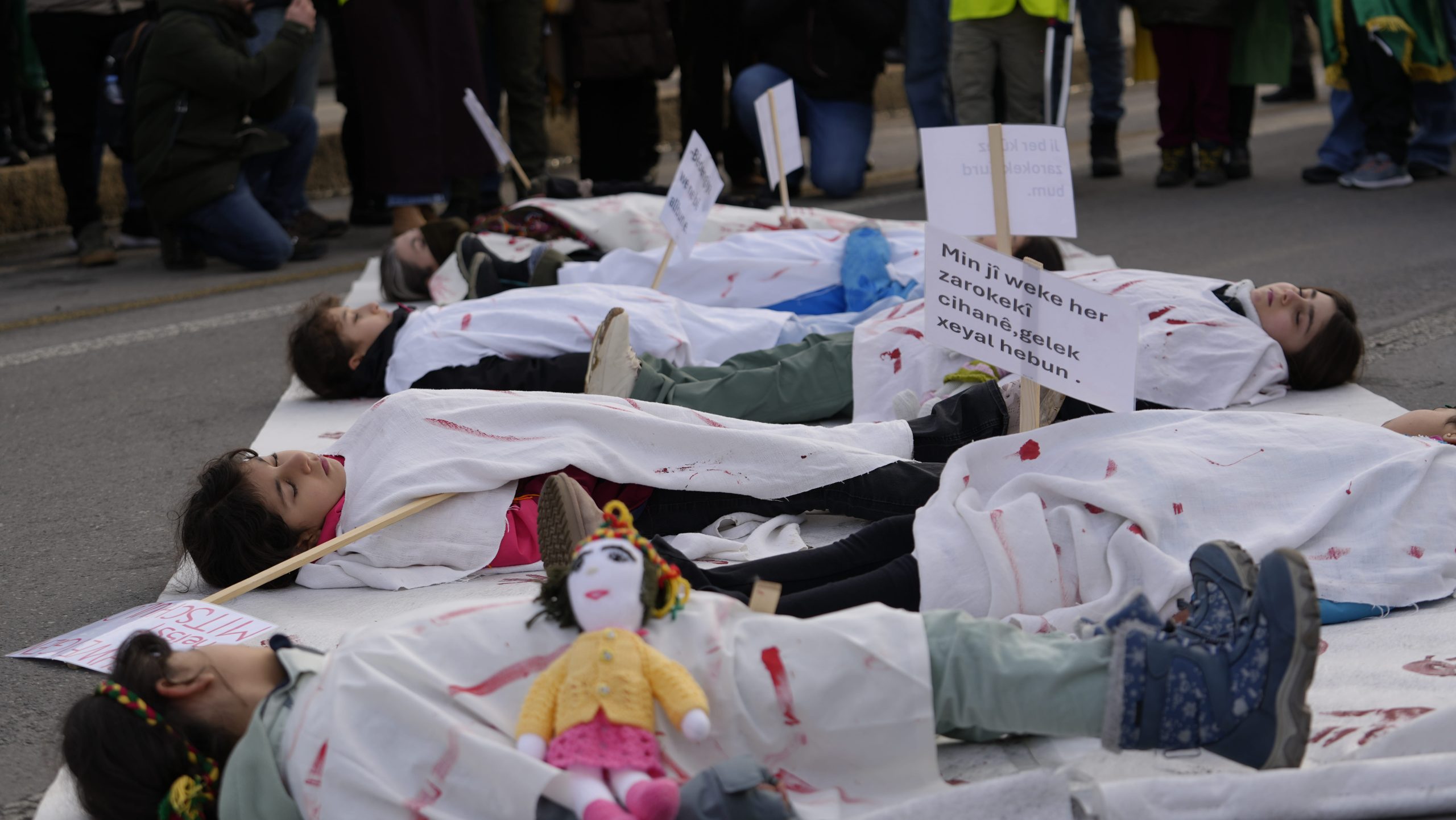 Konuşmaların ardından kitle yürüyüşe geçti. Yürüyüş boyunca Rojava’ya yönelik saldırıları anlatan bildiriler dağıtıldı. Güzergâh boyunca çok sayıda İsviçreli de eylemi alkışlarla selamladı. Lorraine Köprüsü’ne ulaşan kitle burada oturma eylemi gerçekleştirdi. Kanlı kefenler giyen çocuklar yere uzanarak Rojava’da katledilen çocuklara dikkat çekti.