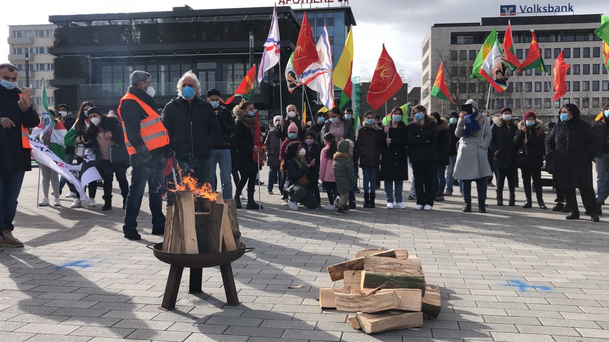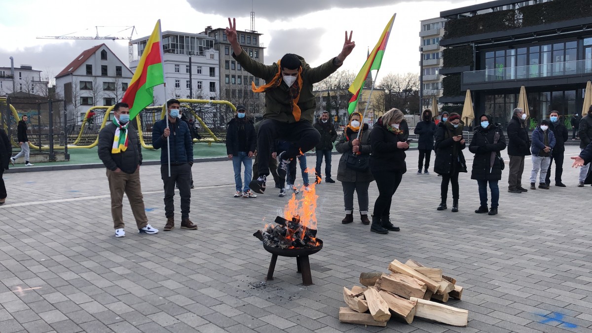 Almanca ve Kürtçe sloganlarla Newroz’u kutlayan halk, attıkları ‘Bijî Serok APO’, ‘Es Lebe Ocalan’ sloganlarıyla Önder Öcalan’a özgürlük taleplerini dillendirdiler.