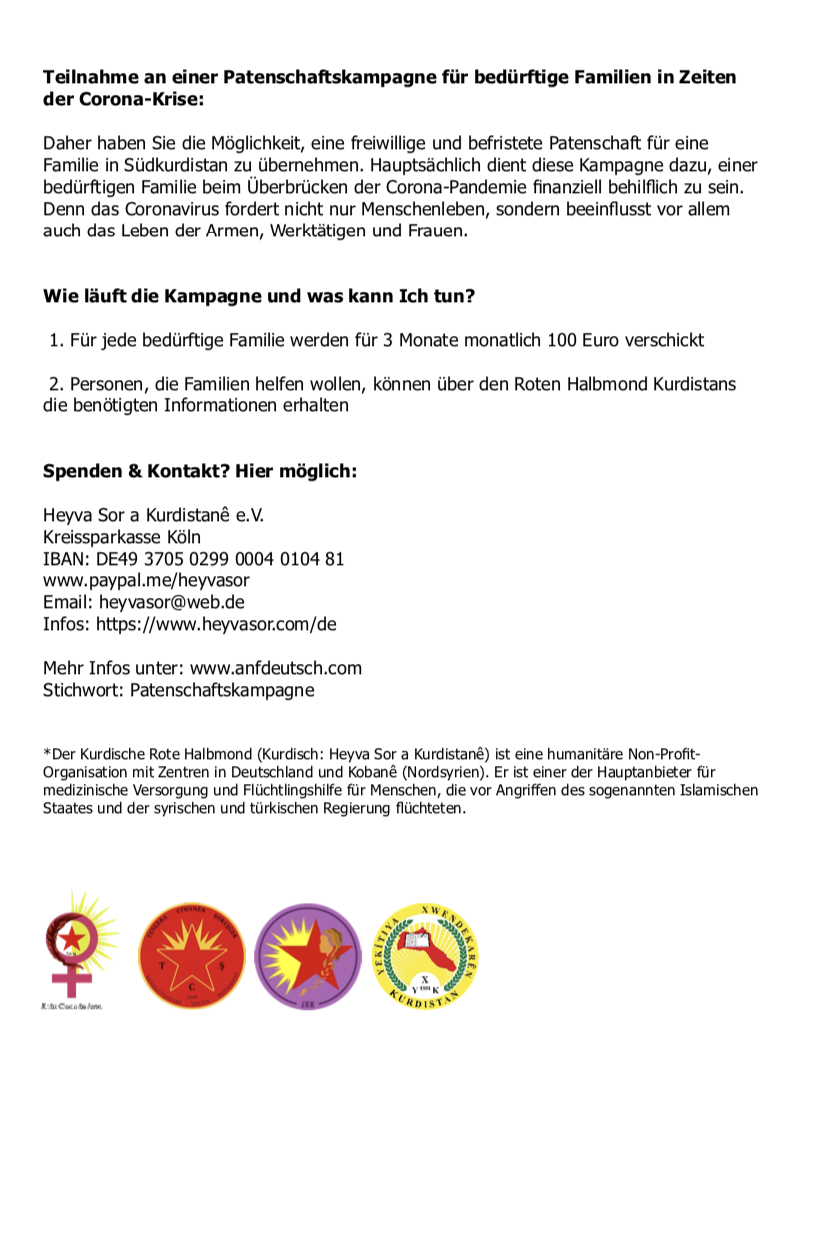 Kardeş aile kampanyası Heyva Sor a Kurdistanê üzerinden yürütülmektedir. Eylem önümüzdeki günlerde tekrar gerçekleştirilecektir.