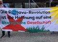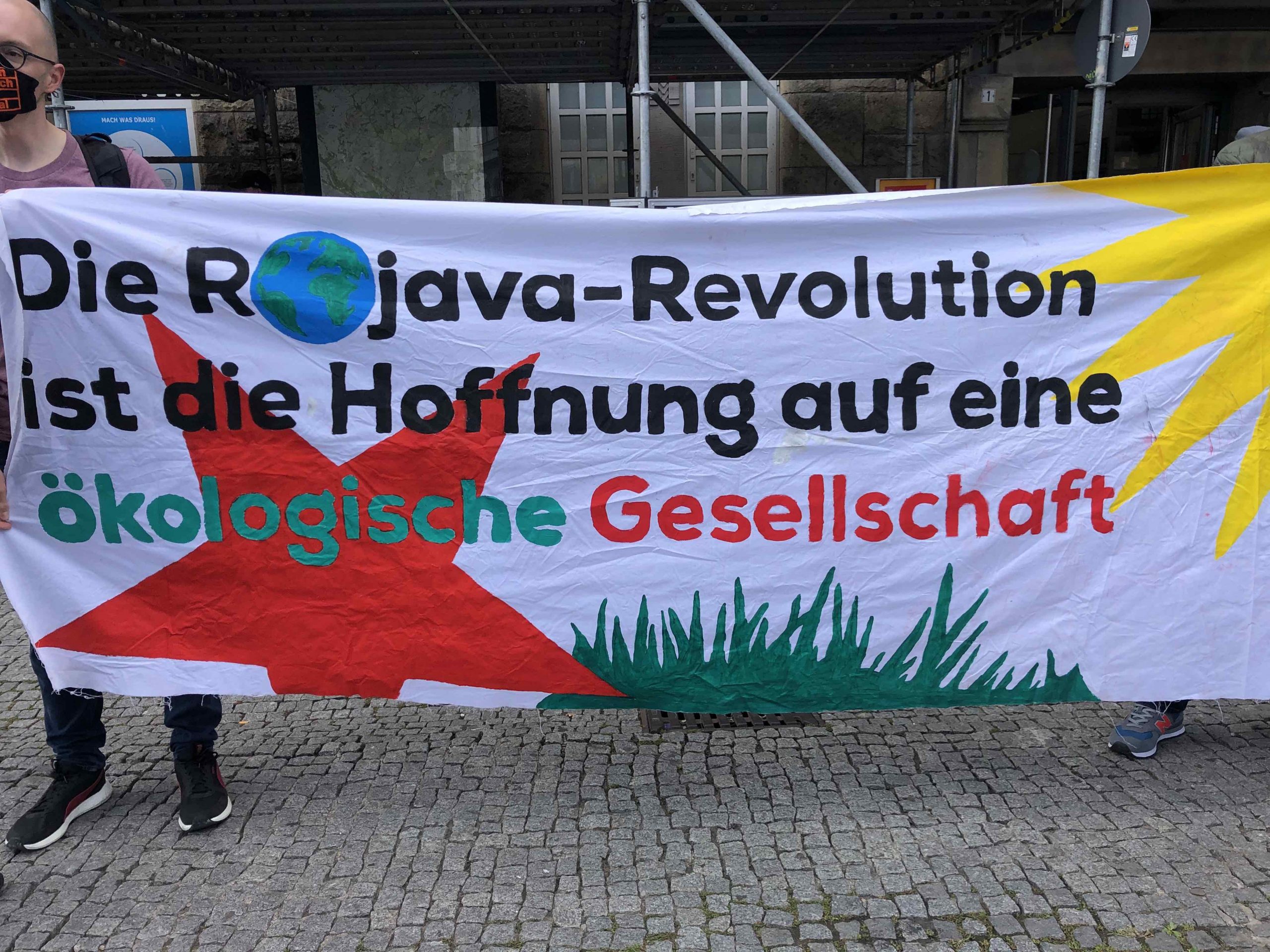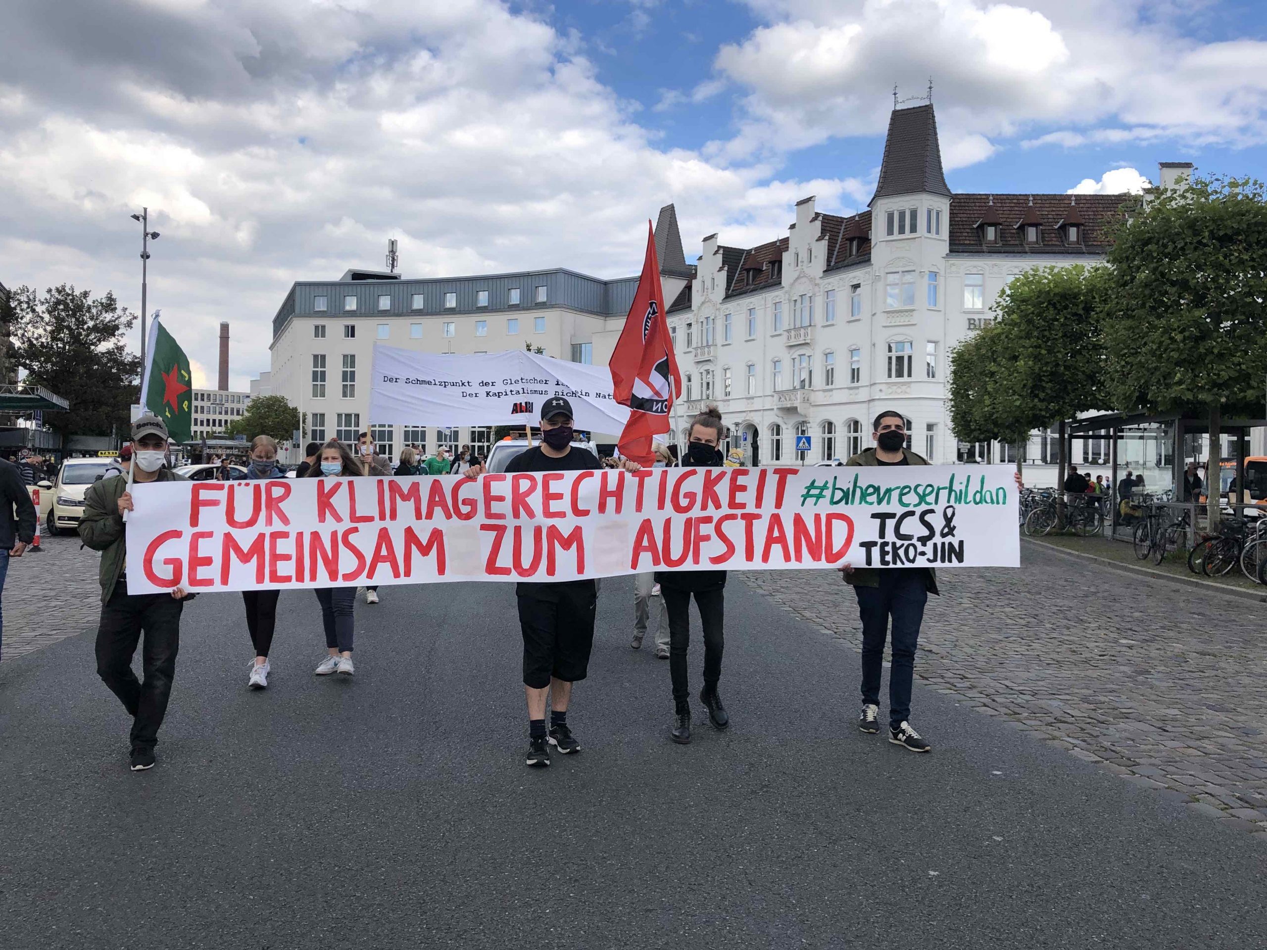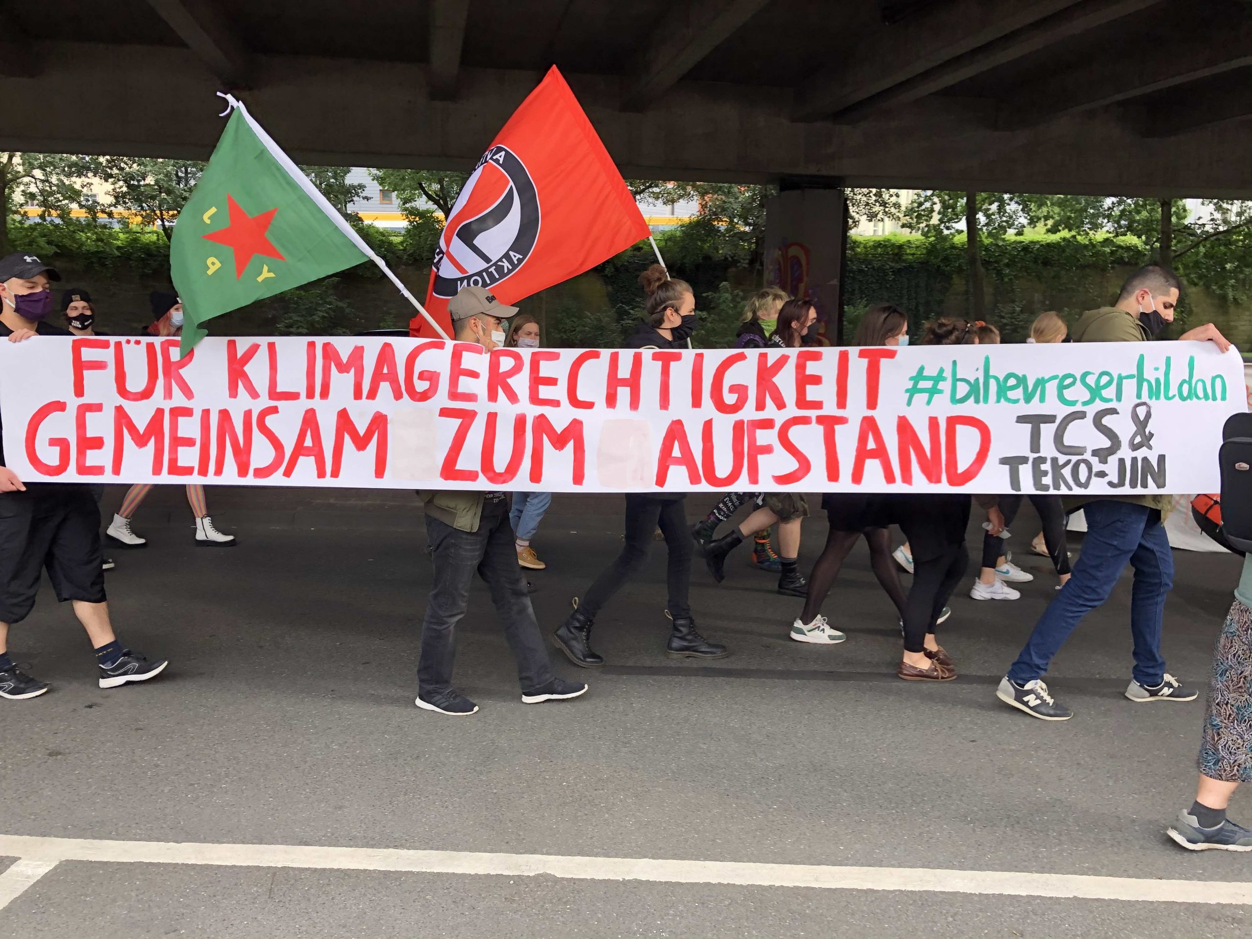 Aynı zamanda katılımcılar “Bielefeld’den Rojava’ya – İklim Koruması Antifa demektir” sloganını taşıyan pankartlar ile Rojava Devrimini selamladı.