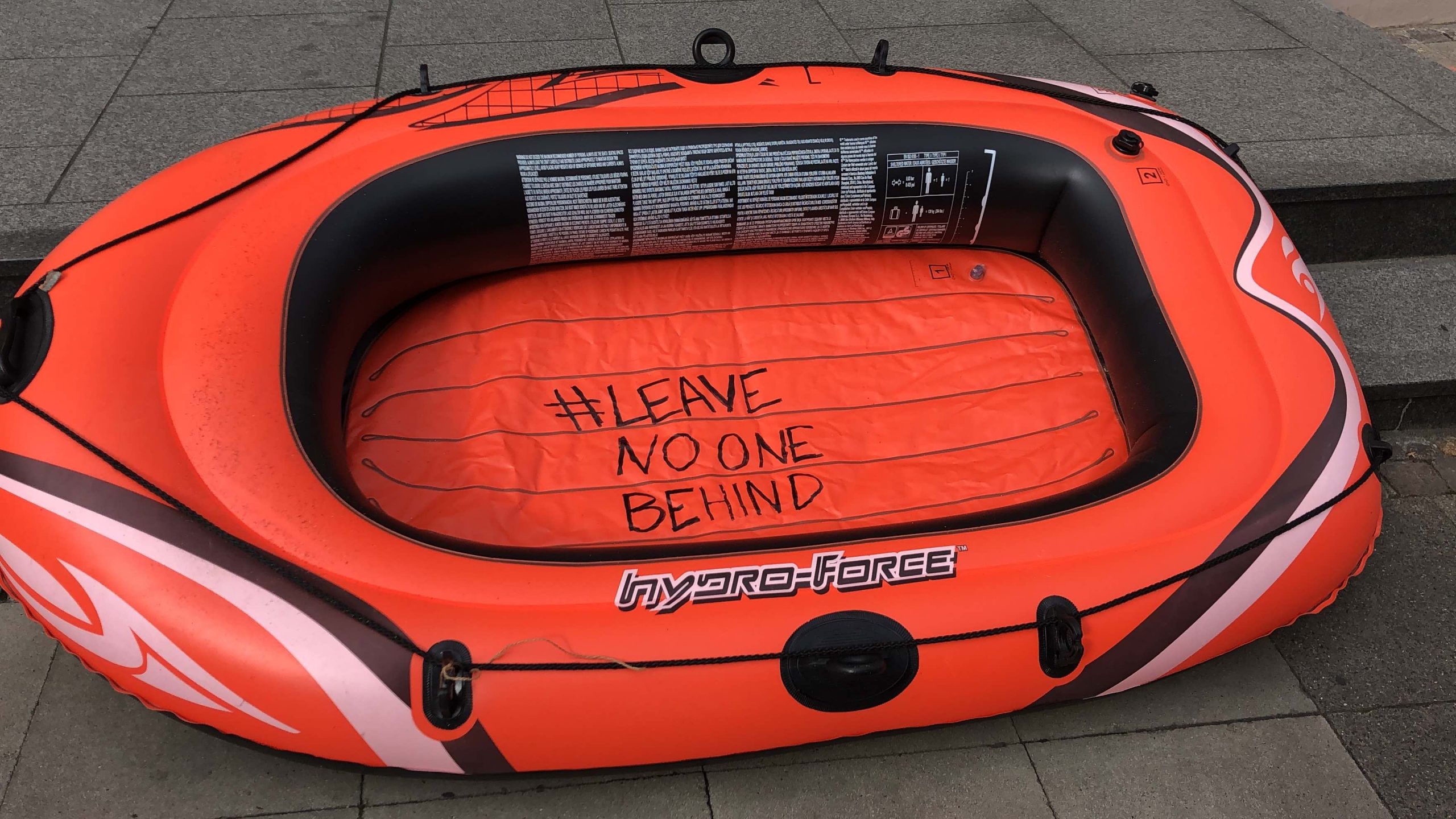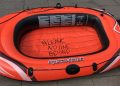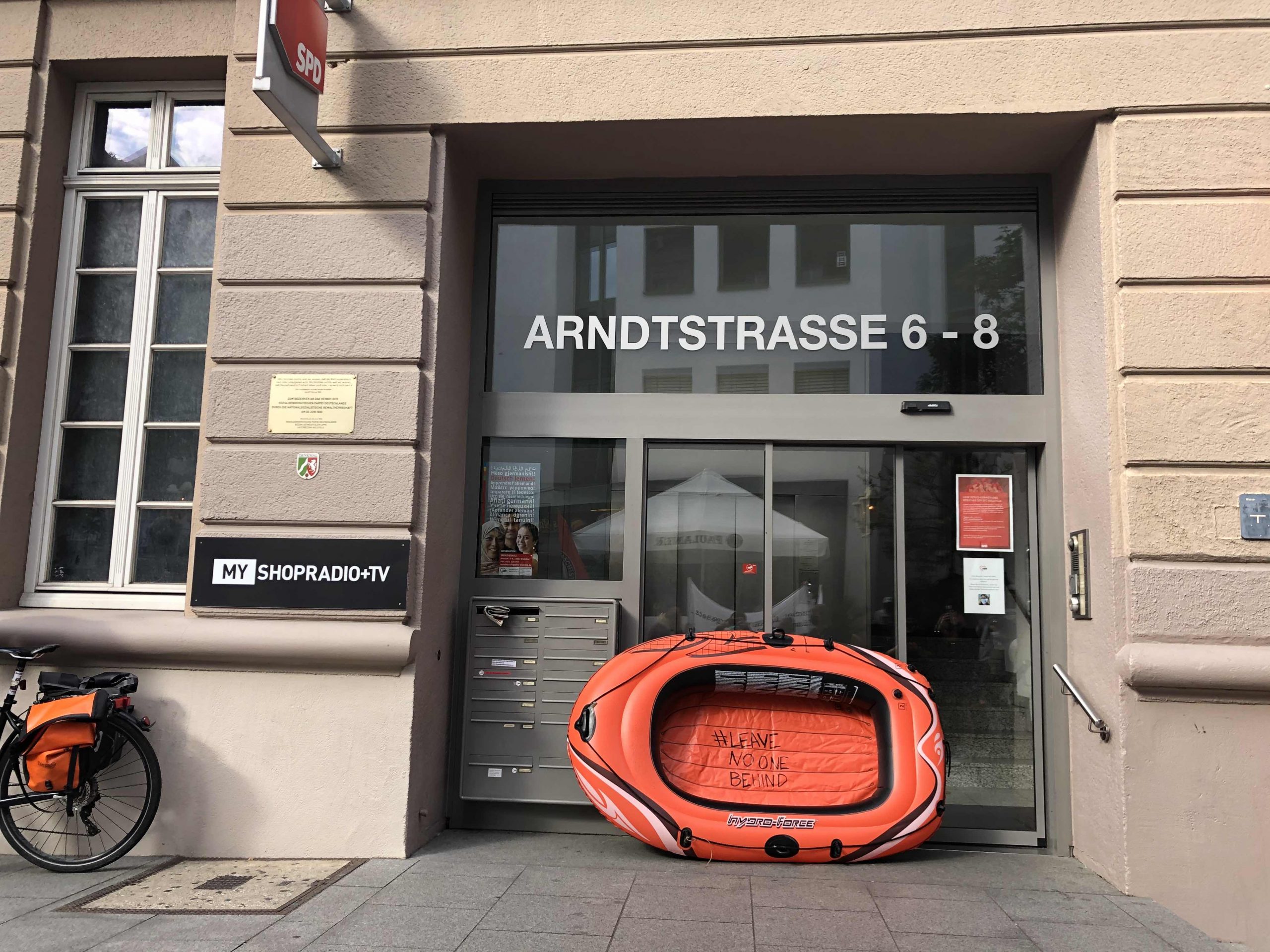Saat 17’de verilen ilk ara miting esnasında “Seebrücke” organizasyonu, bir konuşma yaptı. Konuşmanın yanı sıra SPD binasının önüne bir lastik bot bıraktı. SPD’nin mülteci politikasını protesto eden gençler, SPD’nin bu politikasıyla Akdeniz’de sebep olduğu ölümlere dikkat çekti.