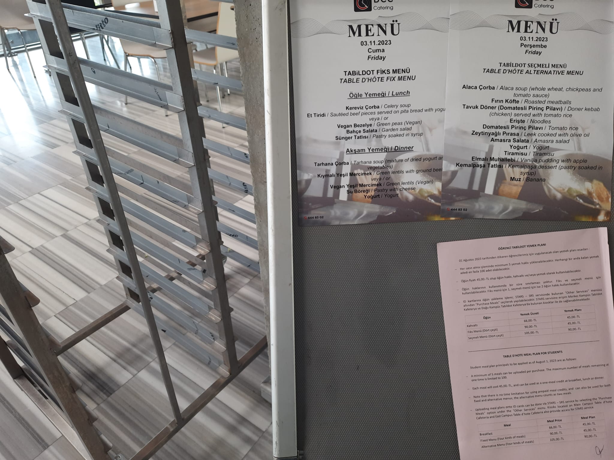 Bilkent Üniversitesi’nde en ucuz yemeğin yemekhanede olduğunu belirten öğrenciler, yemek ücretinin 45 TL olduğunu söyledi. Fix menü olarak verilen yemekte toplam 4 tabak yemek alınabildiğini belirten öğrenciler porsiyonların her geçen gün küçüldüğünü vurguladı.