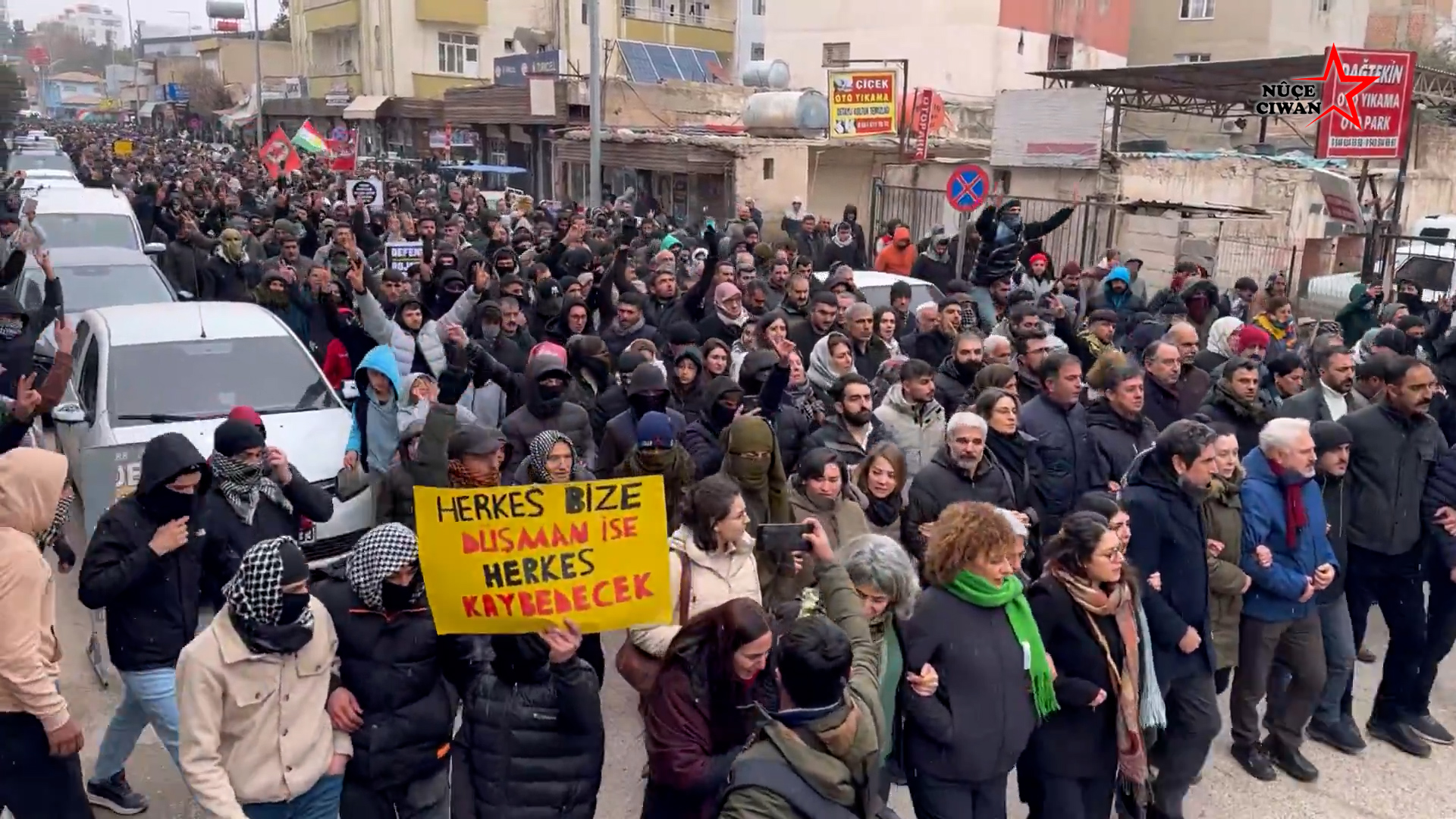 Kobanê sınırına düzenlenecek yürüyüş öncesi meydana toplanan halk üzerinde “Bê Serok jiyan nabe” yazılı Önder Apo’nun dev posterini açtı. Posterin açılmasıyla meydandakiler “Bijî serok Apo”, “Bijî berxwedana Rojava” sloganları attı.