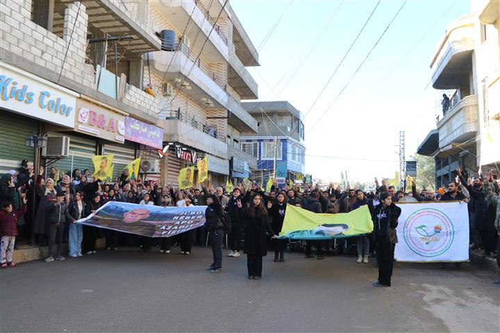 HABER MERKEZİ – Hesekê, Til Temir, Dirbêsiyê, Şedadê, Hol, Serêkaniyê Kampı ve Waşukani Kampı bölgelerinden binlerce kişi, “Komünizm ve demokratik toplum ruhuyla, Önder Apo ile özgür yaşayacağız” sloganıyla kitlesel bir yürüyüş düzenleyerek Önder Apo’nun serbest bırakılmasını talep etti.