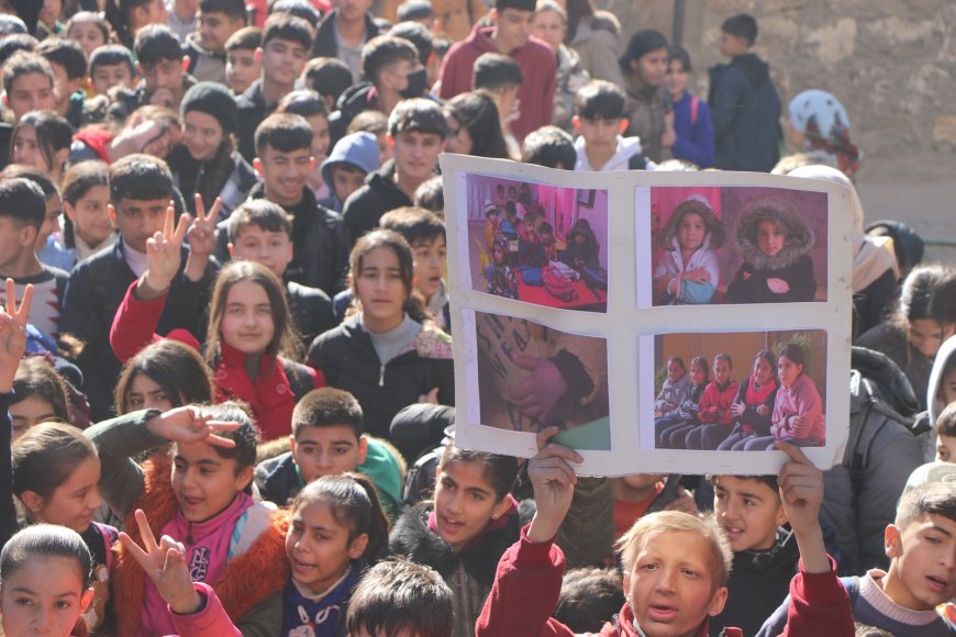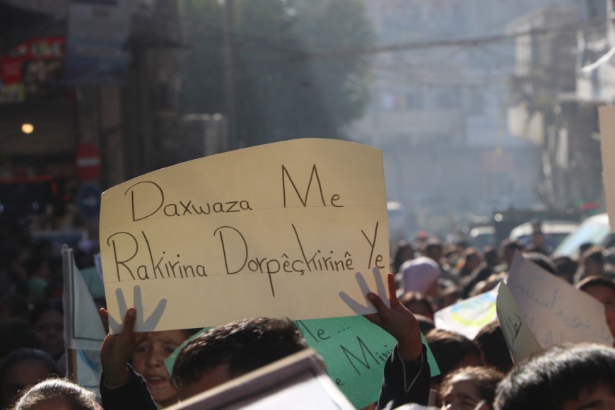 Yürüyüşe, Demokratik Toplum Eğitim ve Öğretim Komitesi’nin bayrakları, “Na ji ambargoyê..Fêrbûn mafê xwezayî ya her zarokakî ye”, “Qedeya fêrbûna zarokan sûc e” ve “Pêdiviya dibistanan bi germkirinê heye” yazılı bayraklar taşındı. Öğrenciler ayrıca mazot bidonları ve soba yakıt depolarını da ellerinde yürüyüş boyunca tuttular.
