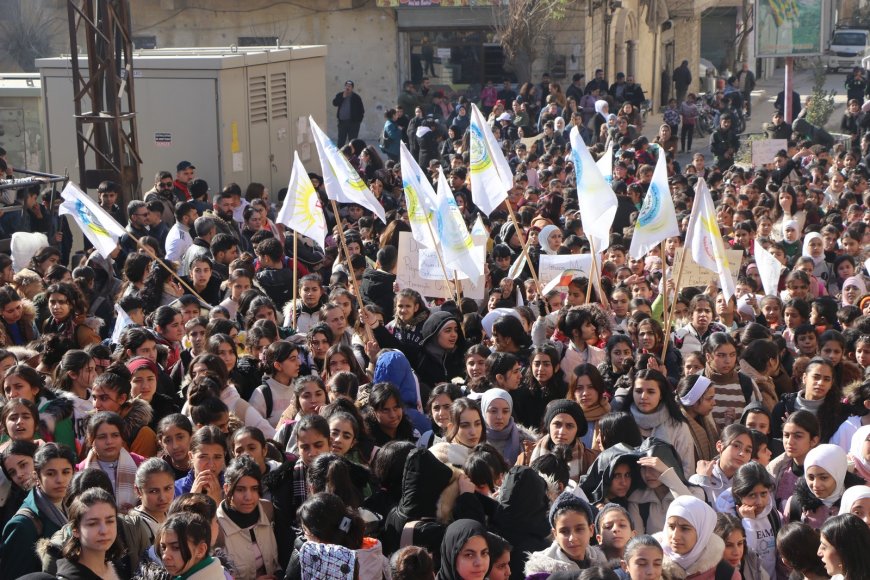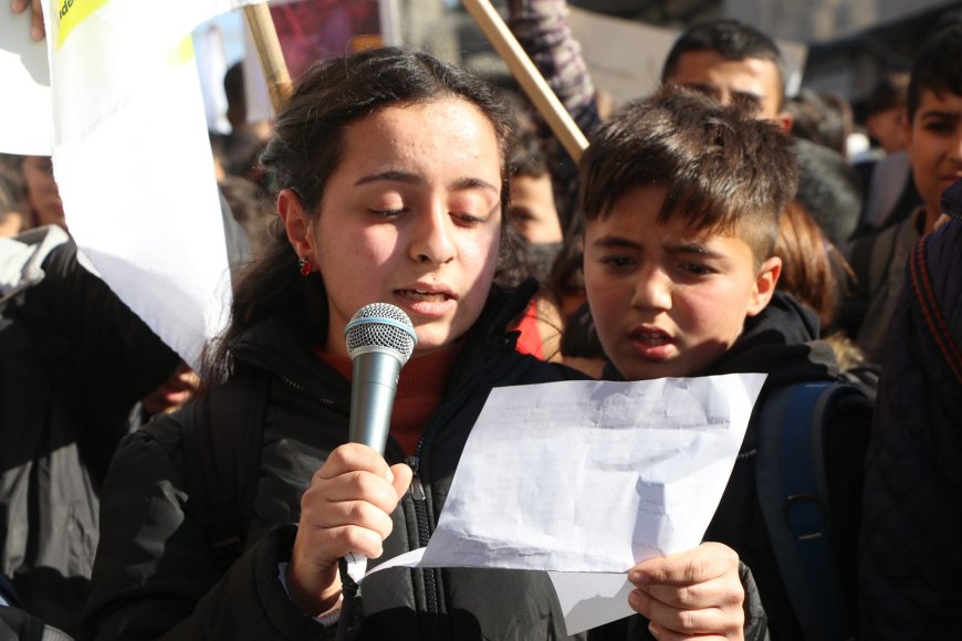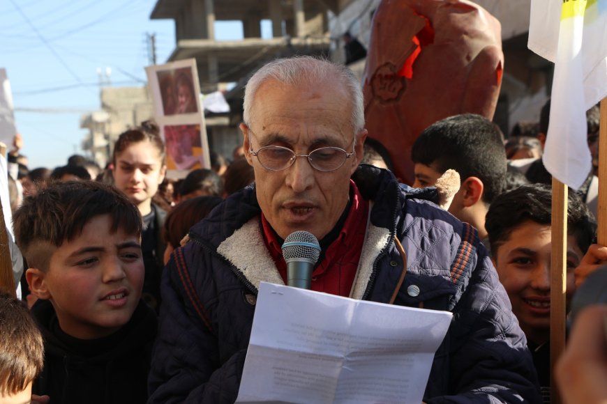 Demokratik Toplum Eğitim ve Öğretim Komitesi adına Şehit Gül Selmo kavşağında bir açıklama yapıldı. Açıklamayı Arapça olarak Öğretmen Selwa Mamo okudu ve her iki mahallenin Öğretmenler Birliği eş başkanı Şükri Mustafa da açıklamayı okudu.