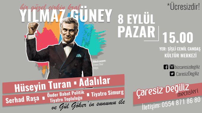 Hüseyin Turan, Adalılar ve Serhad Raşa’nın şarkılarıyla katılacağı etkinlik, saat 15.00’te başlayacak. Etkinliğe müzisyenlerin haricinde Önder Babat Politik Tiyatro Topluluğu ile Tiyatro Simurg katılım gösterecek. “Tüm halkımızı devrimci sanatçı Yılmaz Güney’i anma etkinliğine davet ediyoruz” açıklamalarında bulunan Çaresiz Değiliz Meclisleri, yurttaşları tiyatro sanatçısı Gül Göker’in sunumuyla sürecek olan “Bir güzel çirkin kral: Yılmaz Güney” etkinliğine katılmaya çağırdı.