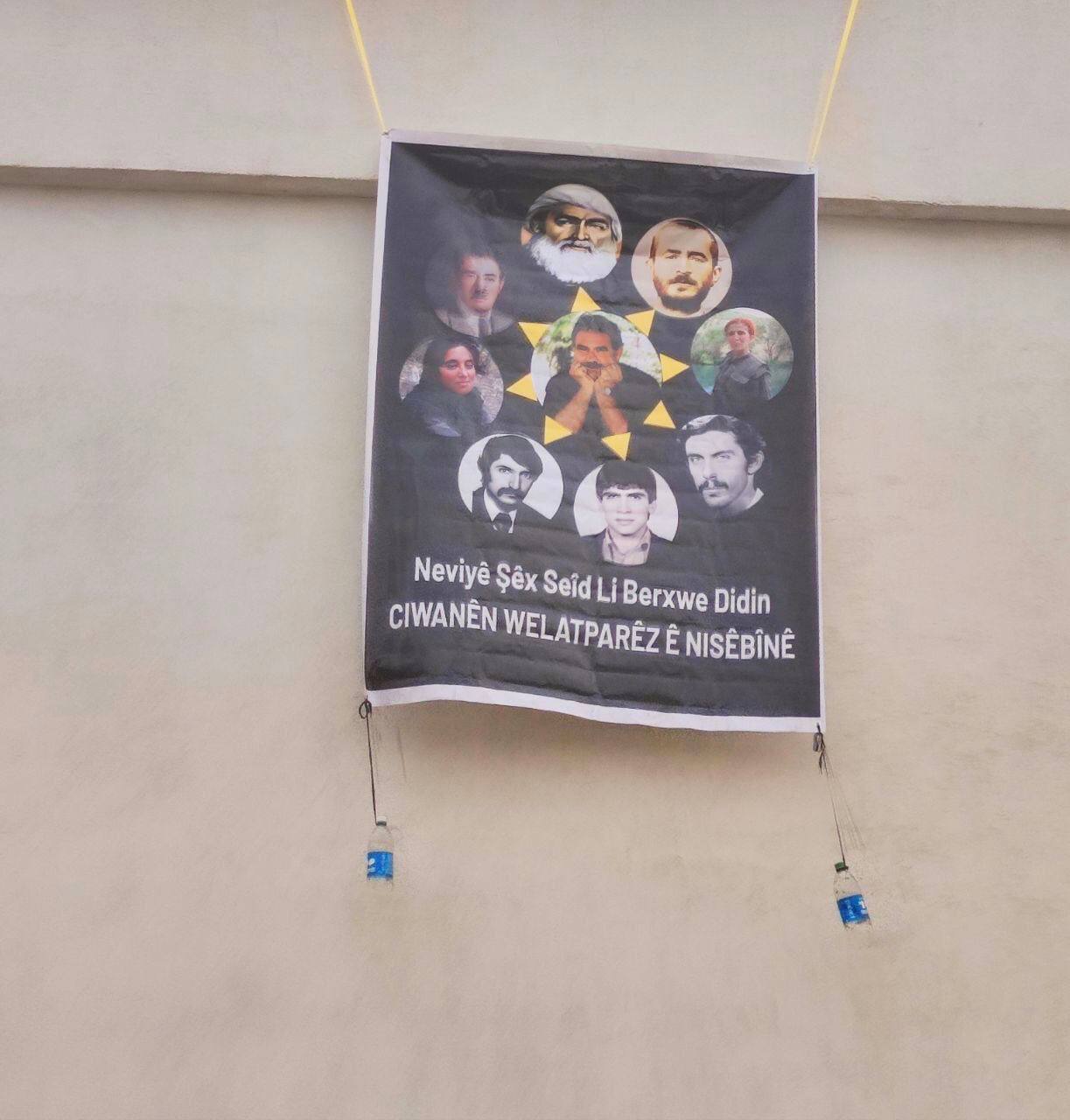 NISEBÎN- Nisebin’de yurtsever gençler, Önder Apo, Şêx Said, Şehit Sara, Şehit Kemal Pîr ve Şehit Hayri Durmuş gibi Kürt halkının öncülerinin ve değerlerinin resimlerinin yer aldığı pankartlar astı. Pankartta “Şeyh Said’in torunları direniyor” yazıldı.