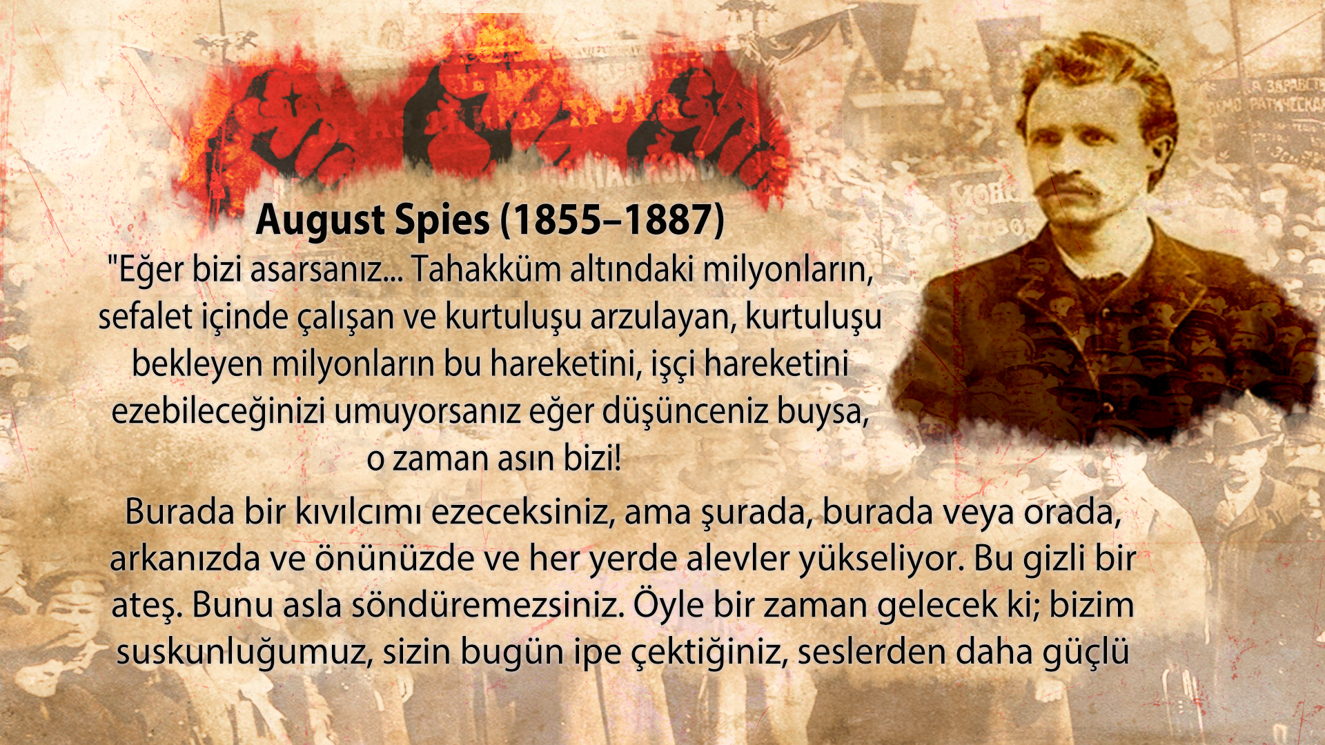 bekleyen milyonların bu hareketini, işçi hareketini ezebileceğinizi umuyorsanız eğer düşünceniz buysa, o zaman asın bizi! Burada bir kıvılcımı ezeceksiniz, ama şurada, burada veya orada, arkanızda ve önünüzde ve her yerde alevler yükseliyor. Bu gizli bir ateş. Bunu asla söndüremezsiniz. Öyle bir zaman gelecek ki; bizim suskunluğumuz, sizin bugün ipe çektiğiniz, seslerden daha güçlü olacaktır.”