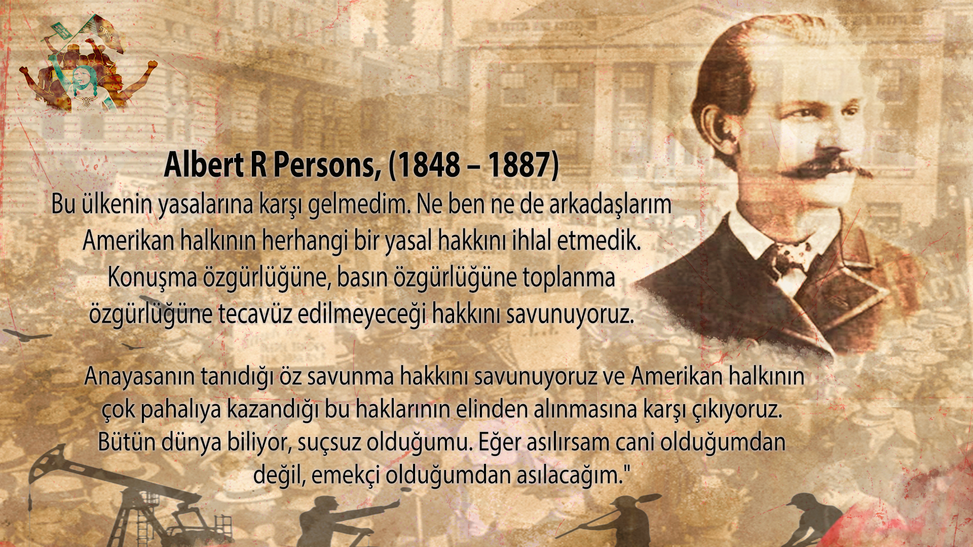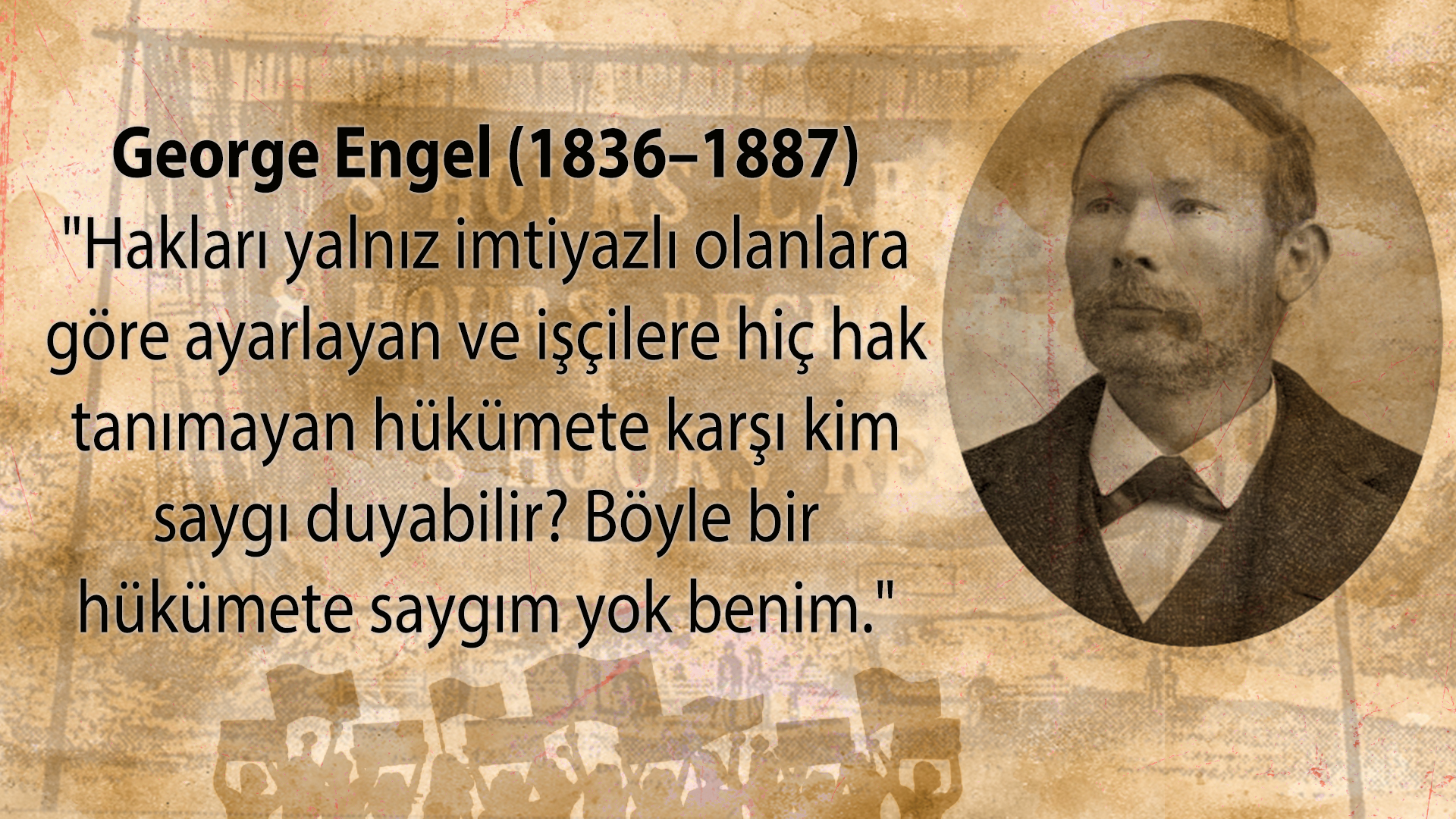 Amerika’daki işçiler, düşük finansmana, uzun ve zor çalışma saatlerine karşı sessiz kalmadı. Sanayi çağı başlamıştı ve işçiler her gün ölümün tehlikesiyle çalışıyorlardı. Artık “Bu Sisteme HAYIR!”, “Köle değiliz, işçiyiz” sözlerine ihtiyaç vardı ve bu ses duyuldu. 1 Mayıs 1886’da yarım milyon insan sekiz saat çalışmak için işlerinden istifa etme eylemleri başlattı. İşçiler, ırk, etnik köken veya cinsiyet ayrımı yapmadan aynı amaç için yürümeye başladı. Patronlar da bu eyleme sessiz kalmadı. İşçilere saldırmaları için sokak çetelerine para ödediler. Çeteler ve polisler burada 4 işçiyi öldürdü. Üretken gücün bir sonucu olarak, direniş gücü ortaya çıktı. Protestolar bu direnişle devam etti. Bazı eyaletler resmi olarak 8 saatlik çalışmayı kabul etmeye başladı ve artık direniş başarıya doğru gidiyordu. Fakat protesto için düzenlenen bir mitingde bomba patladı. Patlamada toplam 11 kişi öldü. Aynı zamanda mitingi örgütleyen 8 kişi gözaltına alındı. 4 kişiye idam cezası verildi. İçlerinden biri “Suçlu olmadığımı bütün dünya biliyor, suçlu olduğum için değil işçi olduğum için idam edileceğim” diye haykırıyordu.