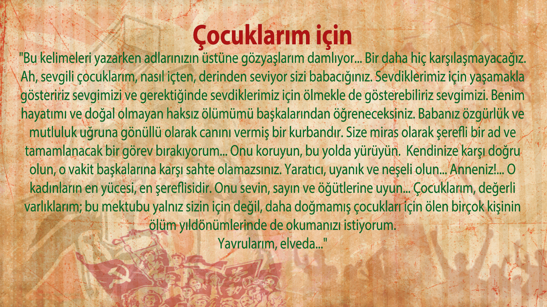 “Bu kelimeleri yazarken adlarınızın üstüne gözyaşlarım damlıyor… Bir daha hiç karşılaşmayacağız. Ah, sevgili çocuklarım, nasıl içten, derinden seviyor sizi babacığınız. Sevdiklerimiz için yaşamakla gösteririz sevgimizi ve gerektiğinde sevdiklerimiz için ölmekle de gösterebiliriz sevgimizi. Benim hayatımı ve doğal olmayan haksız ölümümü başkalarından öğreneceksiniz. Babanız özgürlük ve mutluluk uğruna gönüllü olarak canını vermiş bir kurbandır. Size miras olarak şerefli bir ad ve tamamlanacak bir görev bırakıyorum… Onu koruyun, bu yolda yürüyün. Kendinize karşı doğru olun, o vakit başkalarına karşı sahte olamazsınız. Yaratıcı, uyanık ve neşeli olun… Anneniz!… O kadınların en yücesi, en şereflisidir. Onu sevin, sayın ve öğütlerine uyun… Çocuklarım, değerli varlıklarım; bu mektubu yalnız sizin için değil, daha doğmamış çocukları için ölen birçok kişinin ölüm yıldönümlerinde de okumanızı istiyorum.