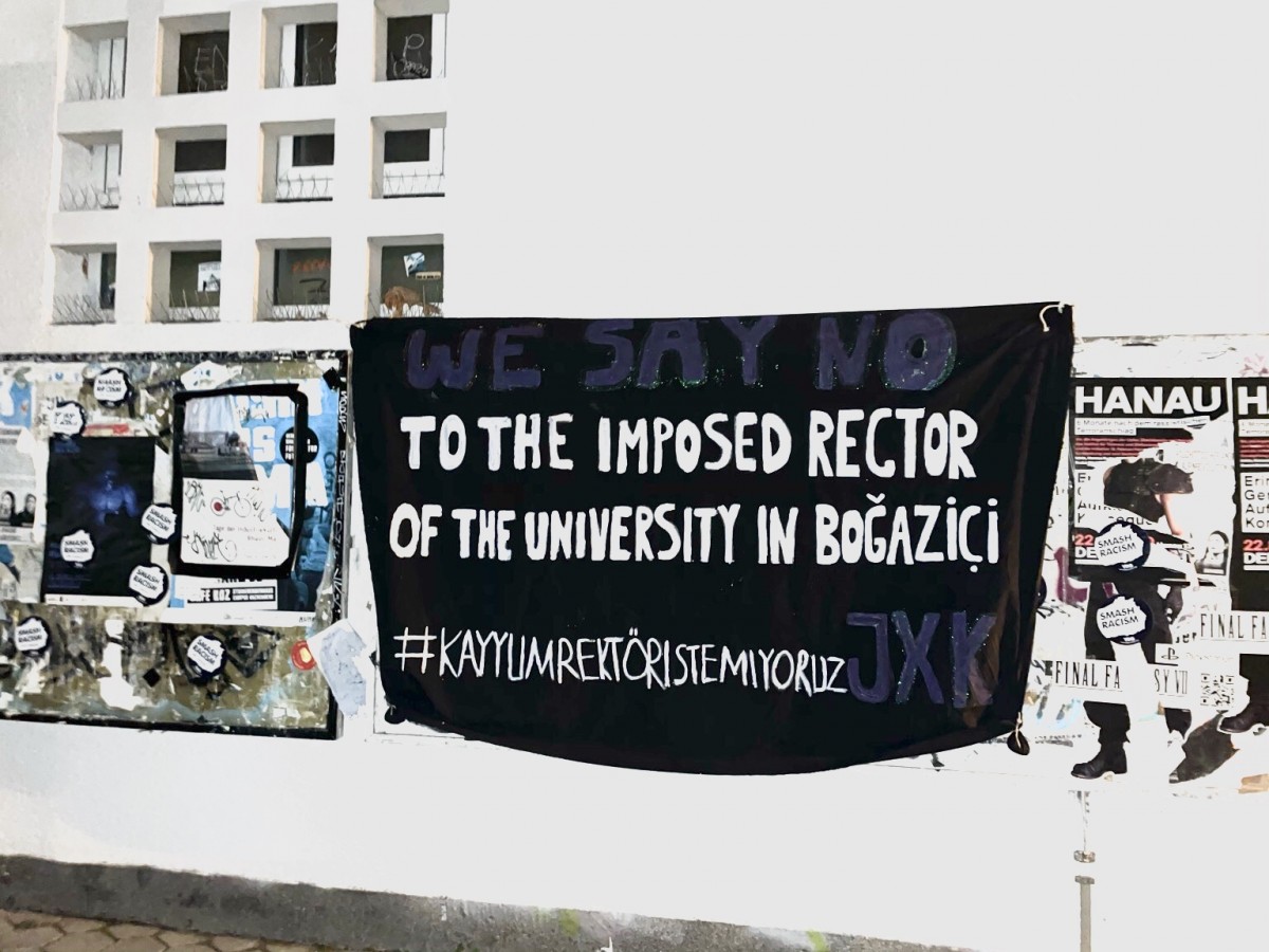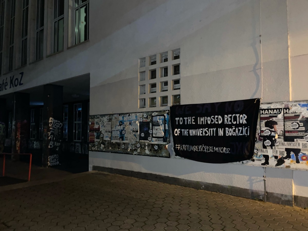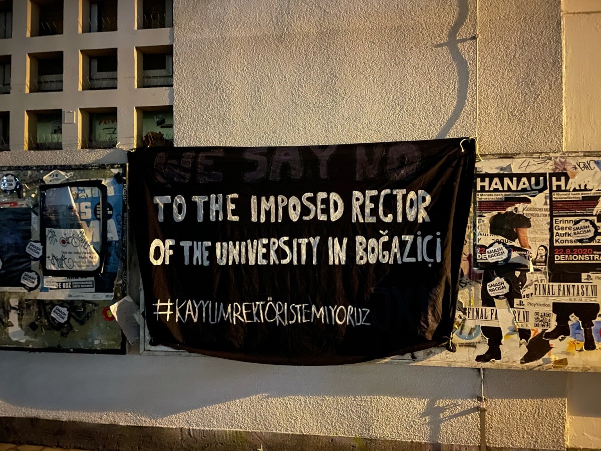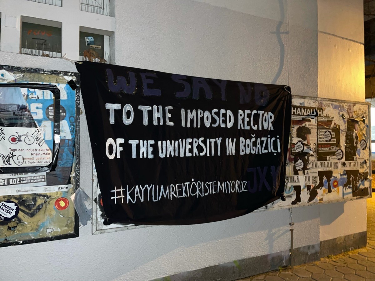Boğaziçi Üniversitesine atanan kayyum rektör Melih Bulu’yu protesto eden JXK aktivistleri İngilizce “Hayır diyoruz, Boğaziçi Üniversitesi’ndeki kayyum rektöre” yazılı pankartı Frankfurt Üniversitesine astılar.