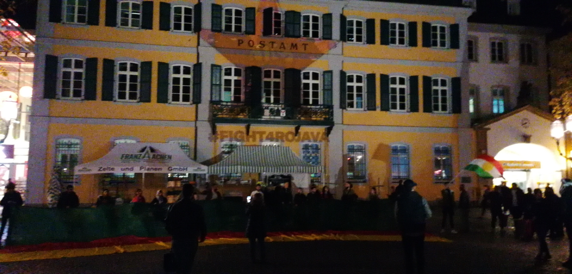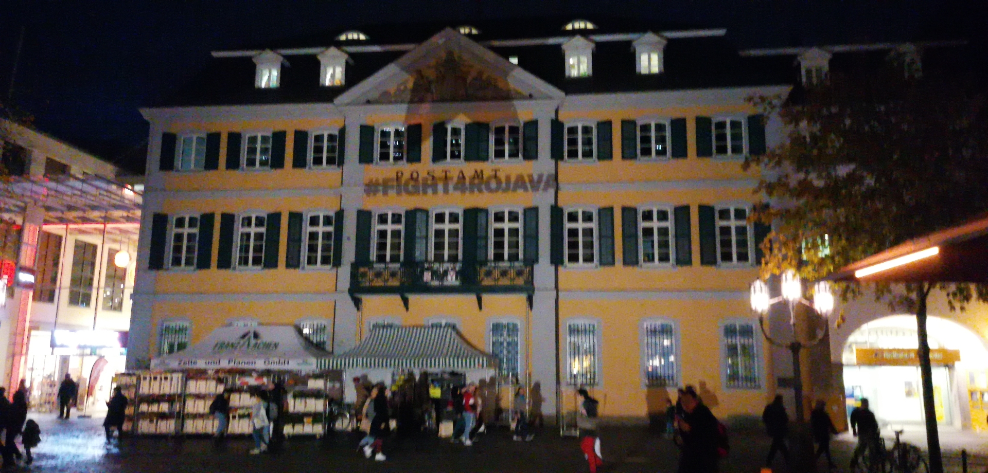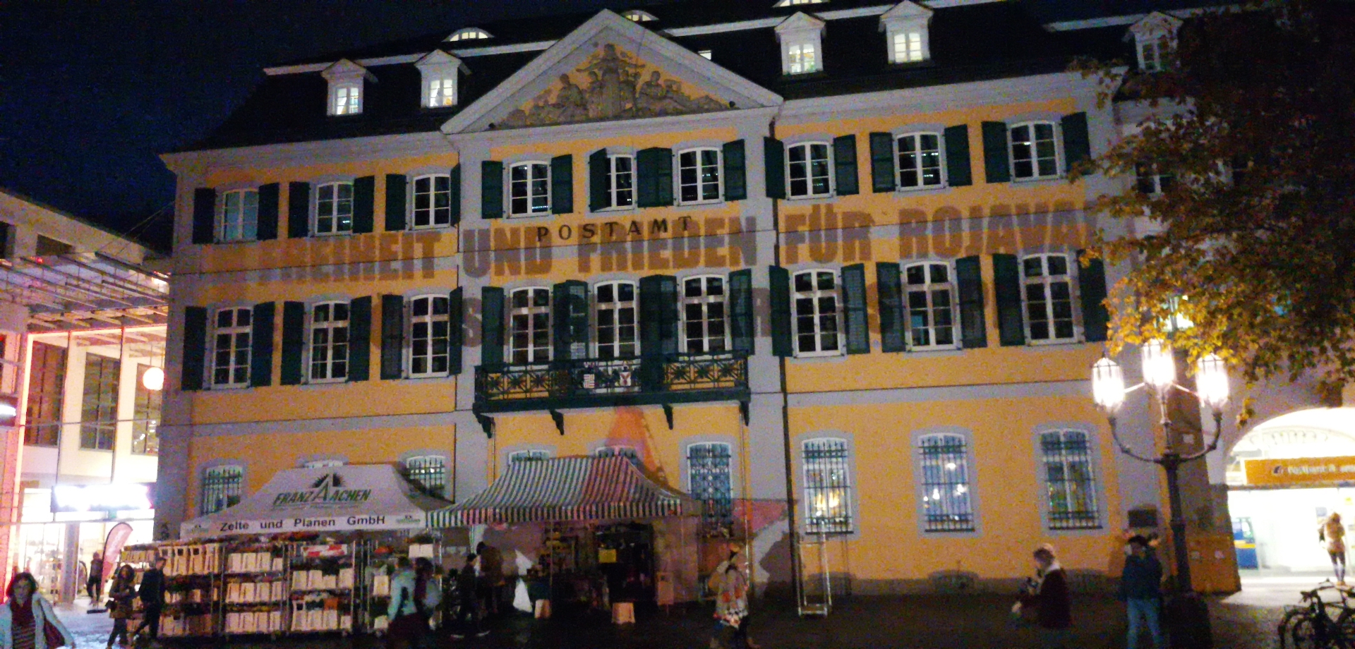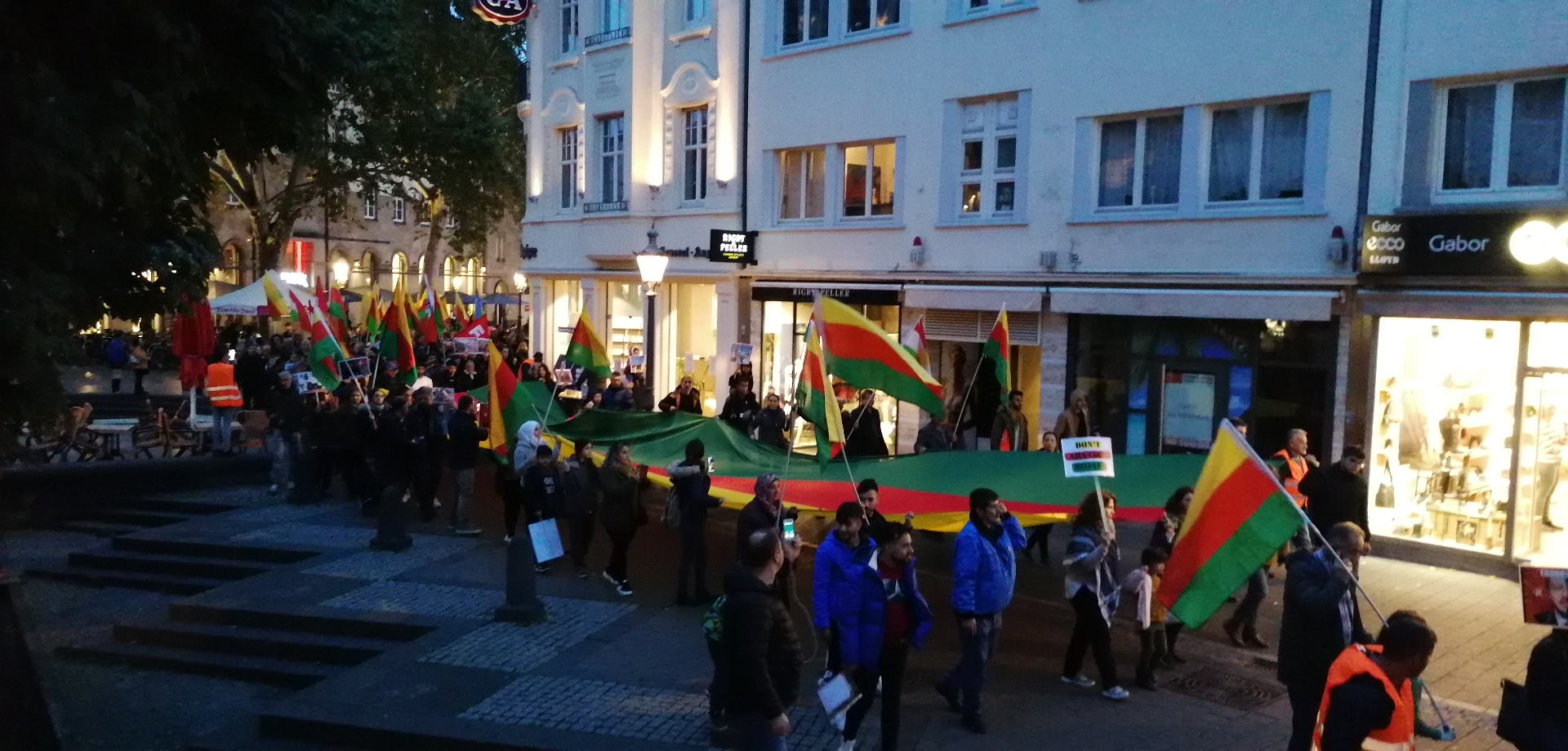 Saat 19’da devrim şehitleri anısına 1 dakikalık saygı duruşu ardından yürüyüşe başlayan kitle, ‘Katil Erdoğan hesap verecek’, ‘Bijî berxwedana Rojava’, ve Almanca ‘Yaşasın enternasyonal dayanışma’ sloganları eşliğinde yaklaşık 2 saat Bonn şehir merkezinde yürüdü. Kitle tekrar Münsterplatz Meydanına geldiğinde burada bulunan Postamt binasının duvarına projeksiyon ile Almanca ‘Rojava için savaş, Rojava için özgürlük ve statü, Erdoğan’ın savaşını durdurun’ yazıları yansıtıldı. 10 metrelik bir TEV-DEM bayrağının da açıldığı eyleme çevredekilerin de yoğun bir destek verdiği görüldü.