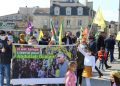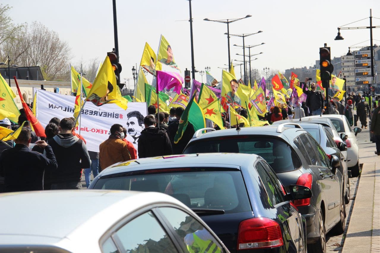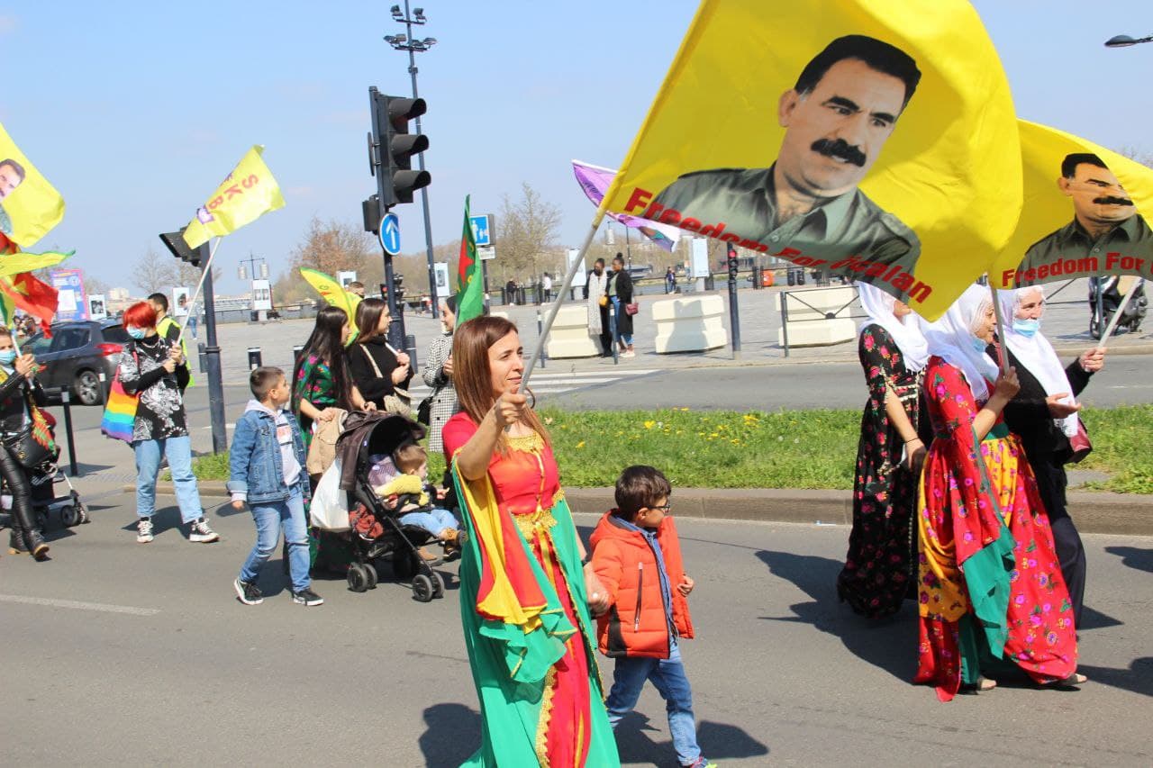 Önder Öcalan’ın yüzlerce posteri ile PKK, TCŞ, YPG, YPJ ve TJK-E bayraklarının taşındığı yürüyüşte sık sık ‘Bijî Serok APO’, ‘Liberte Pour Ocalan’, ‘Newroz Pîroz Be’ ve ‘Bij3i Berxwedana Garê’ sloganları atıldı.