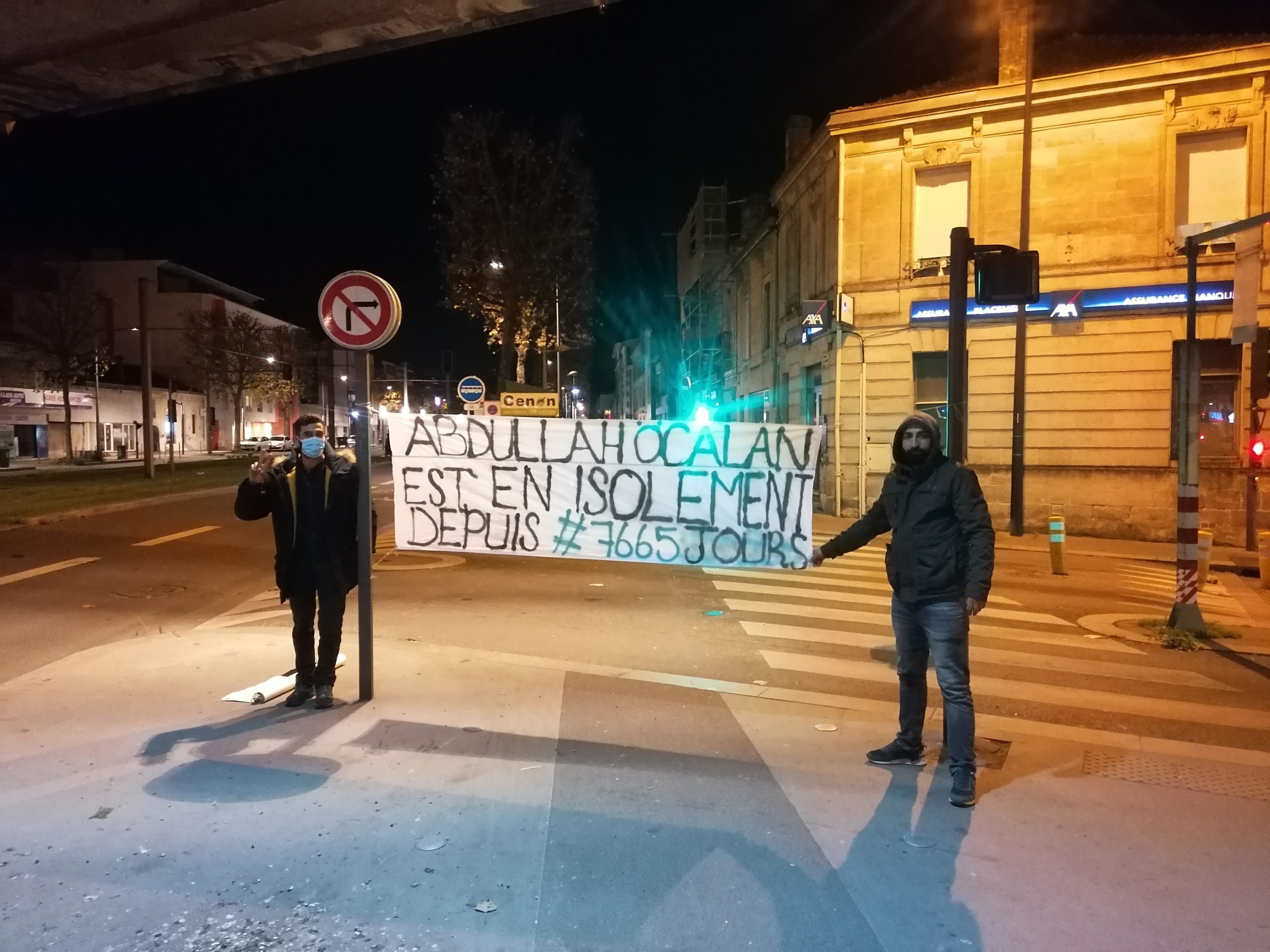 “Tecride, Faşizme, İşgale Son: Bi Hev Re Serhildan” şiarıyla düzenlenen eylem, saat 19’da Cenon semtinde başladı. Üzerinde Fransızca, “Abdullah Öcalan 7665 gündür tecritte” ve “Öcalan’a Özgürlük” yazan pankartları açan gençler, araç yolu üzerinde Fransızca ve Kürtçe sloganlarla eylemlerini sürdürdü. Gençler açtıkları Önder Öcalan’ın posterleri ile bir süre eylemlerini sürdürürken, bu sırada araçların geçişine engel oldular.