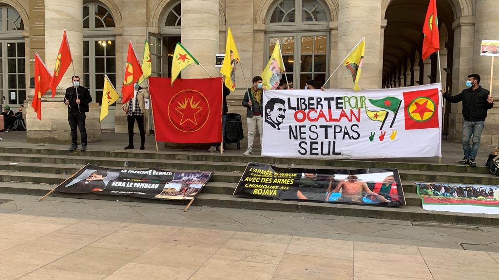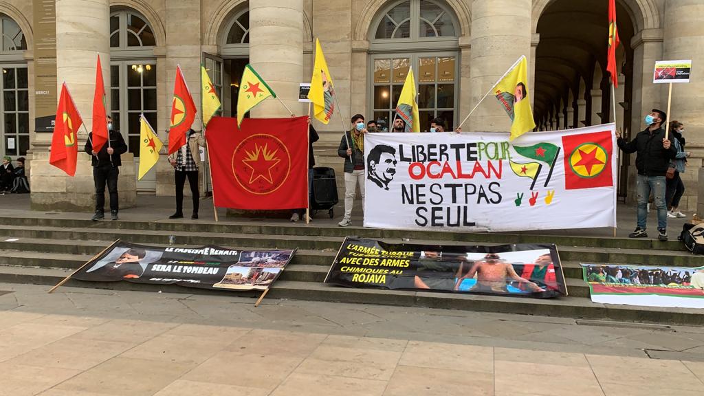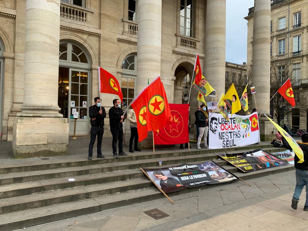 Önder Öcalan’ın fiziki özgürlüğünün amaçlandığı şiar doğrultusunda Grand Théâtre meydanında bir araya gelen gençler, üzerinde Fransızca “Liberte Pour Öcalan – Nest Pas Seul (Öcalan’a Özgürlük – Yalnız Değildir)” yazan bir pankart ile PKK ve Önder Öcalan’ın “Freedom For Öcalan” yazılı bayraklarını taşıdılar.