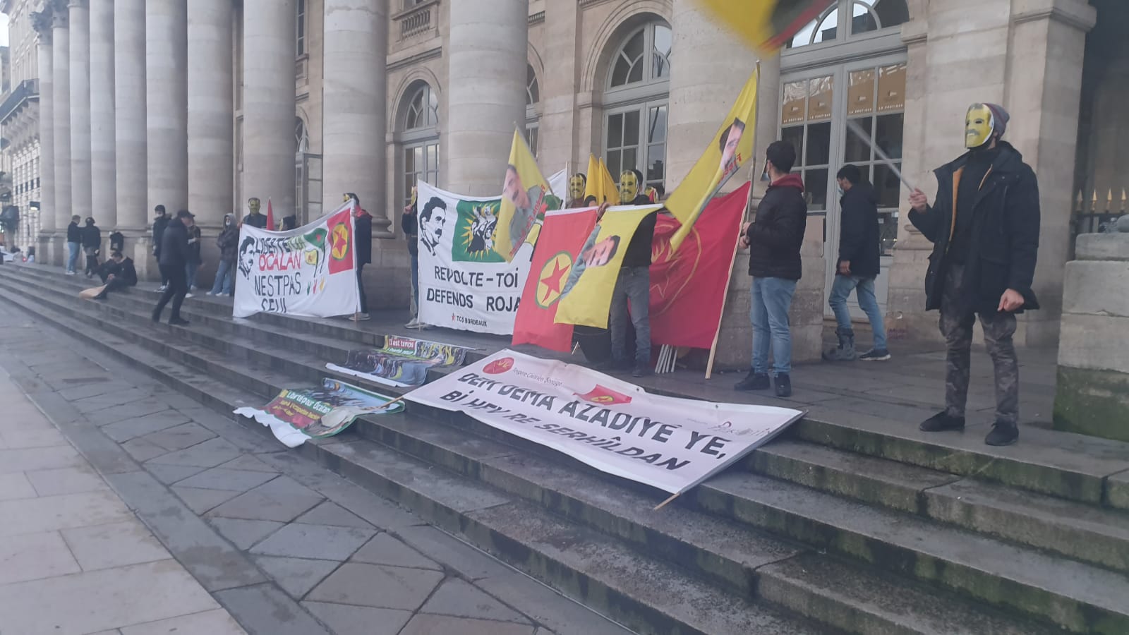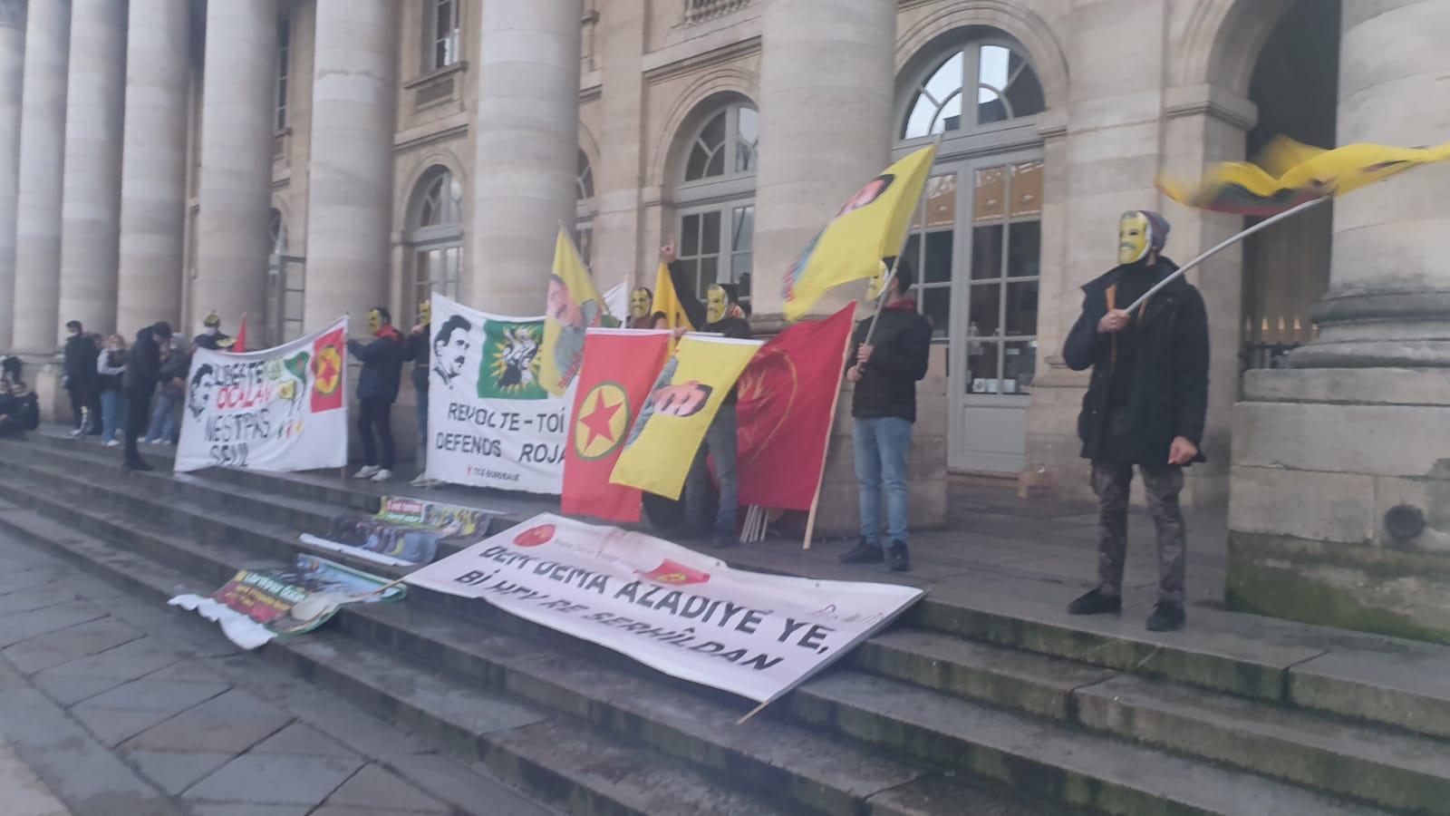 Eylemde sık sık “Diktatör Erdoğan”, “Assassin Erdogan (Katil Erdoğan)”, “A Bas Le Régime Fasciste En Turquie (Kahrolsun Faşist Türk Rejimi)”, “Bijî Serok APO” ve “Bi Hev Re Serhildan” sloganları atıldı.