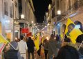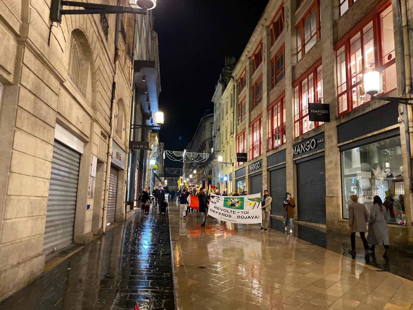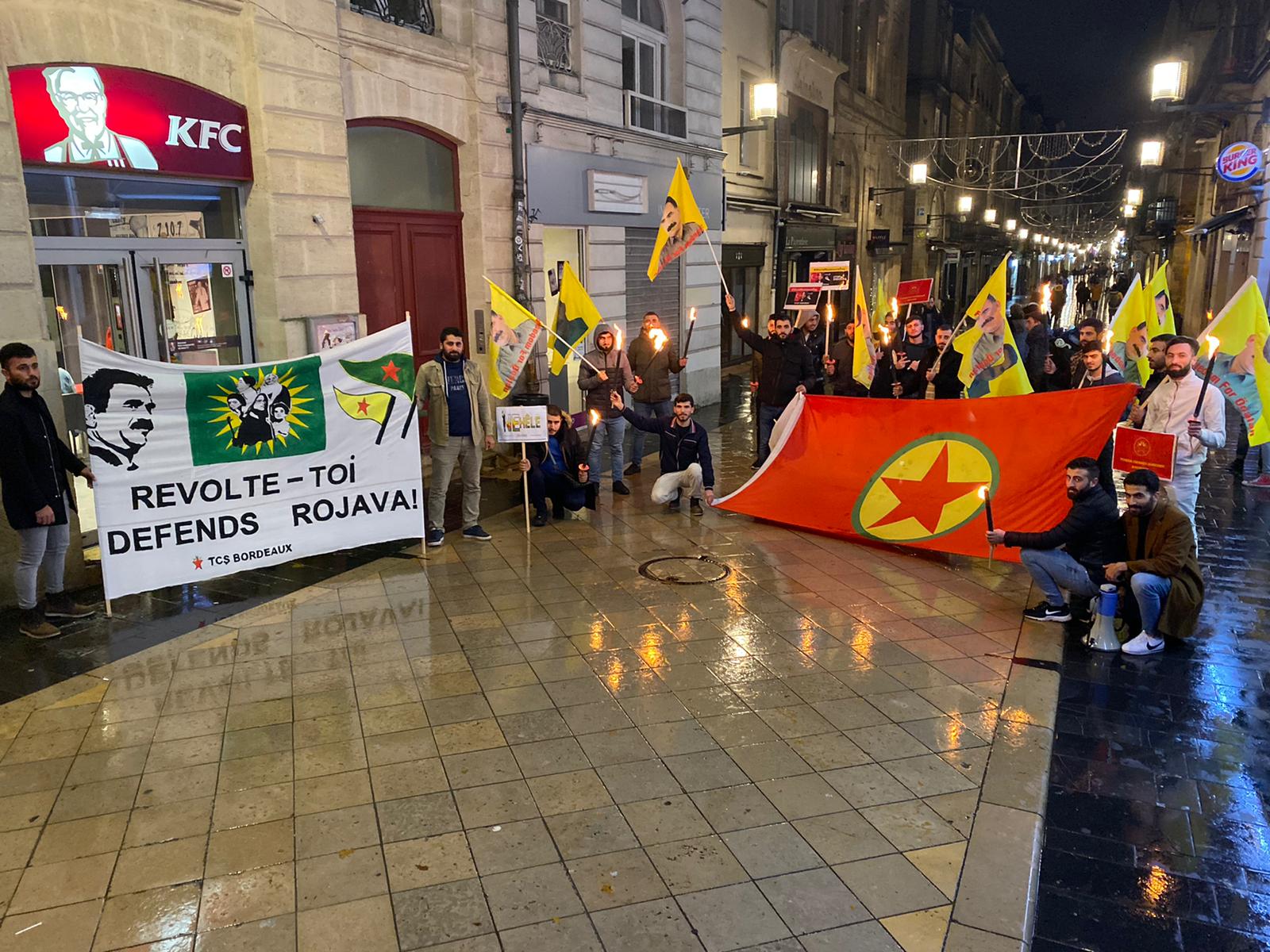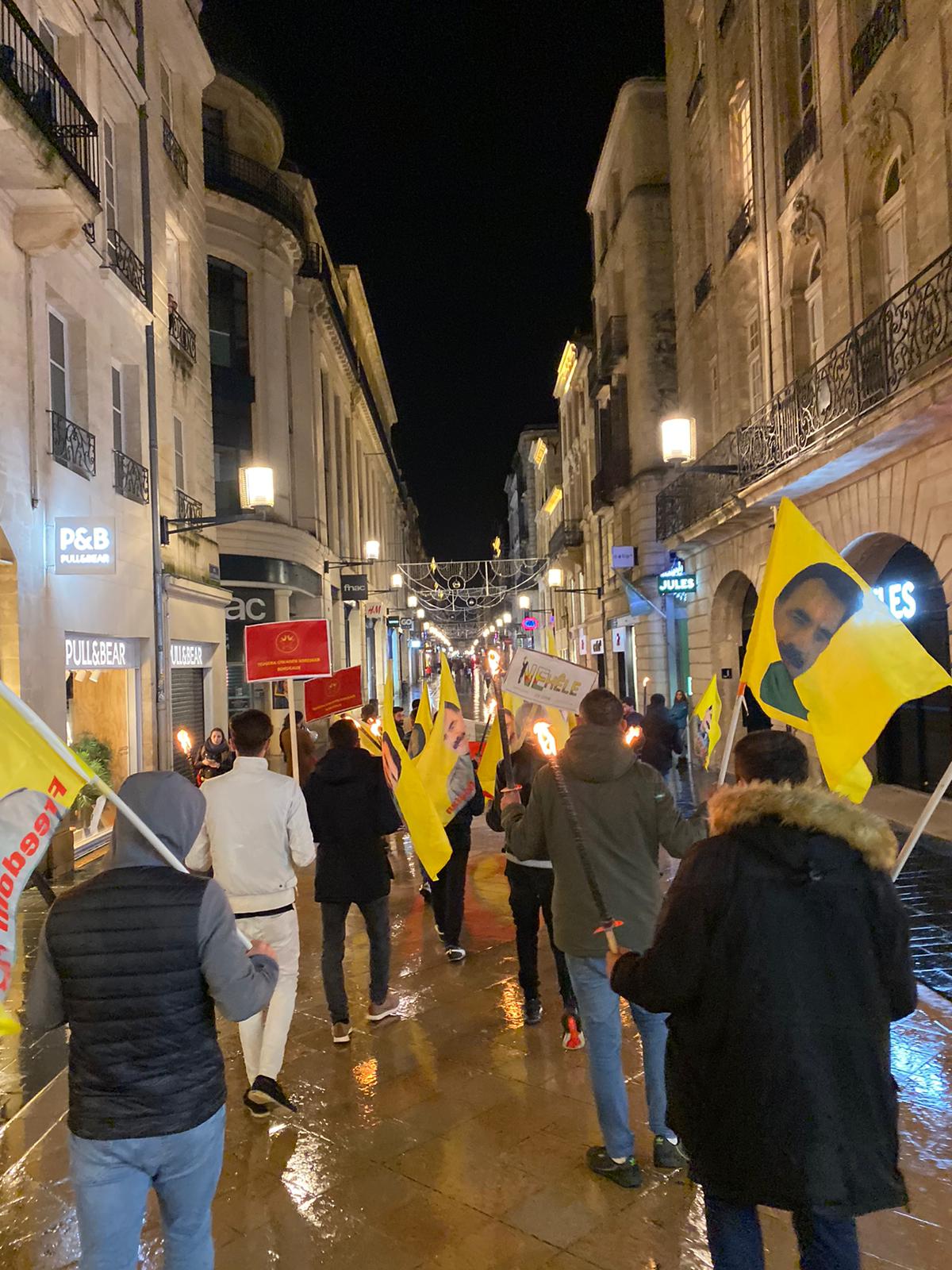 Gençler, en önde büyük bir PKK bayrağı ve üzerinde Fransızca “Başkaldır, Rojava’yı savun” yazan bir pankart ile yürüyüşe başladı. Çarşı merkezinde yapılan yürüyüşte sık sık Fransızca ve Kürtçe “Yaşasın PKK” ve “Bijî Serok APO” sloganları atıldı. Çarşı merkezinde yapılan yürüyüşte attıkları sloganlar ile Onur Direnişi’ni de selamlayan gençler, eylemlerini Kürdistan devrim şehitleri anısına yaptıkları saygı duruşu ve Çerxa Şoreşê marşını okuyarak sonlandırdı.