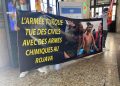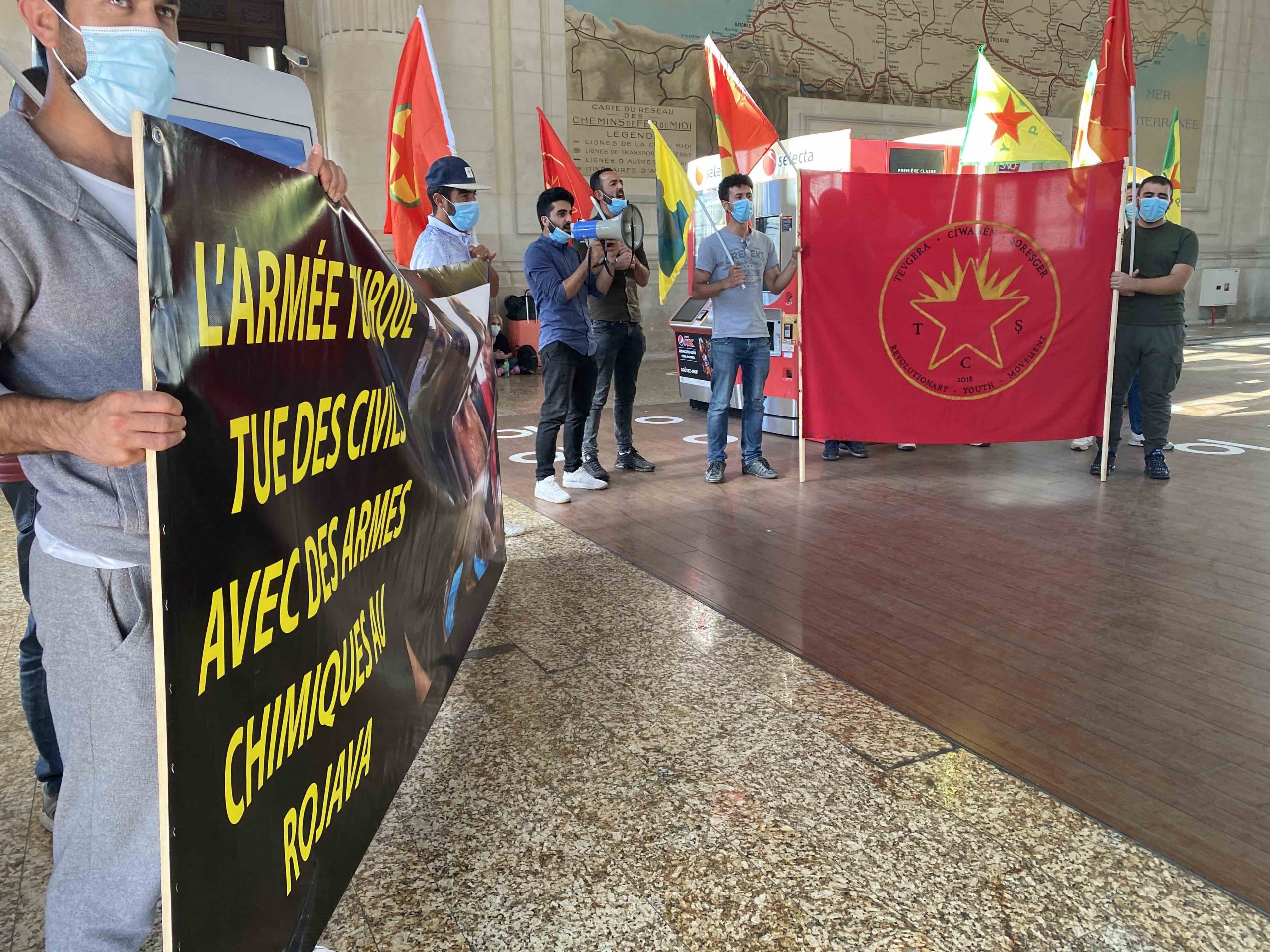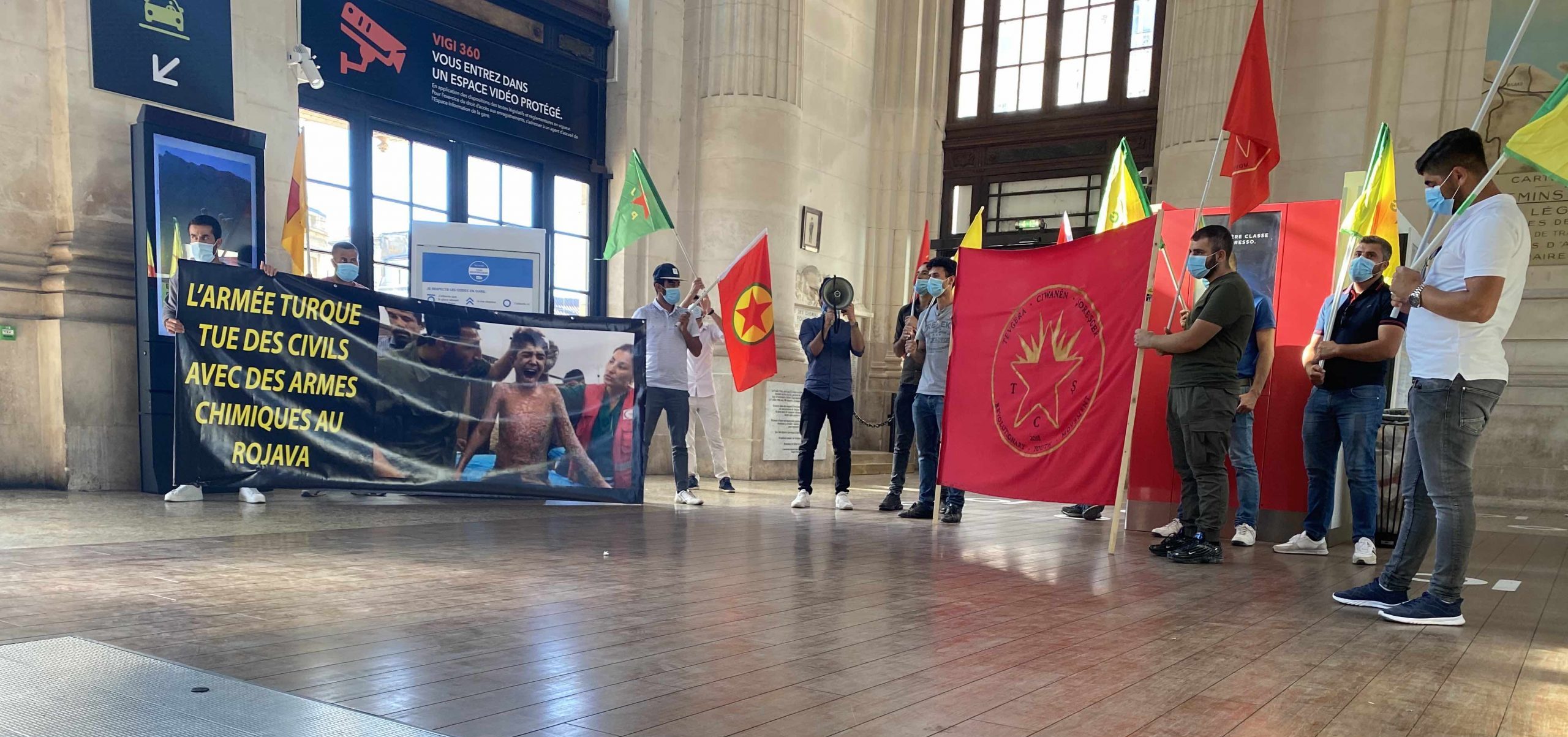 11 Temmuz Cumartesi akşam saatlerinde merkez tren garında bir araya gelen gençler, üzerinde Fransızca, “Türk ordusu Rojava’da sivilleri kimyasal silahlarla öldürdü” yazılı bir pankartı açarak eylemlerine başladı. Halklar Önderi Abdullah Öcalan’ın posterleri ve YPG, PKK bayraklarının taşındığı eylemde büyük bir TCŞ bayrağı da açıldı. Gençler, Fransızca ve Kürtçe attıkları sloganlar ile Türk faşizmini teşhir ederlerken, Fransızca okudukları bildiri ile de o sırada garda bulunan insanları bilgilendirdiler.