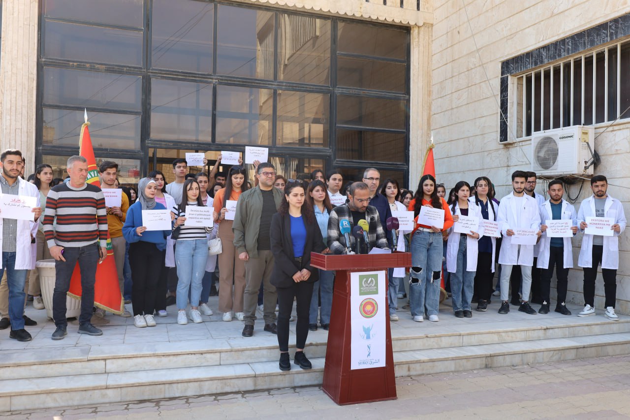 QAMIŞLO- Kuzey ve Doğu Suriye Üniversiteler Meclisi, Şam yönetimi tarafından açıklanan anayasa bildirgesine ilişkin bir açıklama yaptı. Açıklama, Qamişlo’da meclis binası önünde onlarca meclis üyesinin katılımıyla yapıldı.