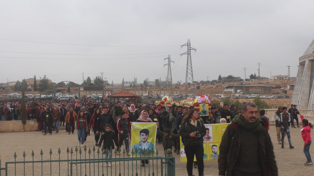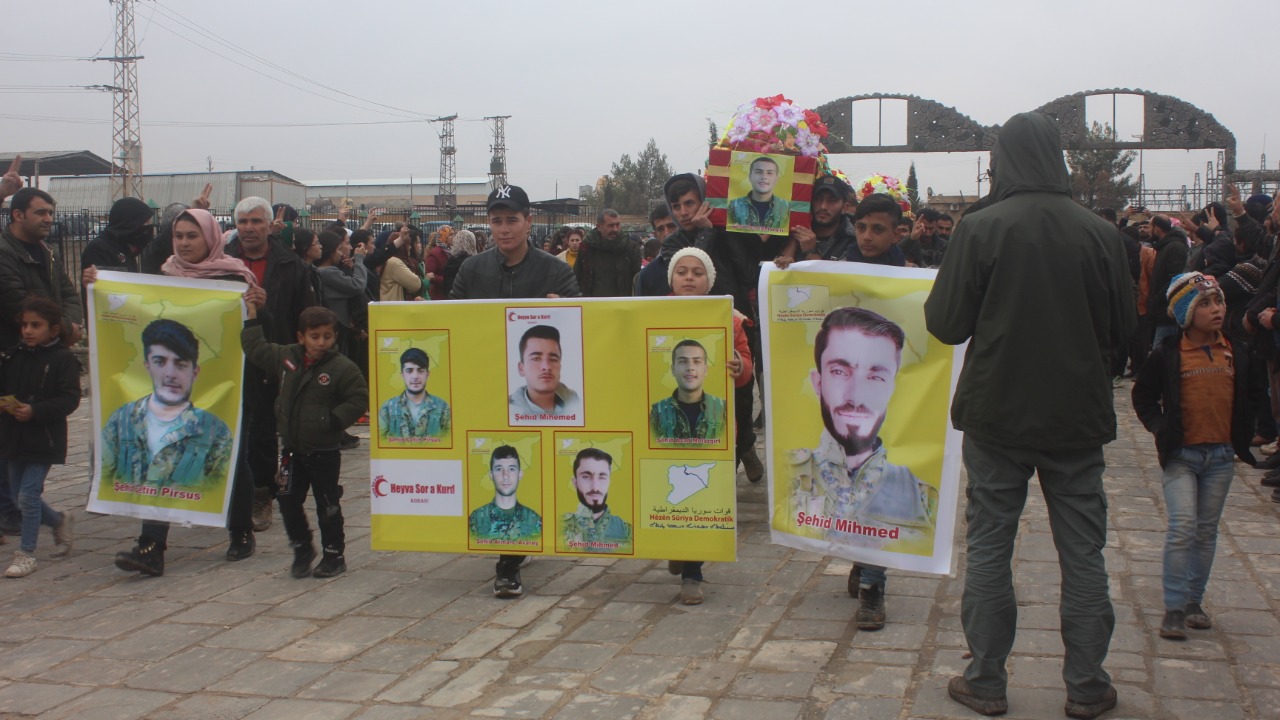 Cenga Rojava Direnişi'nde şehit düşen 3 QSD savaşçısı, Kobanê’de gerçekleştirilen kitlesel törenle son yolculuğuna uğurlandı. Törende iki şehidin daha kimlik bilgileri açıklandı.
