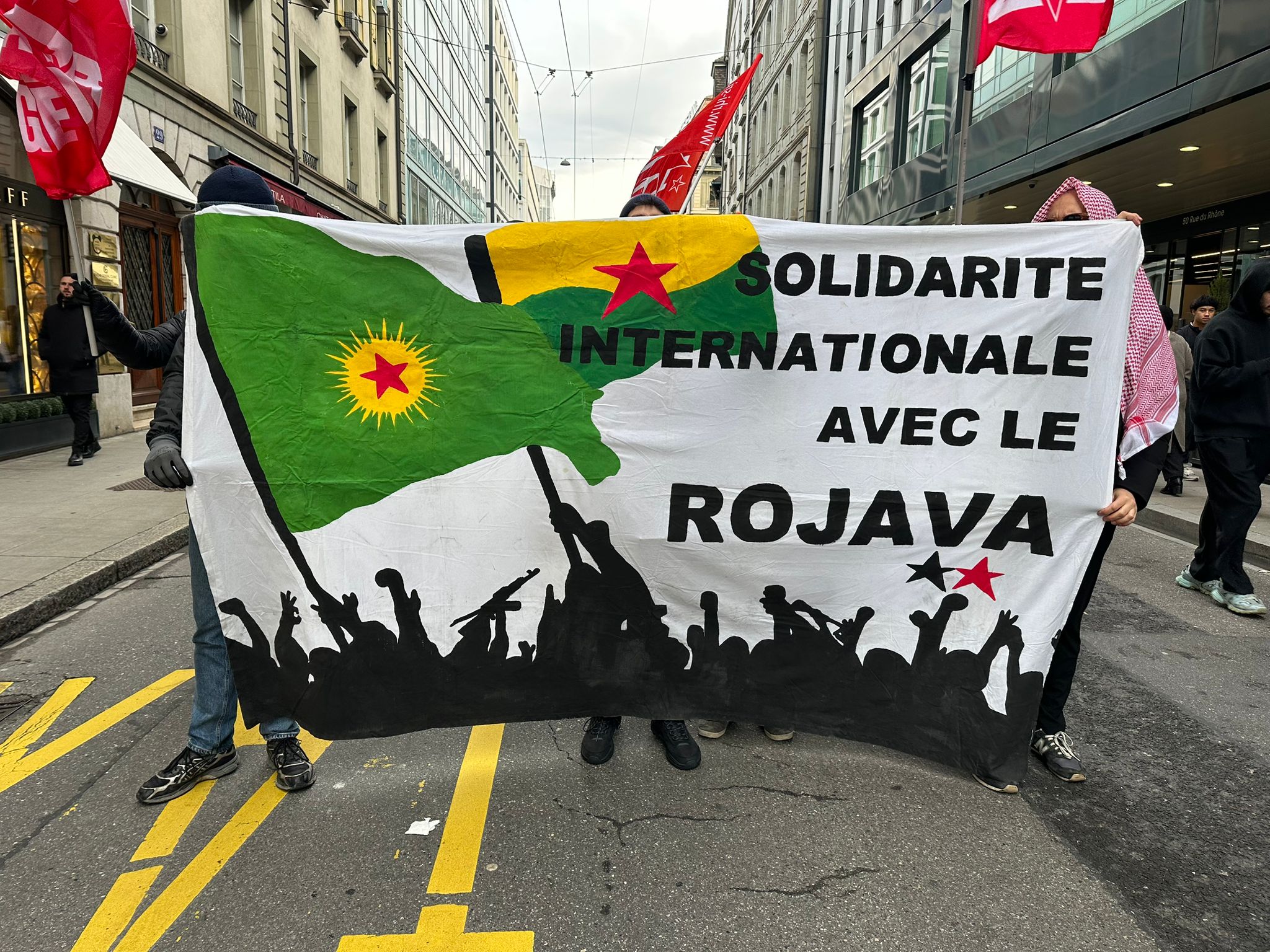 Yürüyüşün ardından Plainpalais Meydanı’nda Kürdistani derneklerin ortak basın açıklaması yapıldı. Kalabalık, birlik ve direniş ruhunu güçlü şekilde gösterirken, Rojava’da yürütülen özgürlük mücadelesinin yalnız olmadığı vurgulandı.