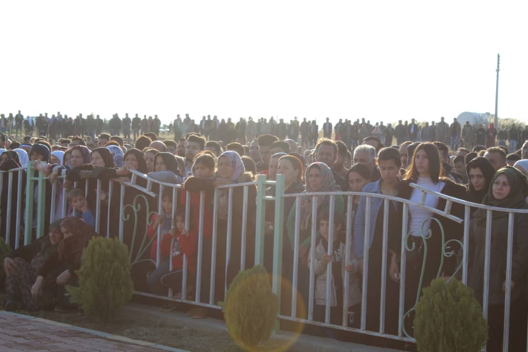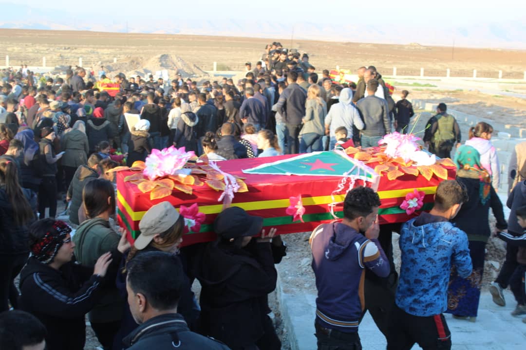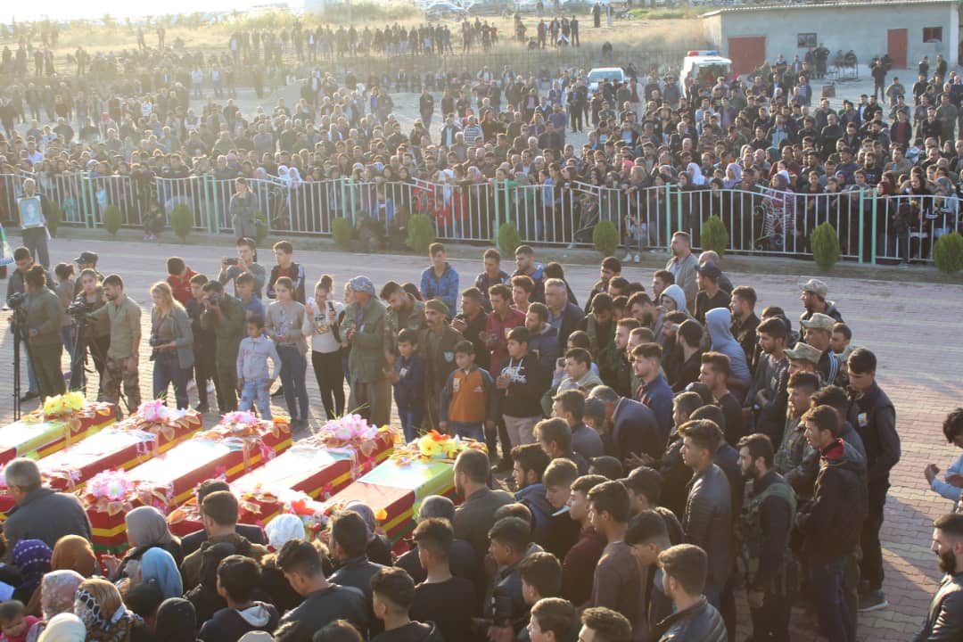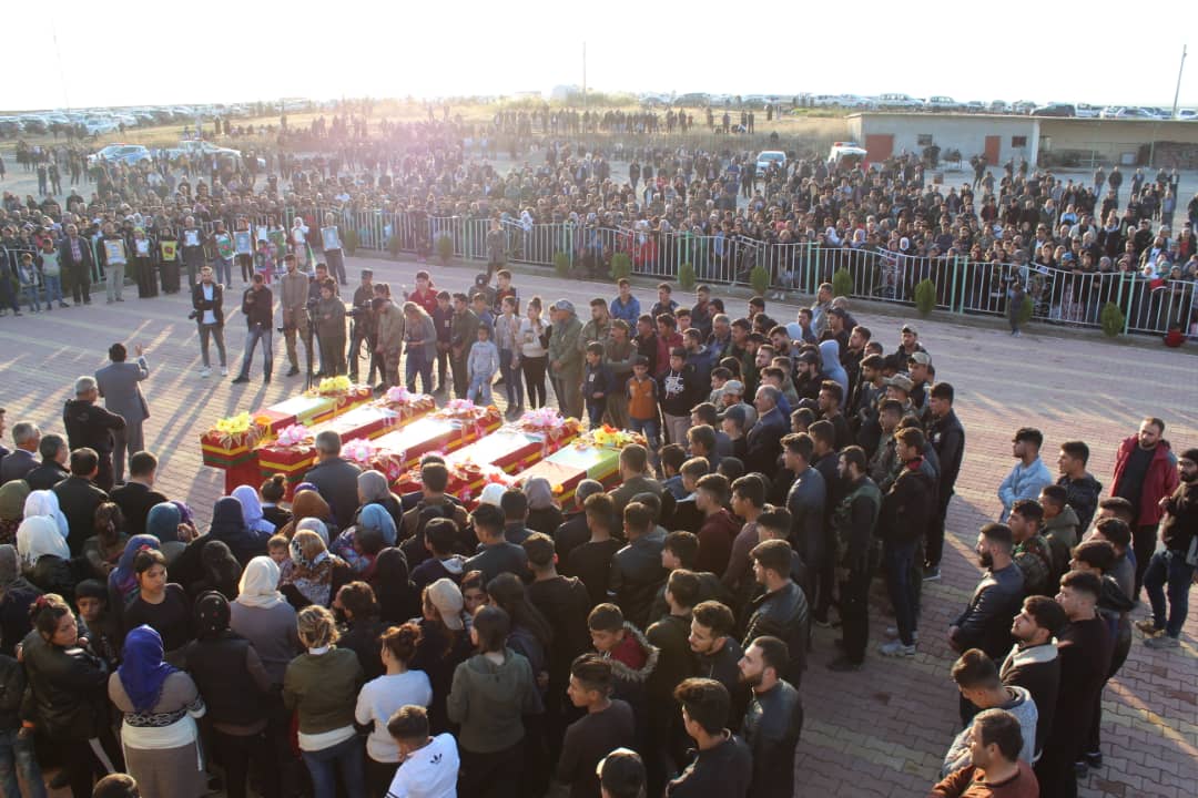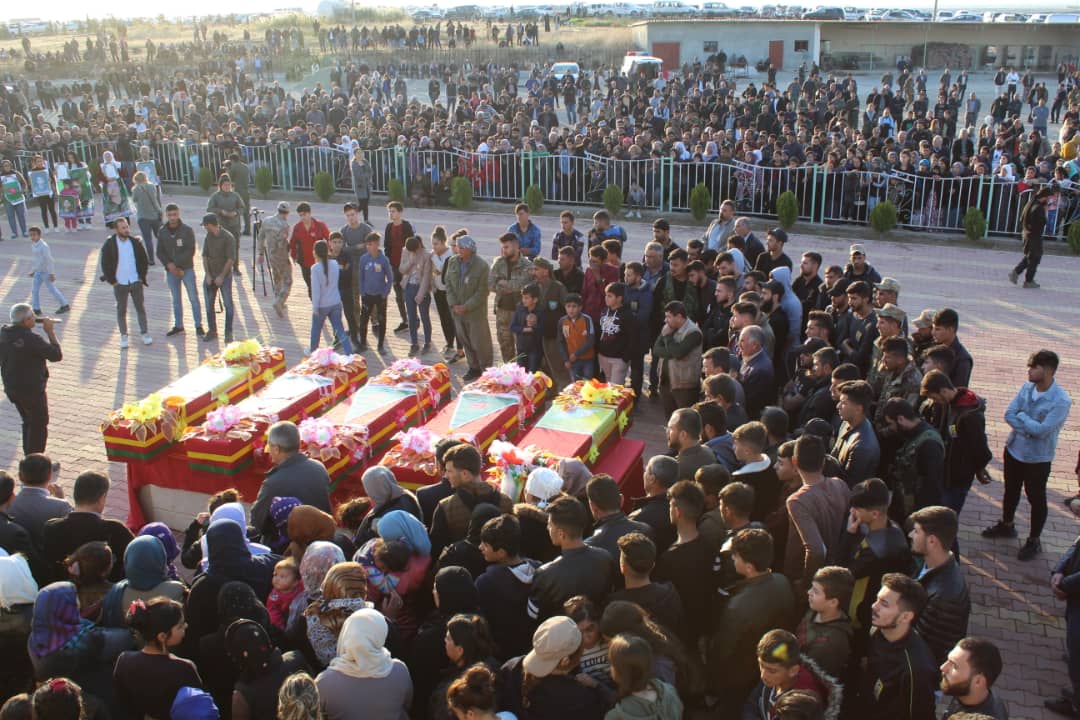 Şehit cenazelerini Şehit Hogir Hastanesi’nden teslim alan binlerce kişi, uzun araç konvoyu ile Şehit Xebat Dêrik Şehitliği’ne doğru yola çıktı. Saygı duruşu ile başlayan törende konuşan Demokratik Toplum Hareketi (TEV-DEM) Eşbaşkanı Xerîb Hiso, şehit ailelerine başsağlığı diledi.