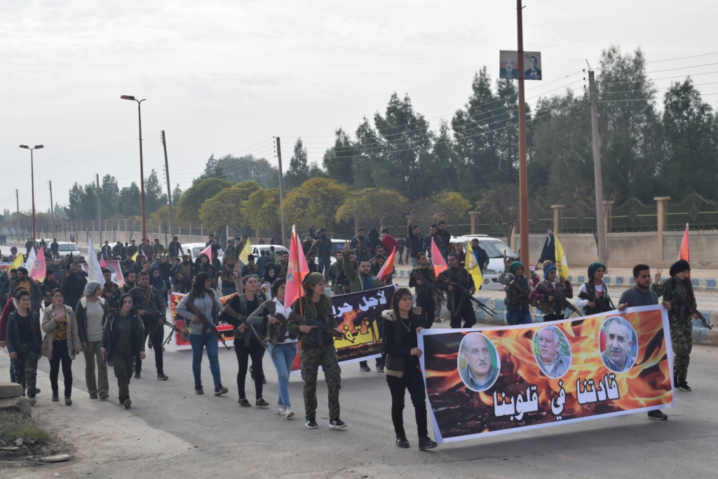 Elem bulvarında başlayan yürüyüş Qefes bulvarına kadar devam etti. Gençler ellerinde “Kadın Özgürlüğü İçin Başkaldır”, “Önder Apo İçin Başkaldır” pankartlar ve bayraklarla yürüdü.