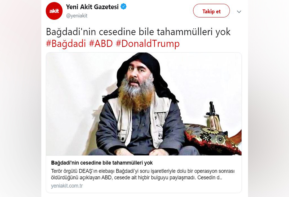 Çukur Medya Sözcüsü Yeni Akit, Daiş Çetebaşı Ebubekir el Bağdadi’nin öldürülmesi ile ilgili şöyle haber geçti: