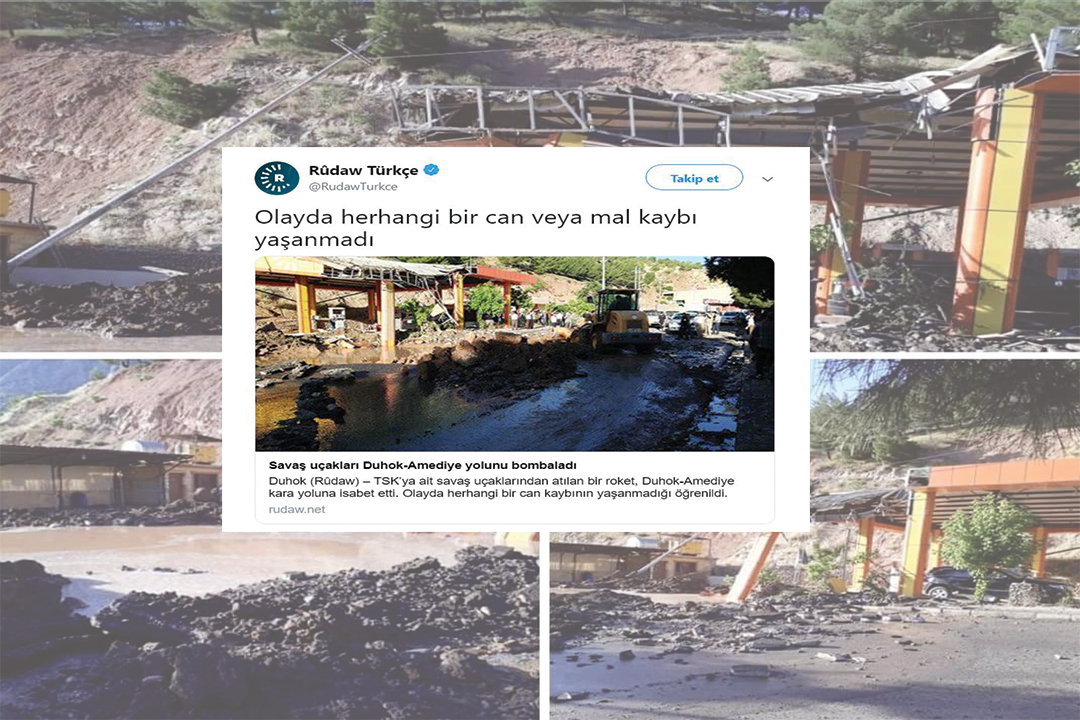 İşgalci Türk devletinin Amedîye saldırısını, Akp’nin Başurê Kurdistandaki çukur medya görevini üstlenen Rudaw TV resmi Twitter hesabında servis ettiği haberde “Olayda herhangi bir can veya mal kaybı yaşanmadı” başlığıyla duyurdu. İşgalci Türk devletinin Başurê Kurdistan topraklarını saldırısını işgal olarak görmeyen Rudaw sivil yerleşim yerlerinin bombalanmasını da sıradan bir “Olay”mış gibi lanse ediyor.