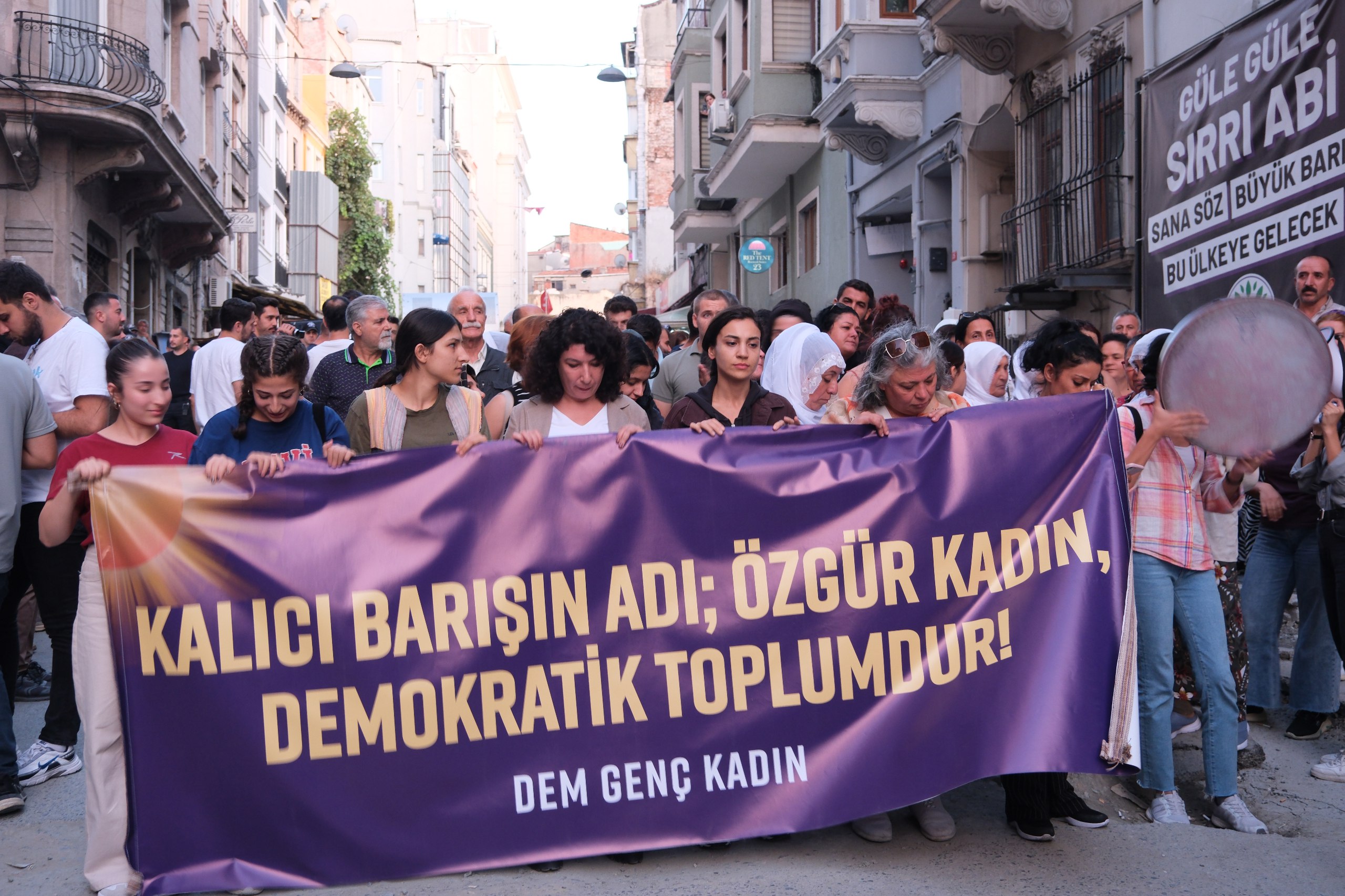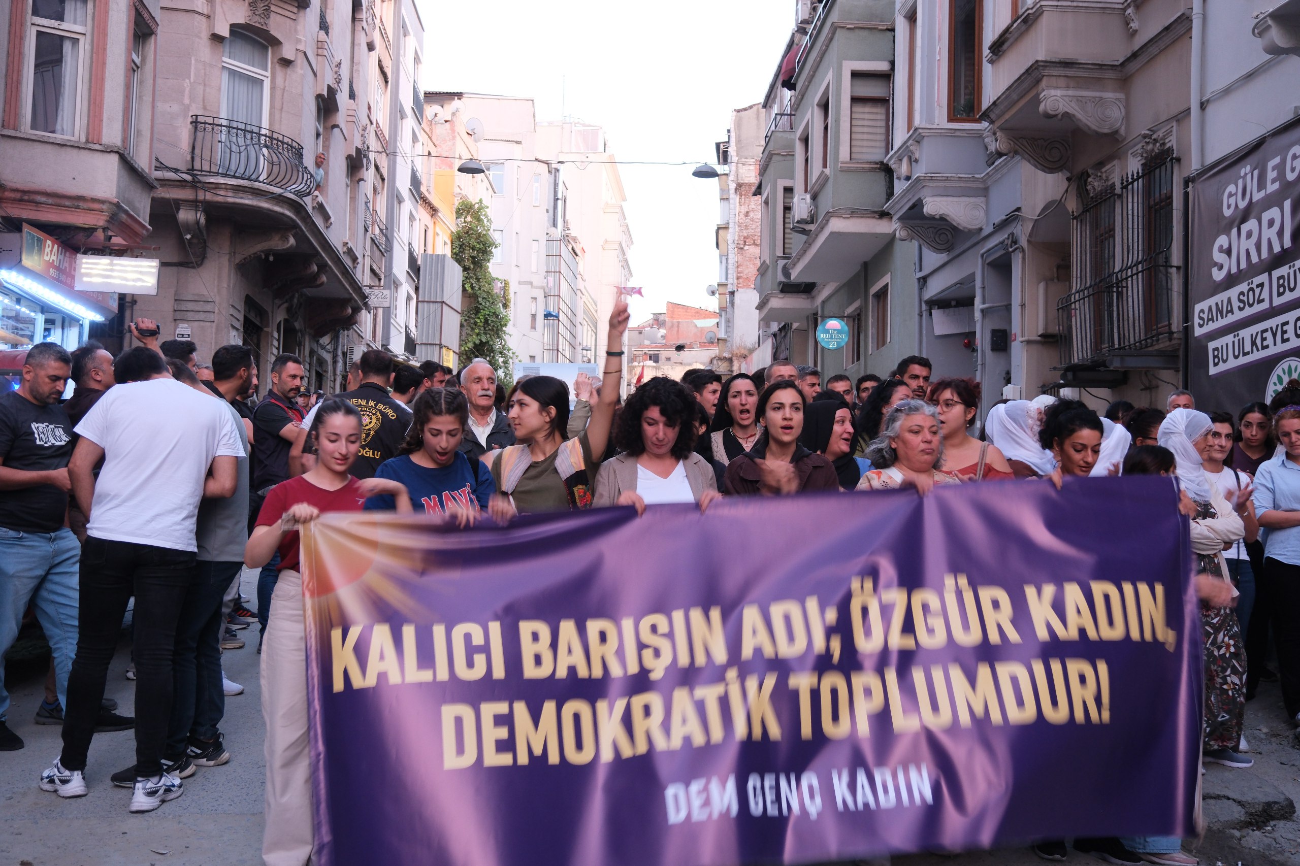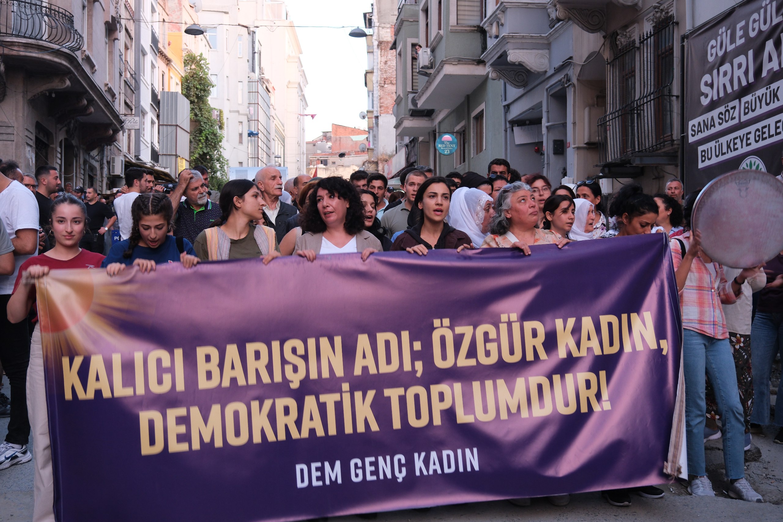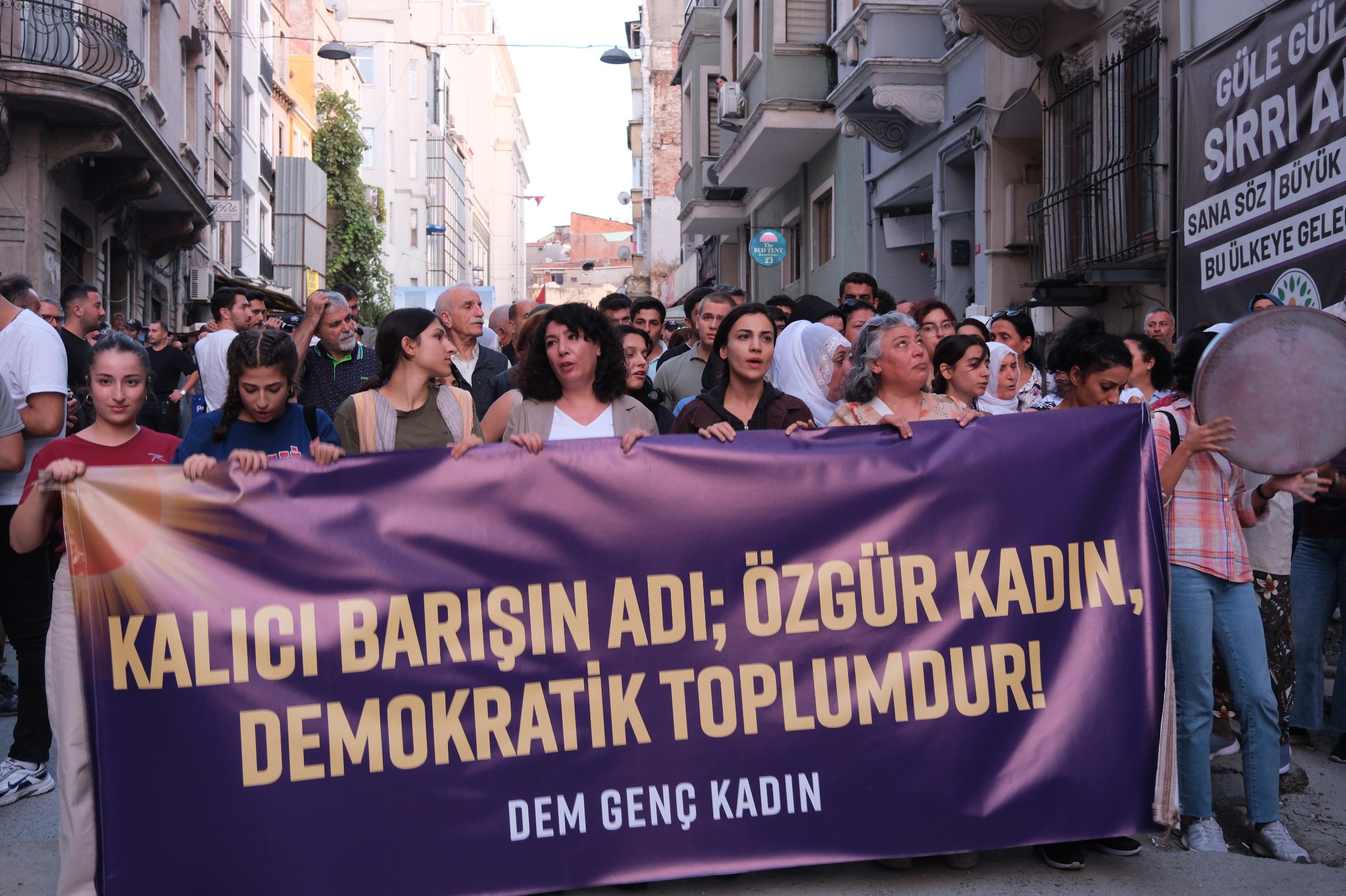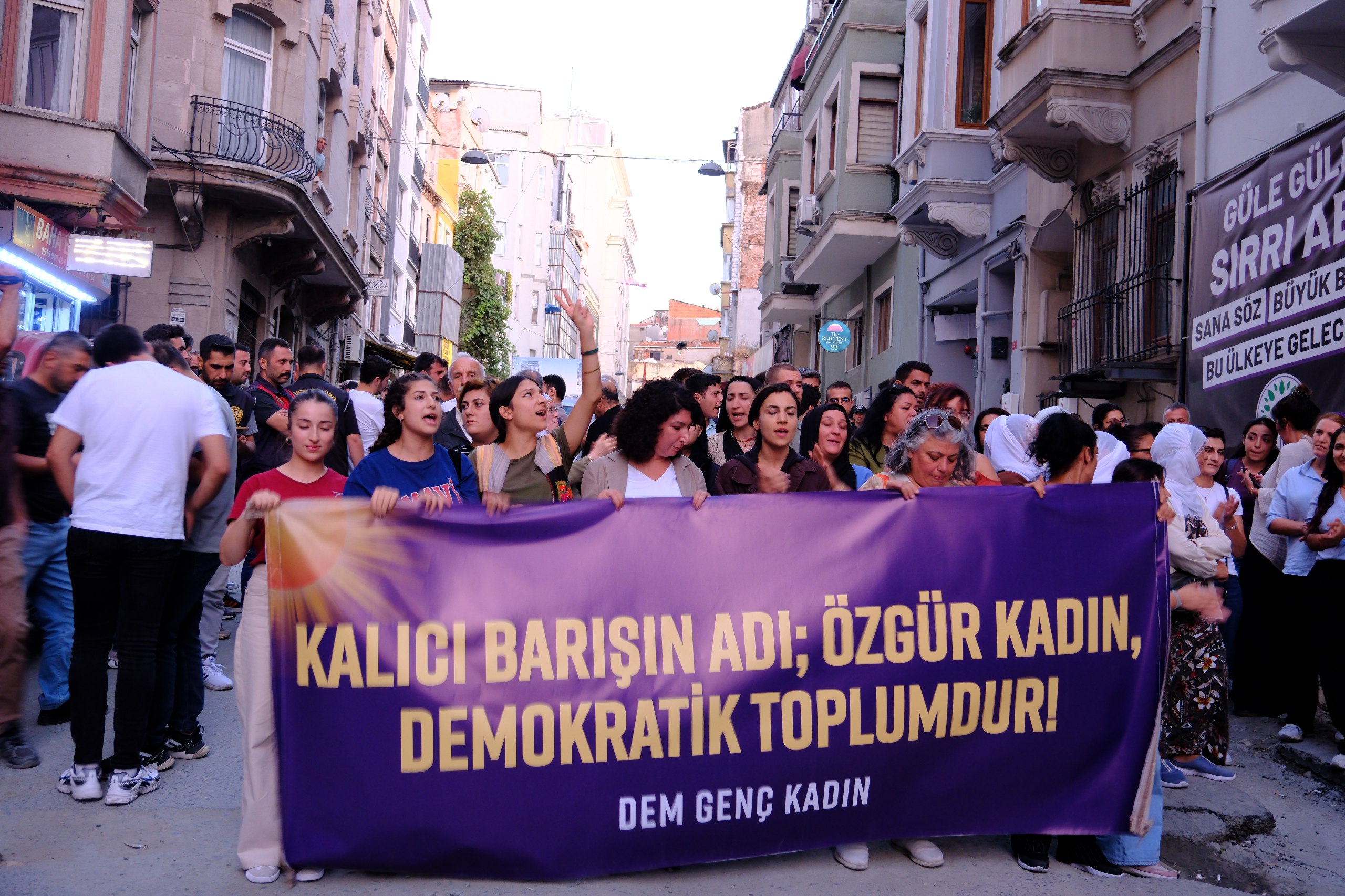 İSTANBUL – Halkların Eşitlik ve Demokrasi Partisi (DEM Parti ) Genç Kadın Meclisi, 1 Eylül Dünya Barış Günü vesilesiyle “Sosyalist yaşamda ısrar ediyoruz özgür önderlikle örgütleniyoruz” şiarıyla Taksim’de bulunan Dolapdere Güneş Dayanışma Evi önünde şölen gerçekleştirmek için DEM Parti İstanbul il binası önünde bir araya geldi. Buradan yürümek isteyen kadınlara polis engel oldu. Bunun üzerine kadınlar il binası önünde açıklama gerçekleştirdi. Açıklamada, “Kalıcı barışın adı özgür kadın demokratik toplumdur” pankartı açıldı. Açıklamada kadınlar “ Bijî Serok Apo”, “ Jin jiyan azadî”, “Bijî berxwadane ciwane”, “Savaşa hayır barış hemen şimdi” sloganları atıldı.