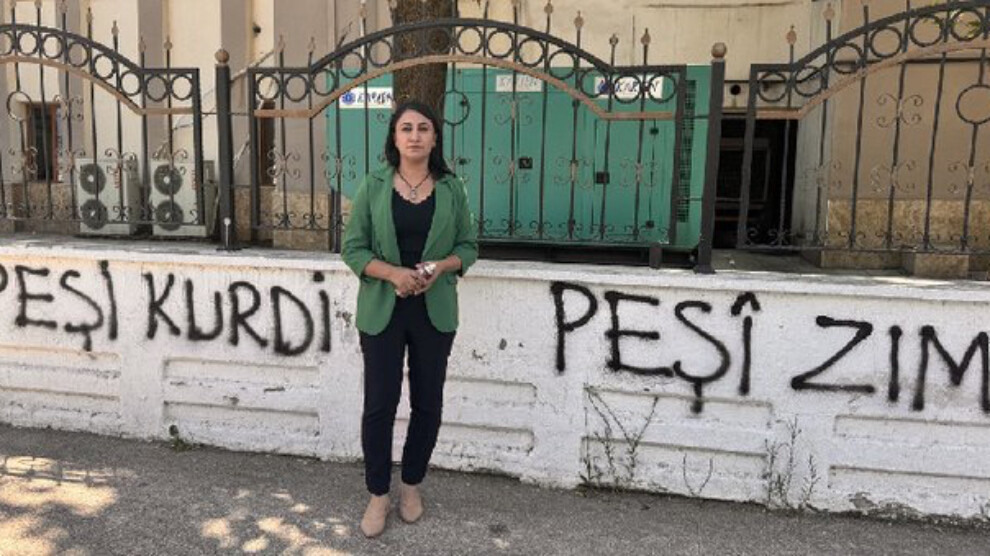 DEM Parti Milletvekili Zeynep Oduncu, yaya geçitlerindeki Kürtçe uyarıların silinmesine tepki olarak, Êlih’te valilik duvarına “Pêşî Kurdî pêşi ziman (Önce Kürtçe, önce dil)" yazdı.