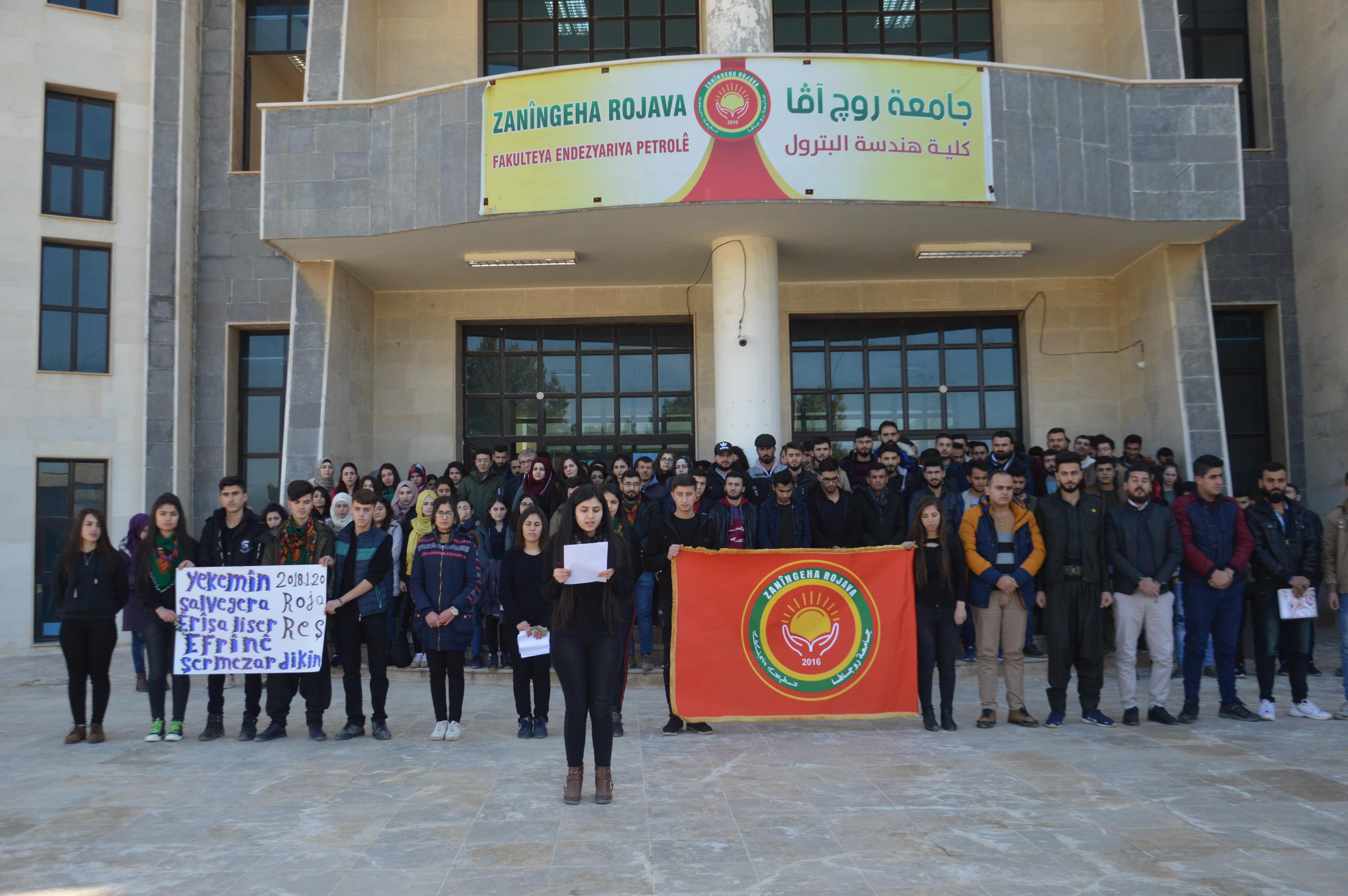 GİRKÊ LEGÊ – İşgalci Türk devletinin ve ona bağlı çete gruplarının Efrîn’e yönelik işgal girişim saldırıları 1. yıl dönümünde Rojava ve Kuzey Suriye kentlerinde protesto edilirken, Demokratik Öğrenci Hareketi de Rojava Üniversitesi’nde bir bası açıklaması yaptı.