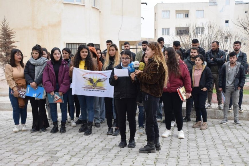 Kürt Dili ve Edebiyatı bölümü öğrencisi Narîn Ednan Şêx Bozan tarafından okunan açıklamada, “İşgalci Türk devleti sivil yerleşim alanlarını bombalıyor. Saldırılarda 10 yurttaş şehit oldu, 5 okul tamamen yıkıma uğradı. Binlerce öğrenci ise eğitimden mahrum kaldı” denildi.