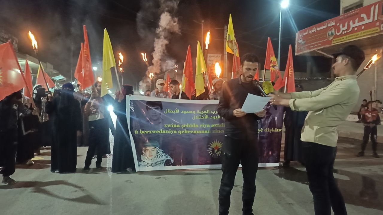 DERAZOR- Dün akşam saatlerinde Devrimci Gençlik Hareketi öncülüğünde Derazor kentinin doğusundaki Hacin ilçesinde Kahramanlık Haftası’nın yıldönümü vesilesiyle meşaleli yürüyüş düzenledi. Yürüyüşe Derazor gençlerinin yanı sıra bölge halkı da katılım gösterdi. Gençler, yürüyüş boyunca ellerinde Önder APO filemalarıyla sık sık “Bijî Serok APO” ve “Şehîd Namirin” sloganları attı.