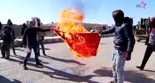 Dêra zor’da Efrin’e işgal saldırıları yıl dönümünde alanlara çıkan gençler TC bayrağını yaktı.