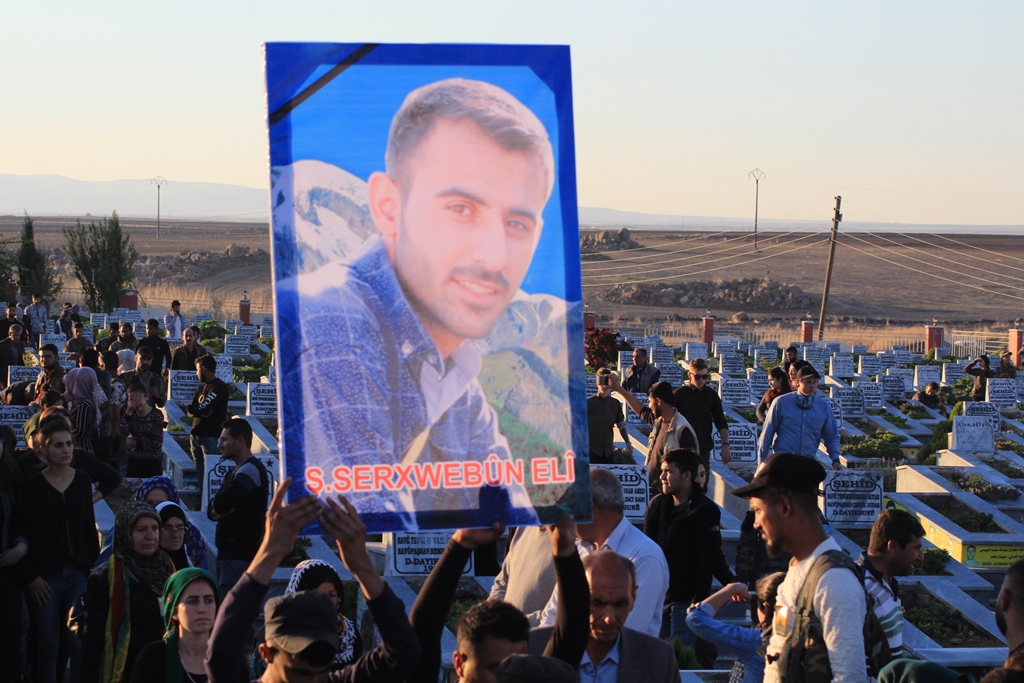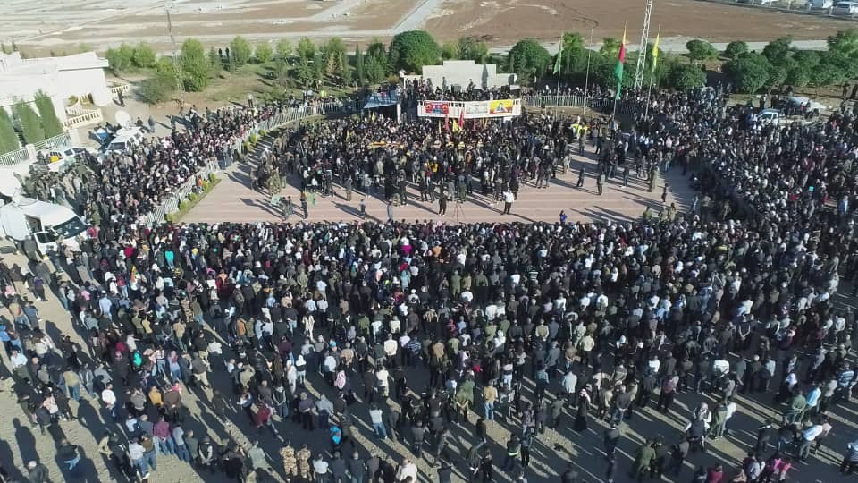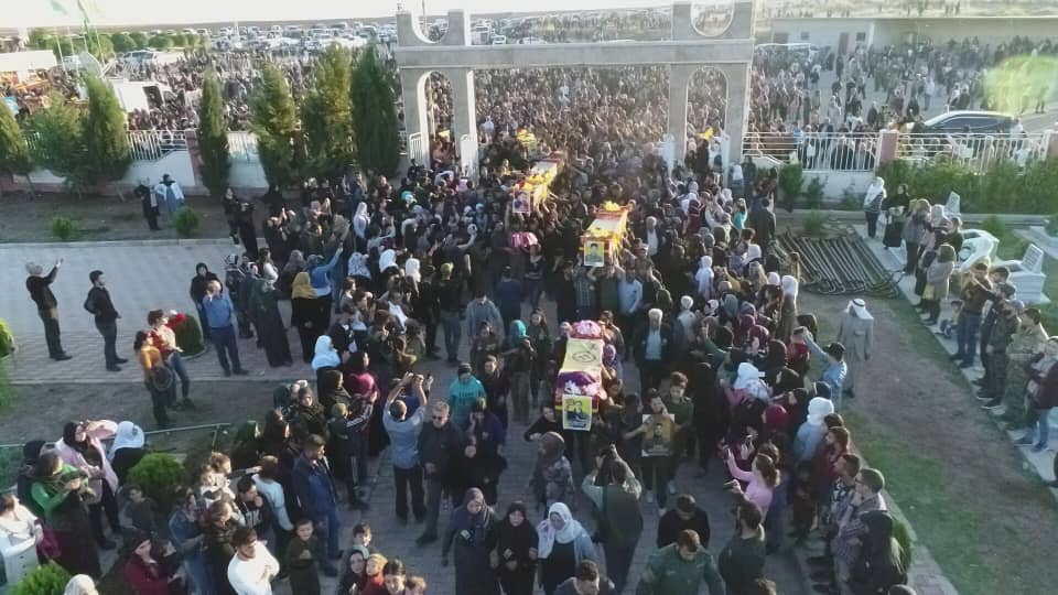 DÊRİK – Cenga Rojava Direnişi’nde şehit olan QSD savaşçıları Ebdulselam Hesen (Harûn Çiya), Sefqan Mûsa (Sefqan Dêrik), Masûm Mecid(Botan), Melik Mihemed (Botan Ceger), Sabrî Ebdulrehman (Xebat Dêrik), Besil Şawêş (Mîtan Qehreman), Îbrahîm Hesen (Egîd Dêrik), Ridwan Mihemed (Kortayî Amed), Rohlah Tirnsa (Şahan Melekşah), Cîhan Atîk (Bahoz), Özge Aydin(Ceren Güneş), Umran Fêrnta( Yasîn Aydin), Gûzel Altunuz(Aynur Ada) ve Türkiye-Rusya devriyesinde şehit olan Serxwebûn Elî için Dêrik’te bulunan Şehîd Xebat Şehitliği’nde görkemli bir uğurlama töreni düzenlendi. Şehîd Hogir Hastanesi’nden şehitlerin cenazesini alan kitle Şehîd Xebat Şehitliği’ne doğru yola çıktı.