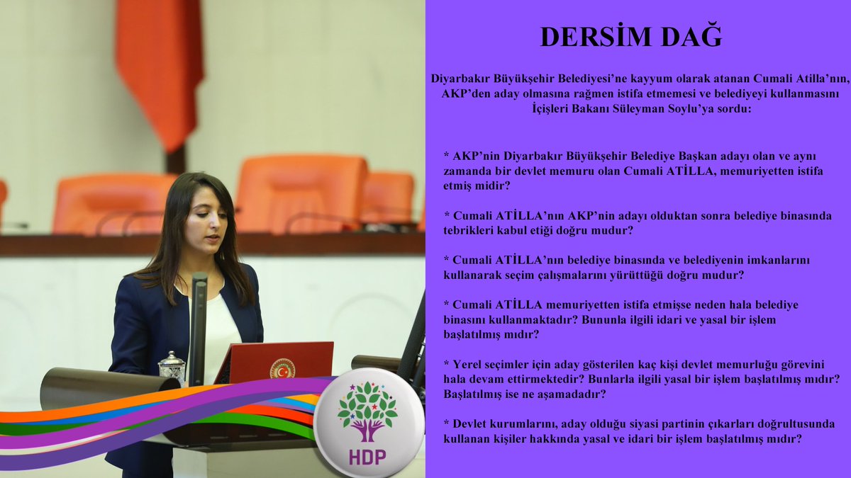 HDP Amed milletvekili Dersim Dağ, AKP’nin aday olarak gösterdiği Amed Büyükşehir Belediyesi kayyumu Cumali Atilla’nın belediyede tebrikleri kabul ettiğini hatırlatarak, hukuki statüsünü İçişleri Bakanı Süleyman Soylu’ya sordu.